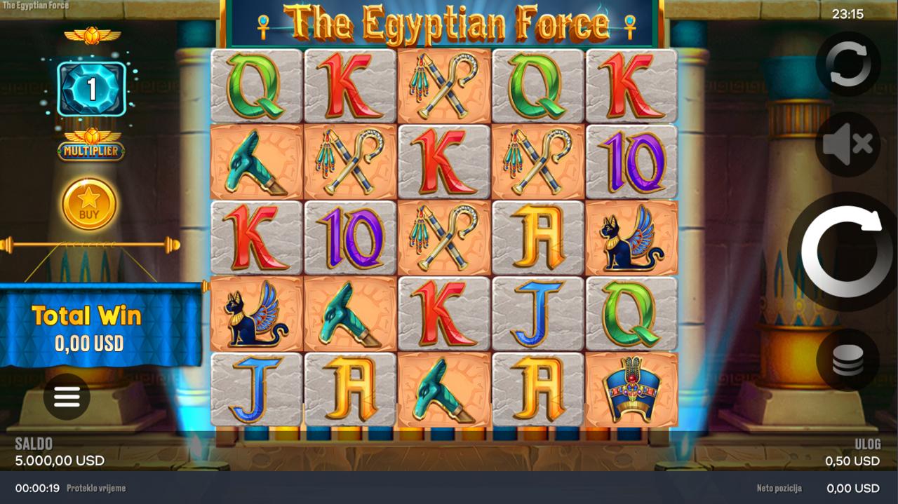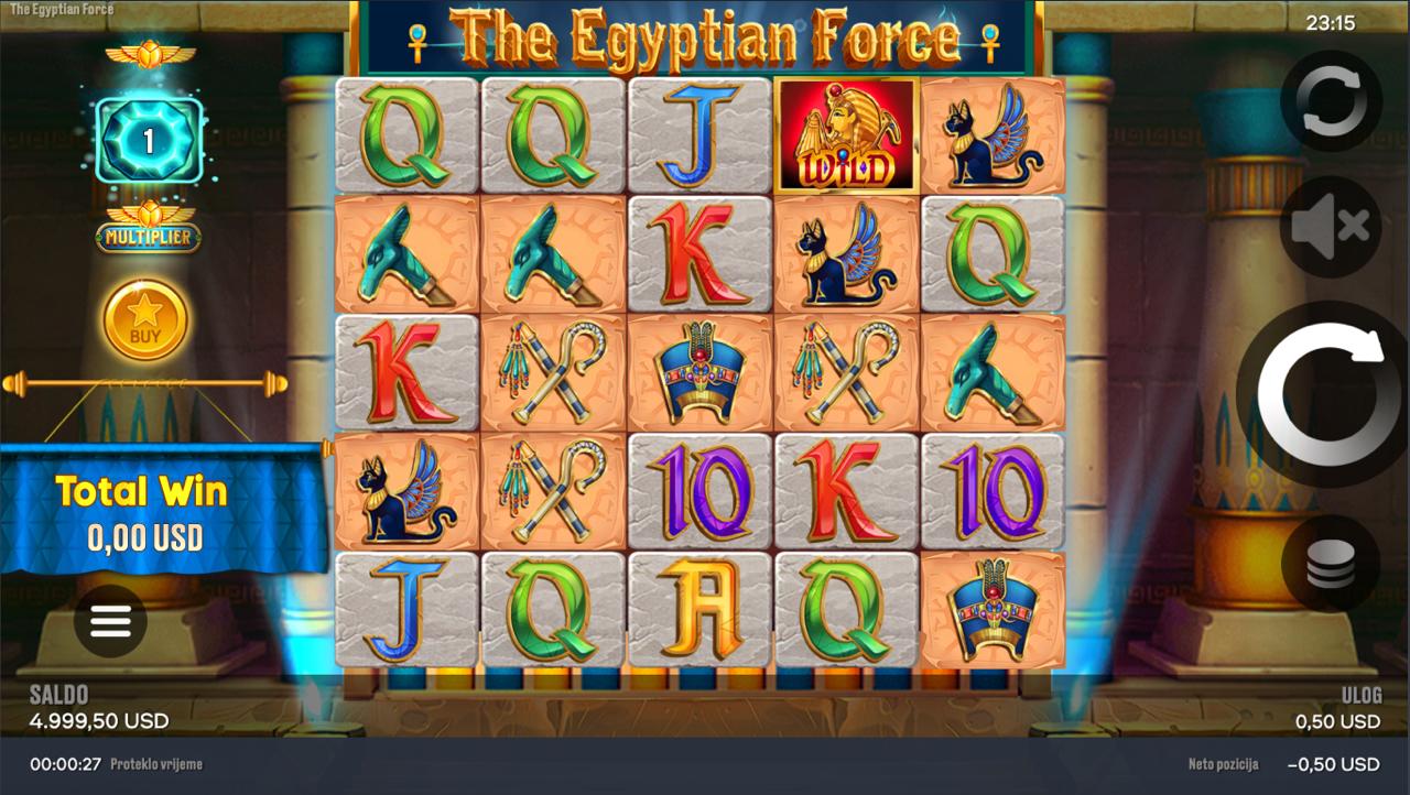 The Egyptian Force igra se na 5 rola, a cilj je složiti iste simbole na aktivnim linijama, počevši s lijeve strane, kako bi se ostvarili dobitci. Simboli inspirirani egipatskim motivima — poput bogova, skaraba i drevnih simbola — donose razne razine nagrada, dok jasna pravila omogućuju brzo i intuitivno igranje. Postavi svoj ulog, zavrti role i prepusti se moćnoj atmosferi drevnih civilizacija punoj dobitaka!