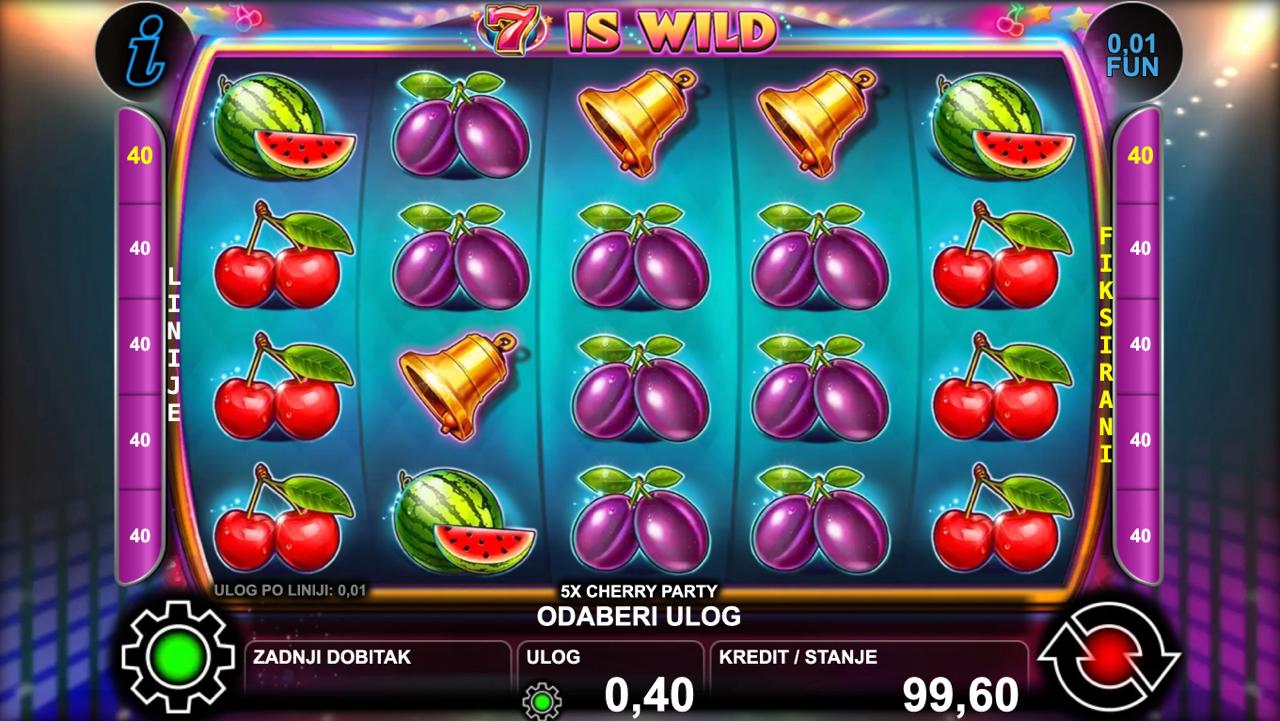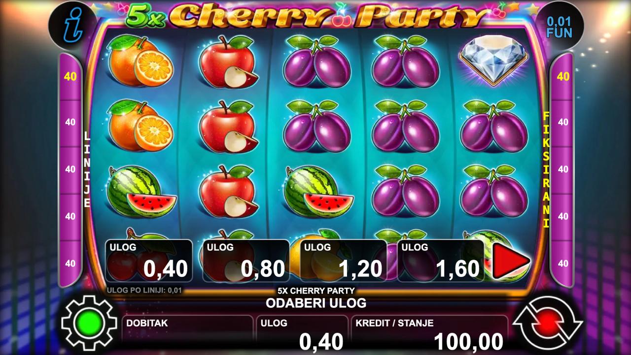 Dobrodošli u retro voćkasti svijet pun brzih okreta i slatkih simbola! 5X CHERRY PARTY dolazi od providera Oryx i nudi klasičnu voćkastu slot igru s prepoznatljivim simbolima trešanja, zvona i sedmica. Minimalni ulog iznosi 0,40 €, dok maksimalni iznosi 20,00 €, što igru čini pogodnom za igrače koji traže jednostavnost i stabilnu dinamiku. Igra nema jackpot, ali svaki spin donosi priliku za dobitak kroz osnovne isplatne linije. Ako preferiraš klasične slotove bez kompliciranih funkcija — 5X CHERRY PARTY je dobar izbor.