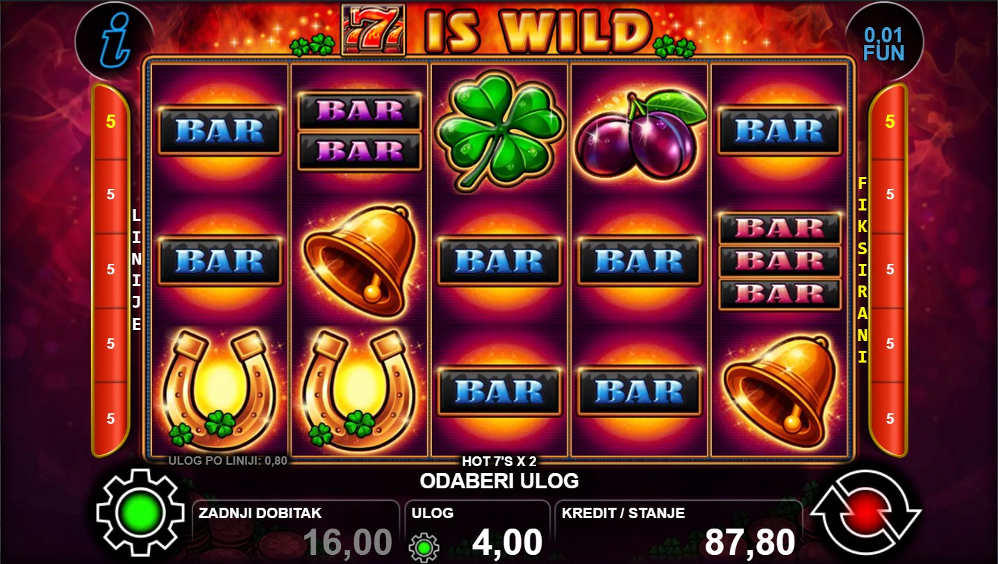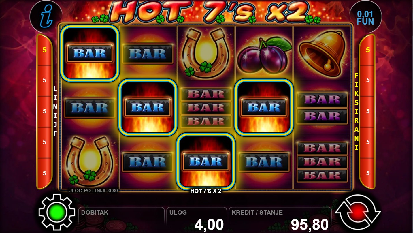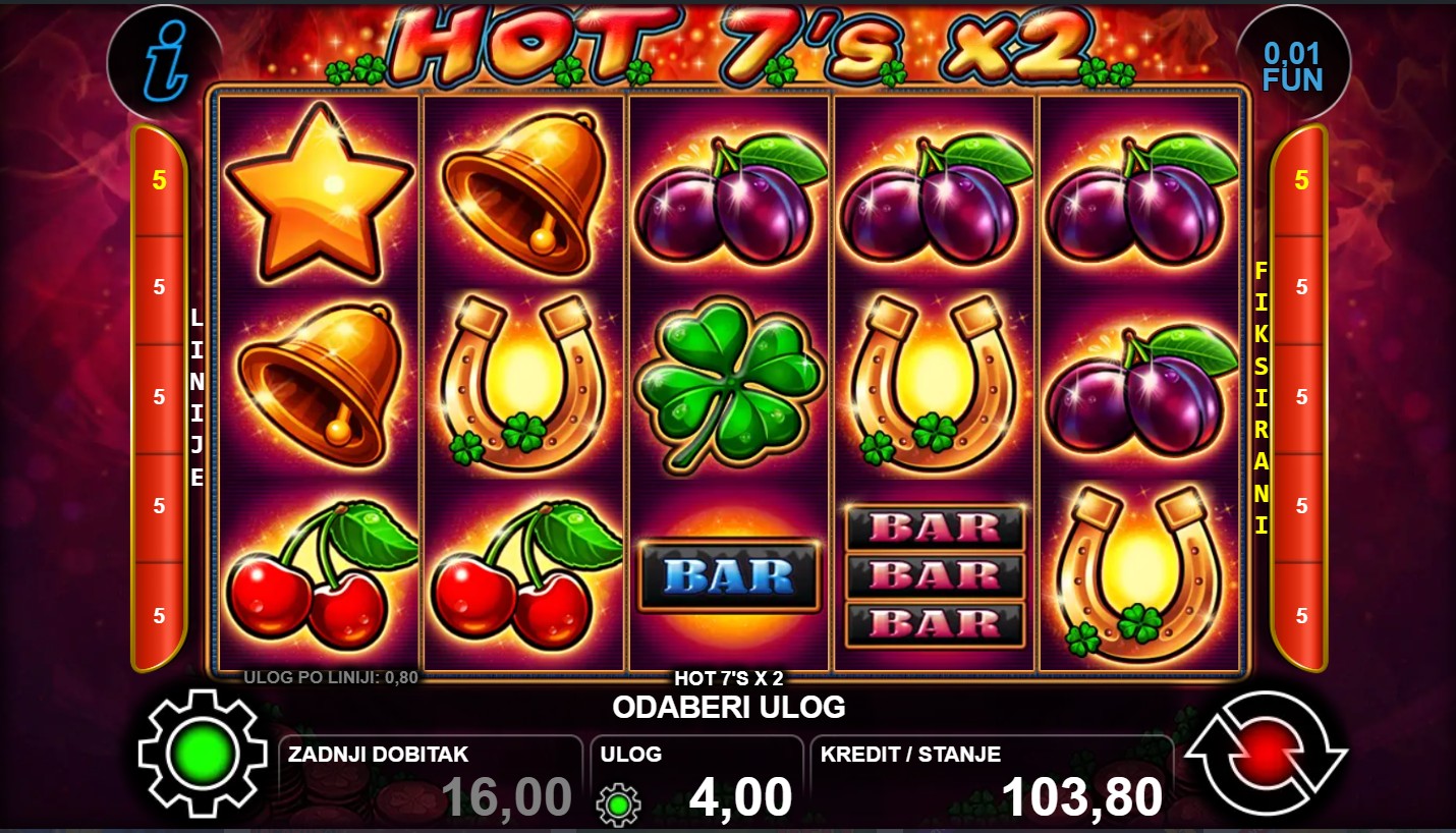 Zakorači u svijet klasičnih slot simbola s modernim uzbuđenjem uz HOT 7’s X 2, slot igru renomiranog providera CT Interactive! Ova dinamična igra donosi jednostavan, ali uzbudljiv doživljaj igranja, gdje svaki spin pruža priliku za dobitne kombinacije i dodatne funkcije koje povećavaju šanse za nagrade. Igra se odvija na 5 bubnjeva i 3 reda s 5 isplatnih linija, a kombinacija sreće i strategije čini svaki okret napetim i zabavnim. Ako voliš klasične slotove koji spajaju tradiciju i uzbuđenje, HOT 7’s X 2 je pravi izbor!