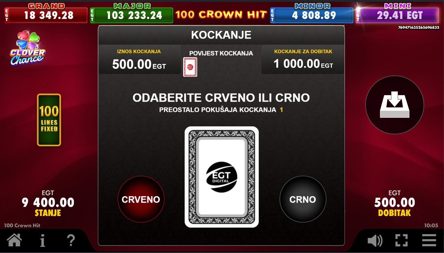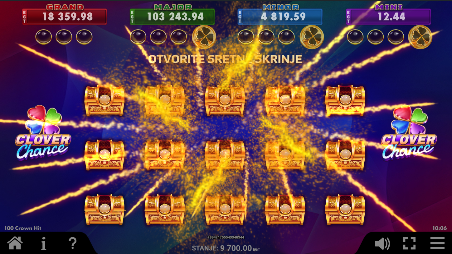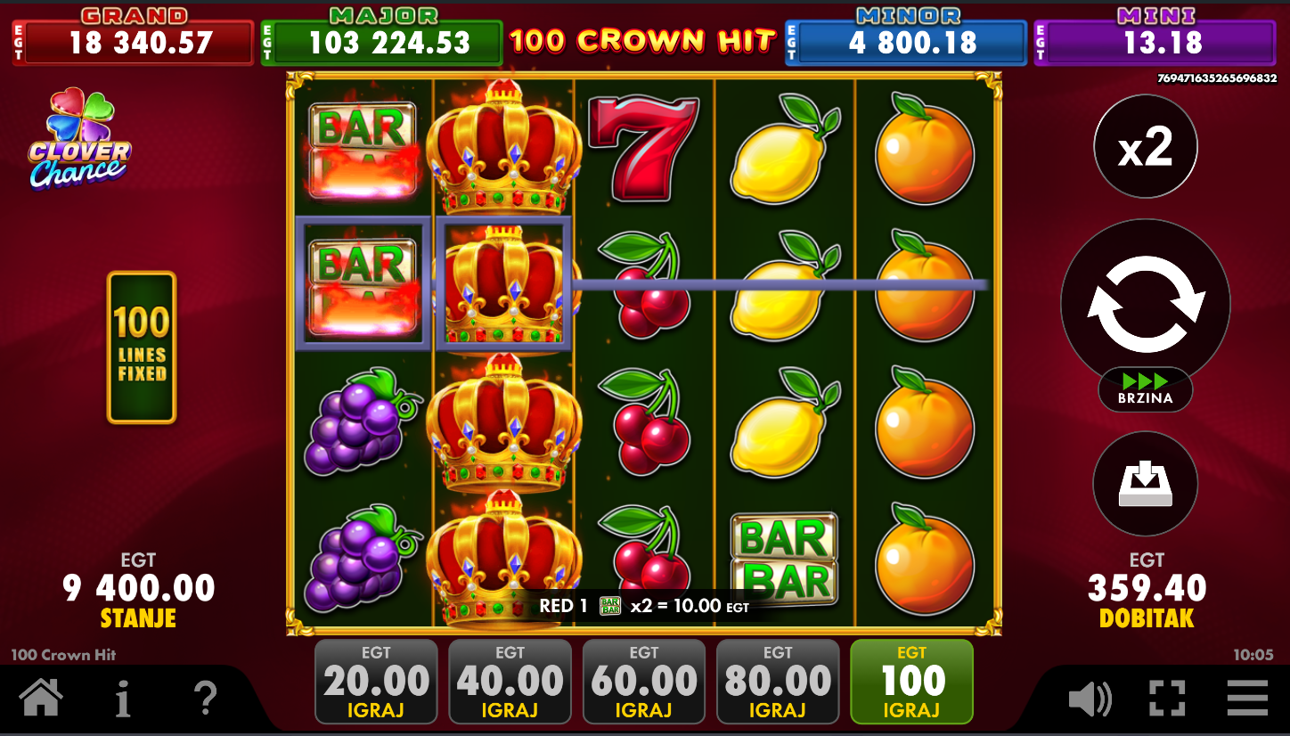 100 Crown Hit Clover Chance je kraljevski voćni slot od EGT Digital koji spaja sjaj kruna s klasičnim simbolima. Na 5 koluta i 100 linija čeka te prava gozba boja i adrenalina. Kruna ovdje nije samo ukras, ona je Wild simbol koji širi svoje moći i pomaže slagati dobitke. A dok bubnjevi vrte trešnje, šljive i lubenice, Clover Chance jackpot vreba iz prikrajka i može se aktivirati kad se najmanje nadaš.