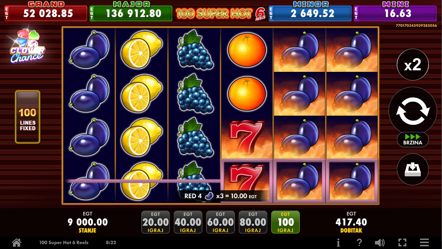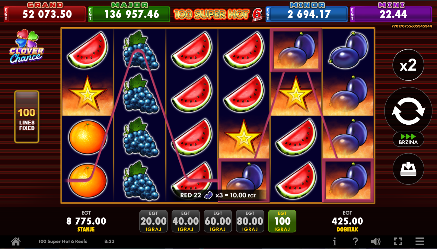 Igra se na 6 koluta i 4 reda sa 100 fiksnih isplatnih linija. Odaberi svoj ulog, pritisni Spin i gledaj kako klasično voće oživljava na ekranu. Wild simbol pomaže zamijeniti druge, dok Scatter može donijeti izdašne isplate. Clover Chance jackpot može se aktivirati slučajno i nagraditi te jednim od četiri progresivna dobitka. Jednostavno, brzo i s klasičnim šarmom koji nikad ne izlazi iz mode!