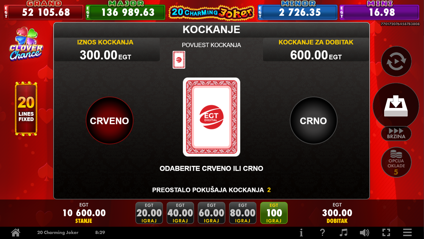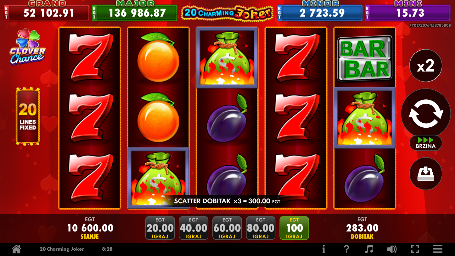 20 Charming Joker Clover Chance od EGT Digital spaja klasični slot šarm s modernim jackpot uzbuđenjem! Na 5 koluta i 20 linija očekuju te blistavi simboli, Jokerica kao Wild i Scatter koji donosi dodatne dobitke. Vizualno je šarena, dinamična i privlačna, a svaka vrtnja donosi novu dozu napetosti.