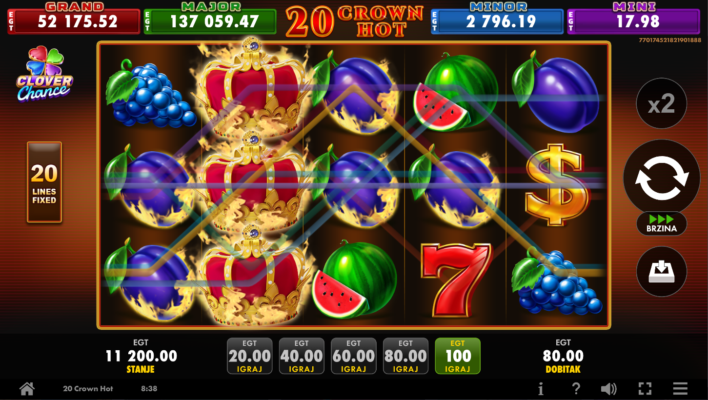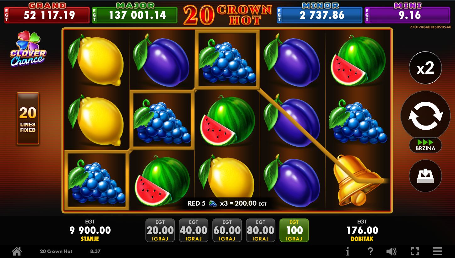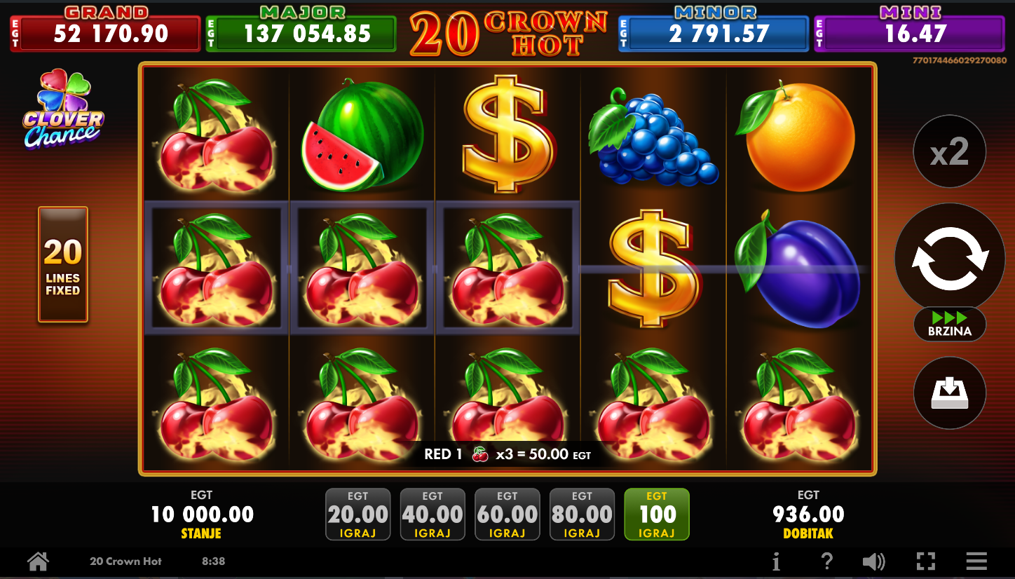 Igra se na 5 × 3 koluta s 20 fiksnih isplatnih linija. Odaberi svoj ulog, pritisni Spin i gledaj kako krune, voće i posebni simboli slete na ekranu. Wild zamjenjuje druge simbole, dok Scatteri osiguravaju dodatne nagrade. Clover Chance jackpot može se aktivirati u bilo kojem trenutku i donijeti jednu od četiri razine nagrada. Pravila su jednostavna, a uzbuđenje je zajamčeno!