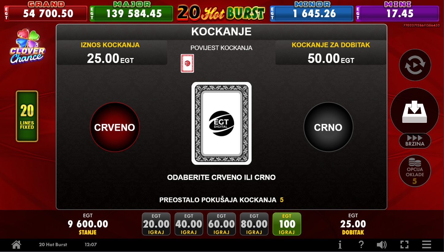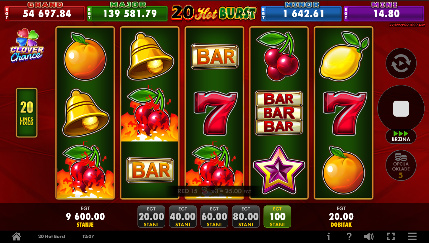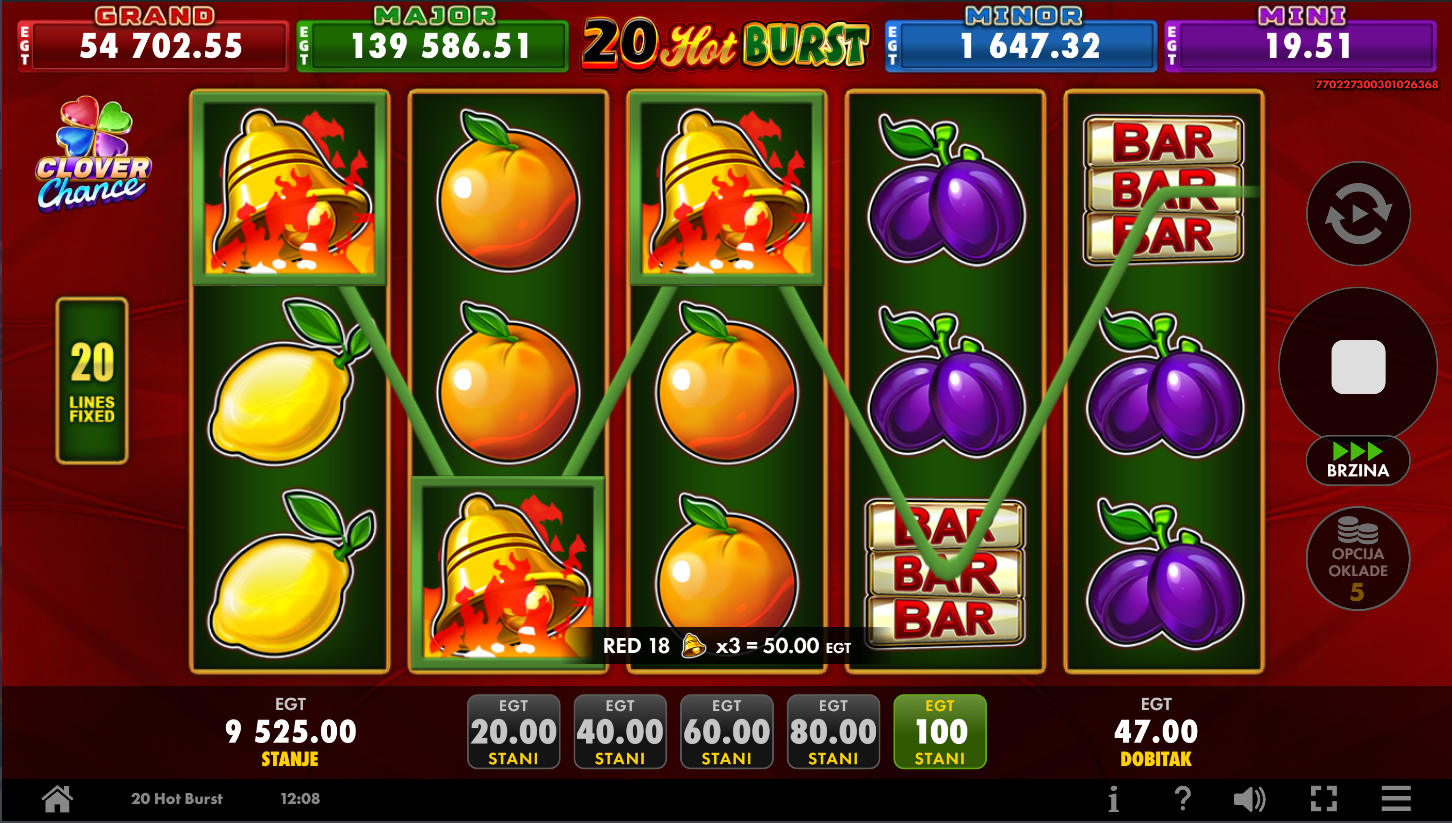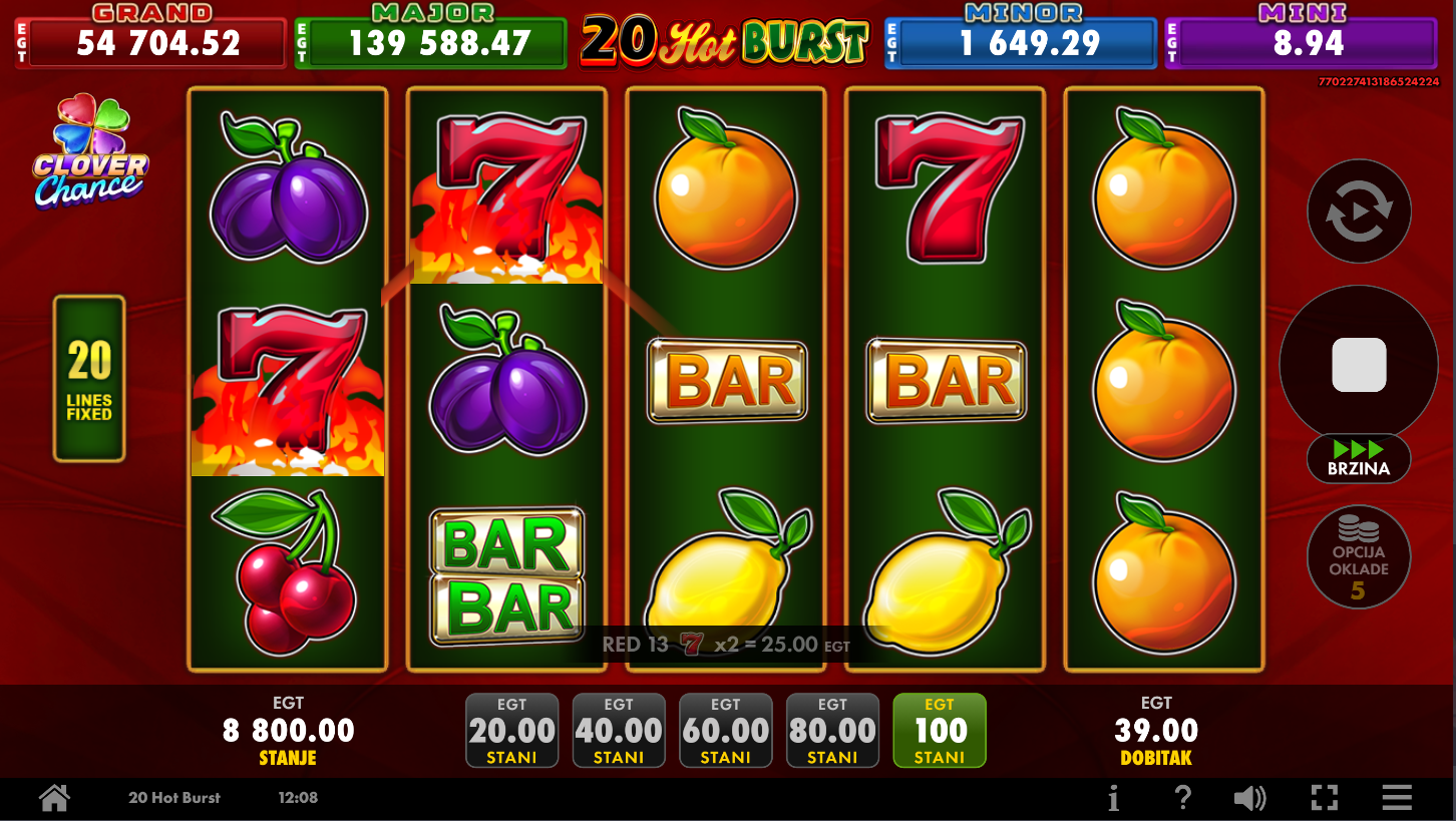 20 Hot Burst Clover Chance od EGT Digital donosi eksploziju zabave na 5 koluta i 20 linija! Voćni simboli oživljavaju kroz atraktivni Toppling Reels efekt, gdje dobitne kombinacije nestaju i stvaraju prostor za nove. Multiplikatori dodatno podižu uzbuđenje i otvaraju put do većih nagrada. Tu je i misteriozni Clover Chance jackpot koji može pasti u svakom trenutku. Ova igra spaja klasičnu tematiku i moderne mehanike u pravi vatromet dobitaka!
