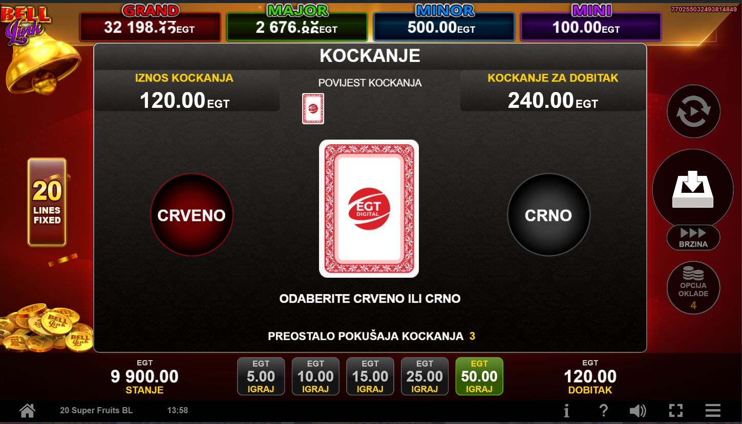 20 Super Fruits Bell Link i EGT Digital donose pravu voćnu eksploziju na pet koluta i 20 linija, gdje zvona zvone i simboli sjaje! Retro šarm križa se s modernom jackpot akcijom kroz Bell Link feature koji može pokrenuti jedan od nekoliko nivoa jackpota. Wild i Scatter simboli pojačavaju napetost svake vrtnje, dok voćni simboli i zlatne zvona obećavaju dobitke koji se pamte. Ova igra je spoj nostalgije voćnih automata i neizvjesnosti jackpot igre, svakim spinom možeš biti itekako iznenađen!