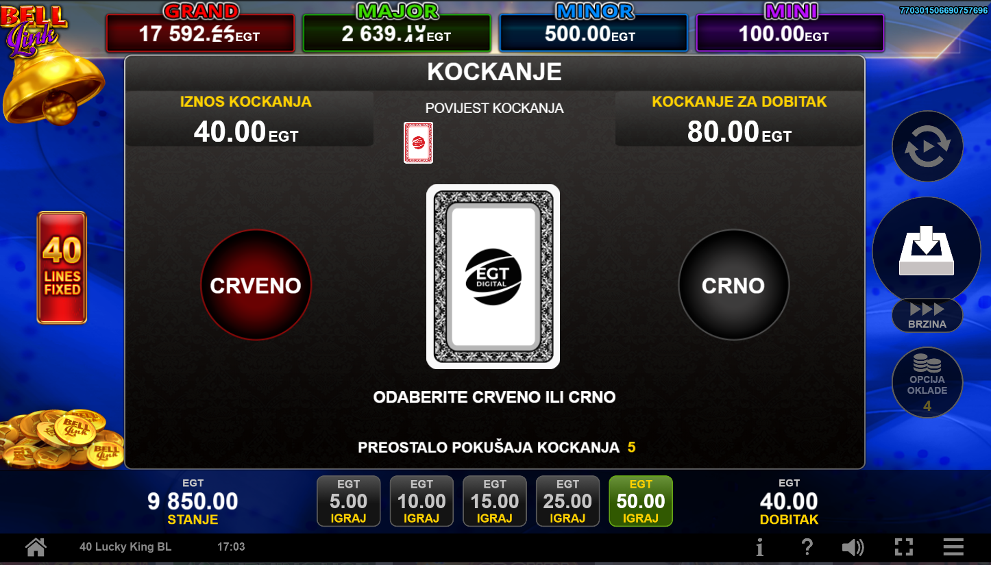 4. Koji su minimalni i maksimalni ulozi u igri 40 Lucky King Bell Link?