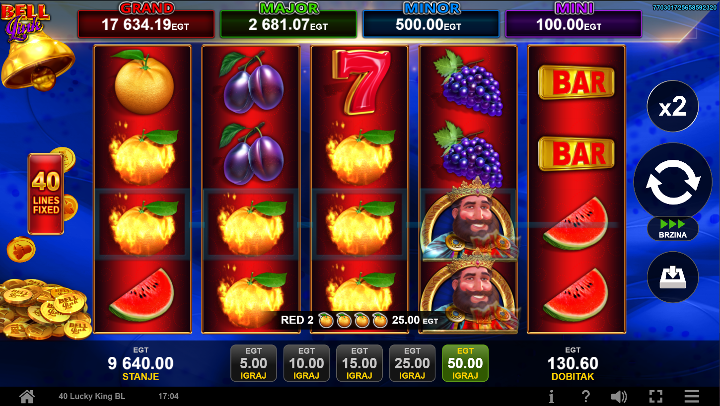 40 Lucky King Bell Link i EGT Digital donose kraljevski voćni spektakl na 5 koluta i 40 linija! Zlatne krune, zvijezde i voćni simboli svjetlucaju na ekranu, dok kralj sreće donosi moćne dobitke. Bell Link značajka može aktivirati jackpot igru s više razina i pretvoriti običan spin u pravi spektakl. Klasična voćna tema ovdje dobiva luksuzni sjaj i moderni twist. Ako voliš glamur i uzbuđenje, ova igra je pun pogodak!
