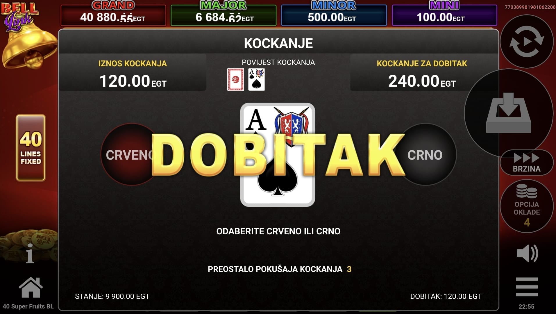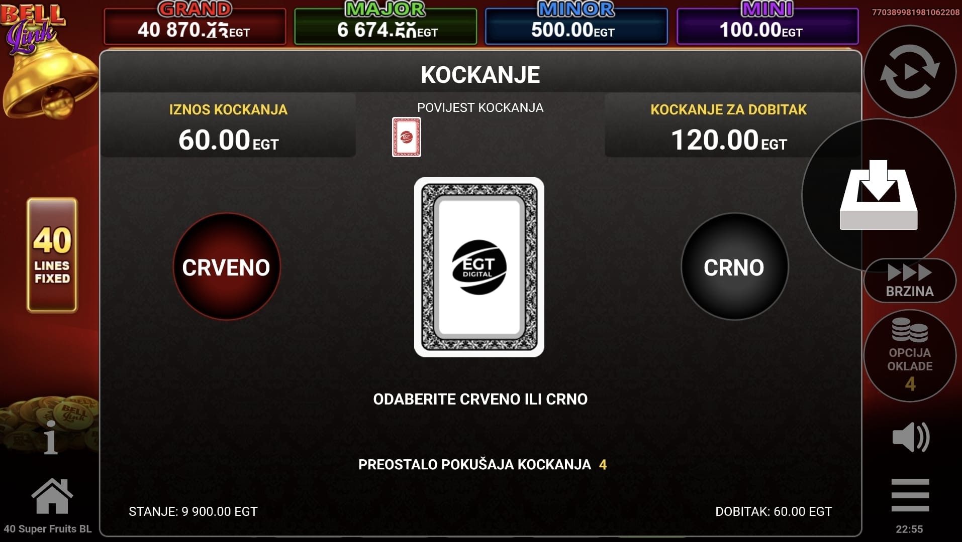 Nakon svake dobitne vrtnje, imate priliku udvostručiti svoj dobitak u značajci Klađenja pogađajući boju sljedeće karte.