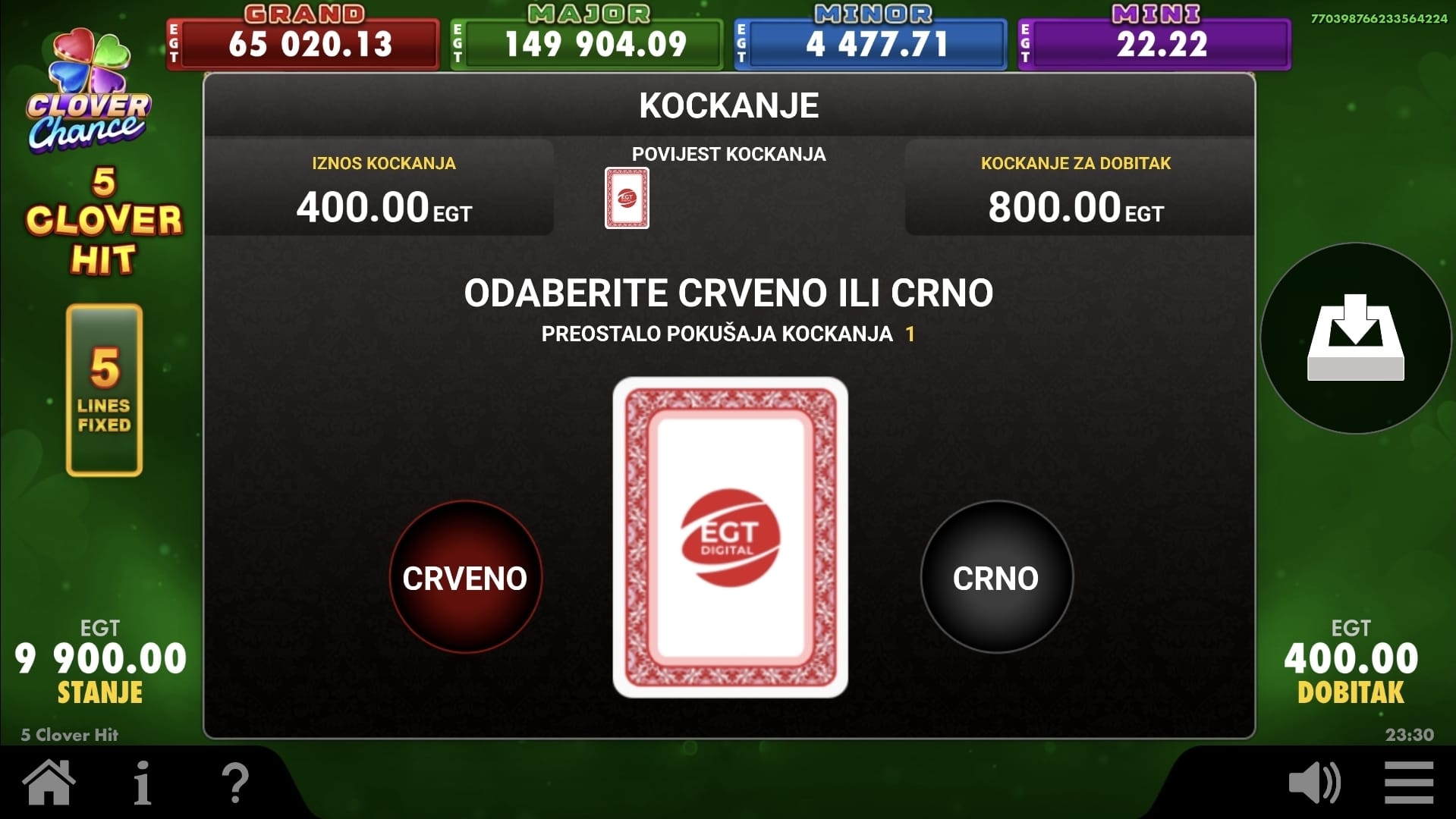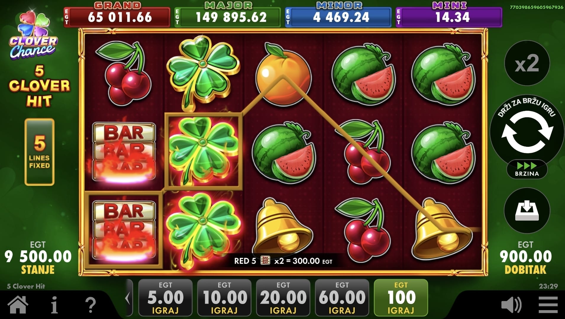 5 Clover Hit Clover Chance je šareni slot, providera EGT Digital, s 5 bubnjeva koji kombinira klasične voćne simbole s irskim motivima poput djeteline i zlatnika. Igra dolazi s funkcijom Clover Chance i nudi priliku za osvajanje jednog od četiri fiksnajackpota. Privlačan dizajn i jednostavno sučelje čine ovu igru odličnim izborom za početnike i iskusne igrače.