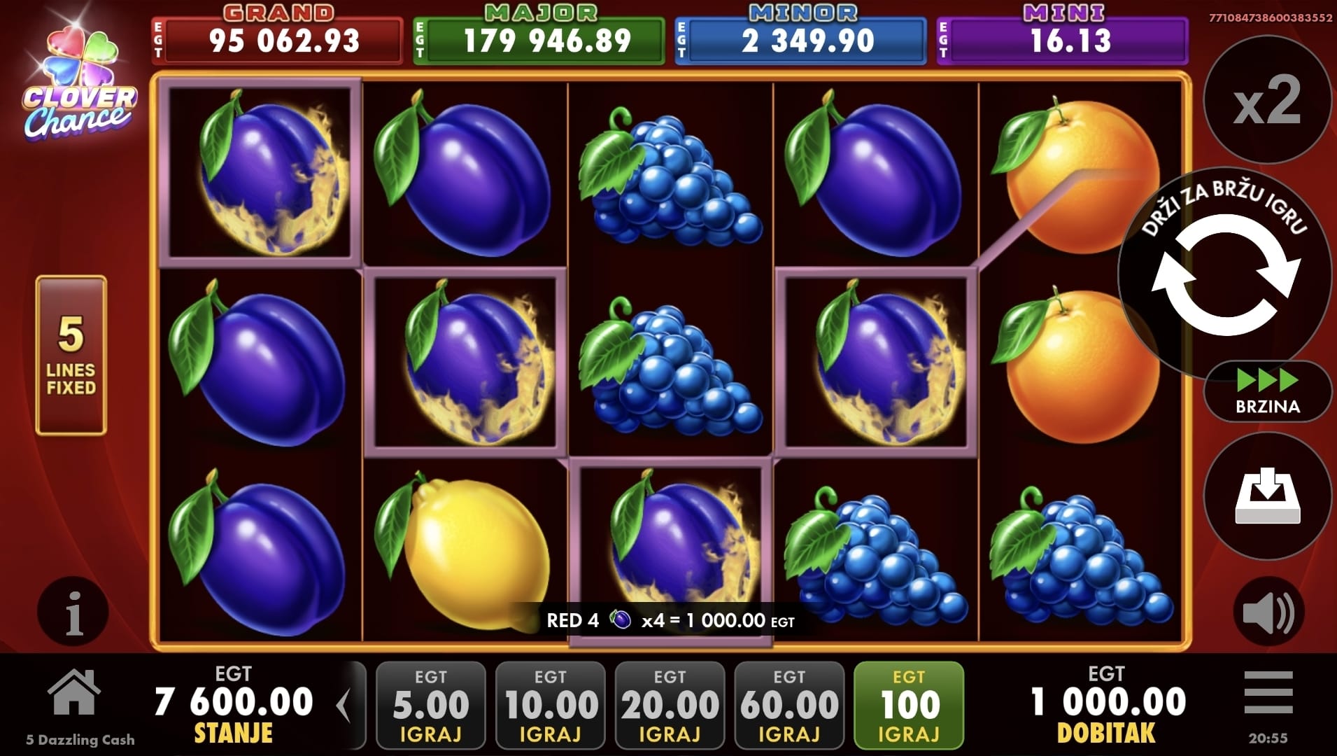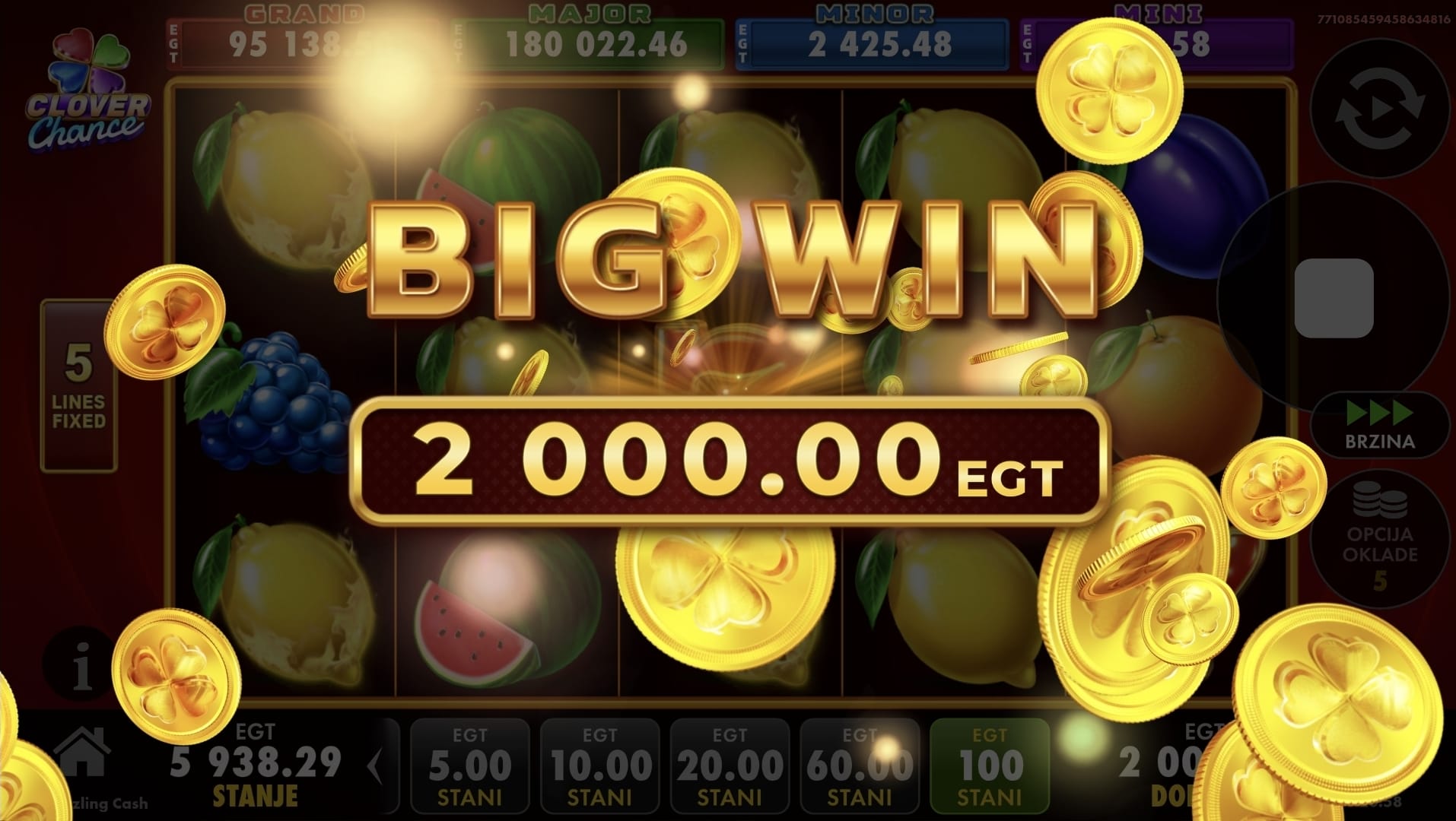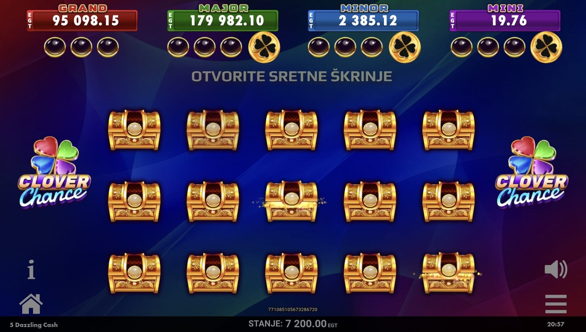Igra 5 Dazzling Cash Clover Chance ima RTP od 96,10%. Zbog prisutnosti značajke besplatnih vrtnji i dva progresivna jackpota, volatilnost ove igre je visoka.
