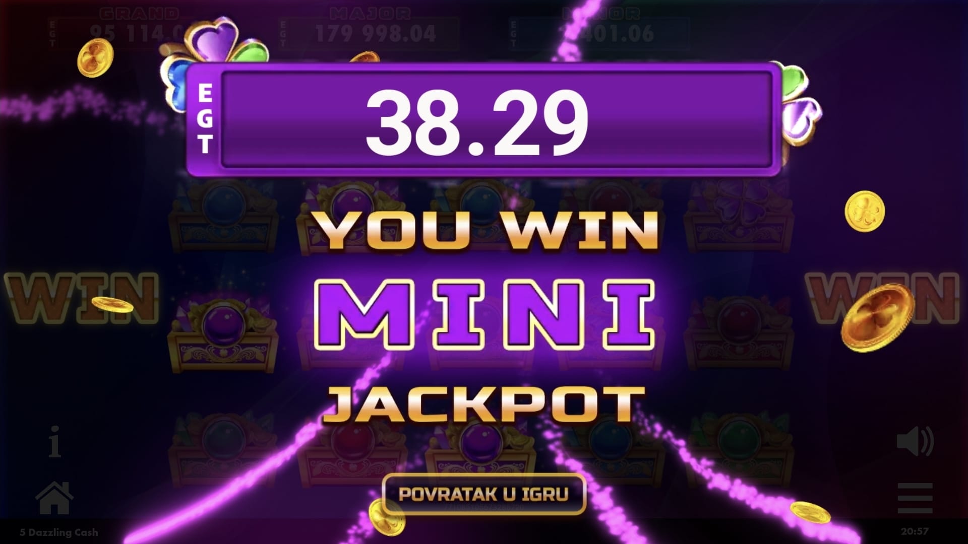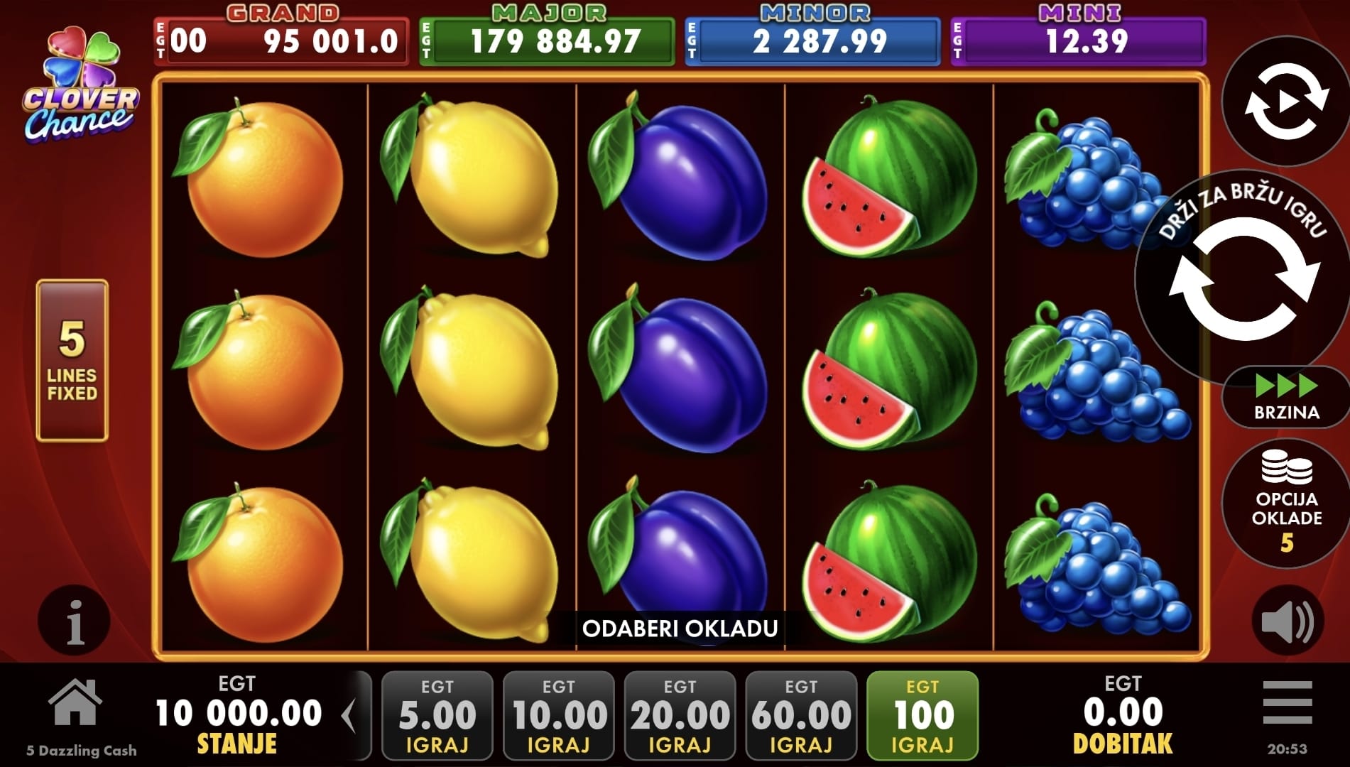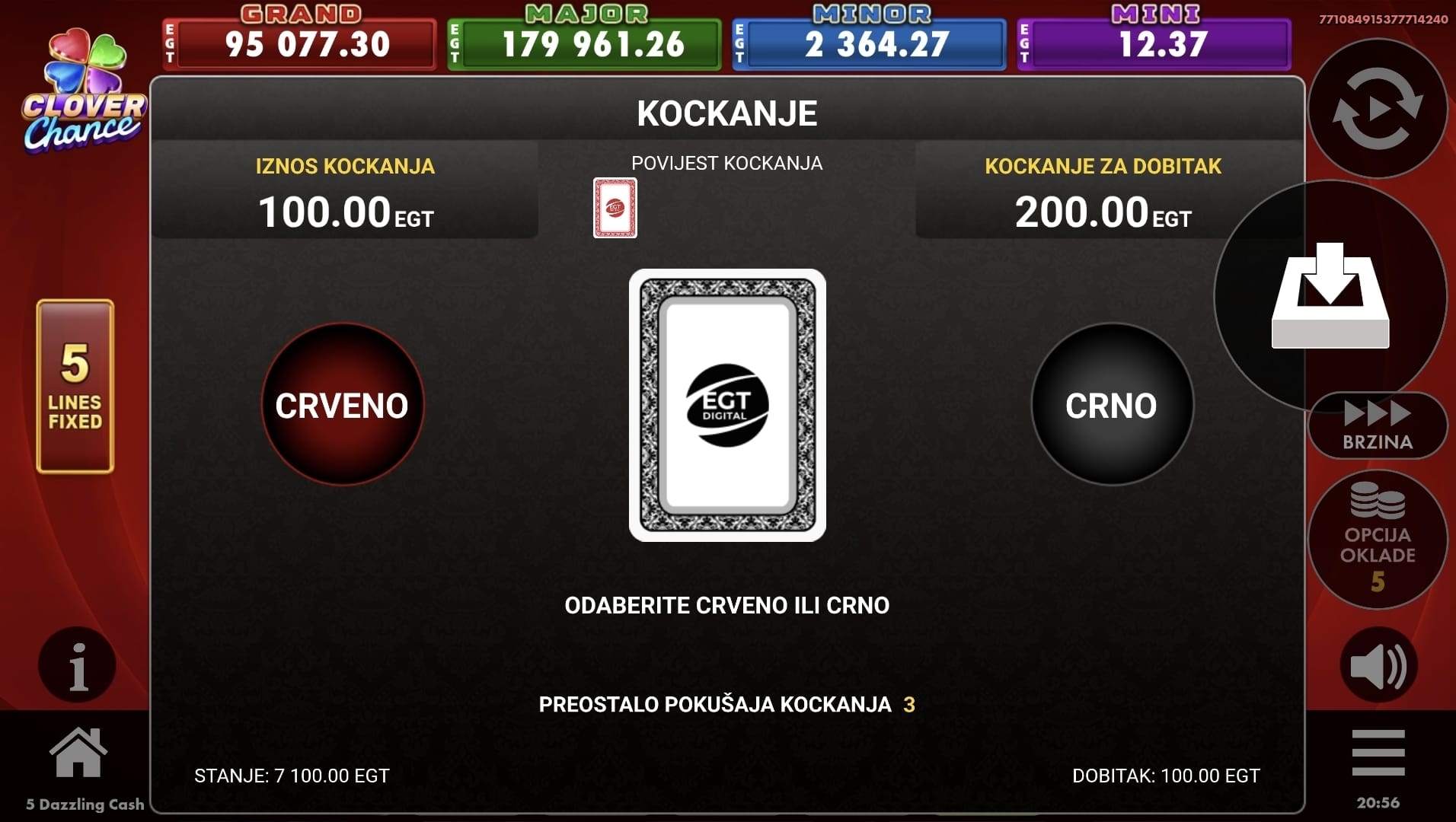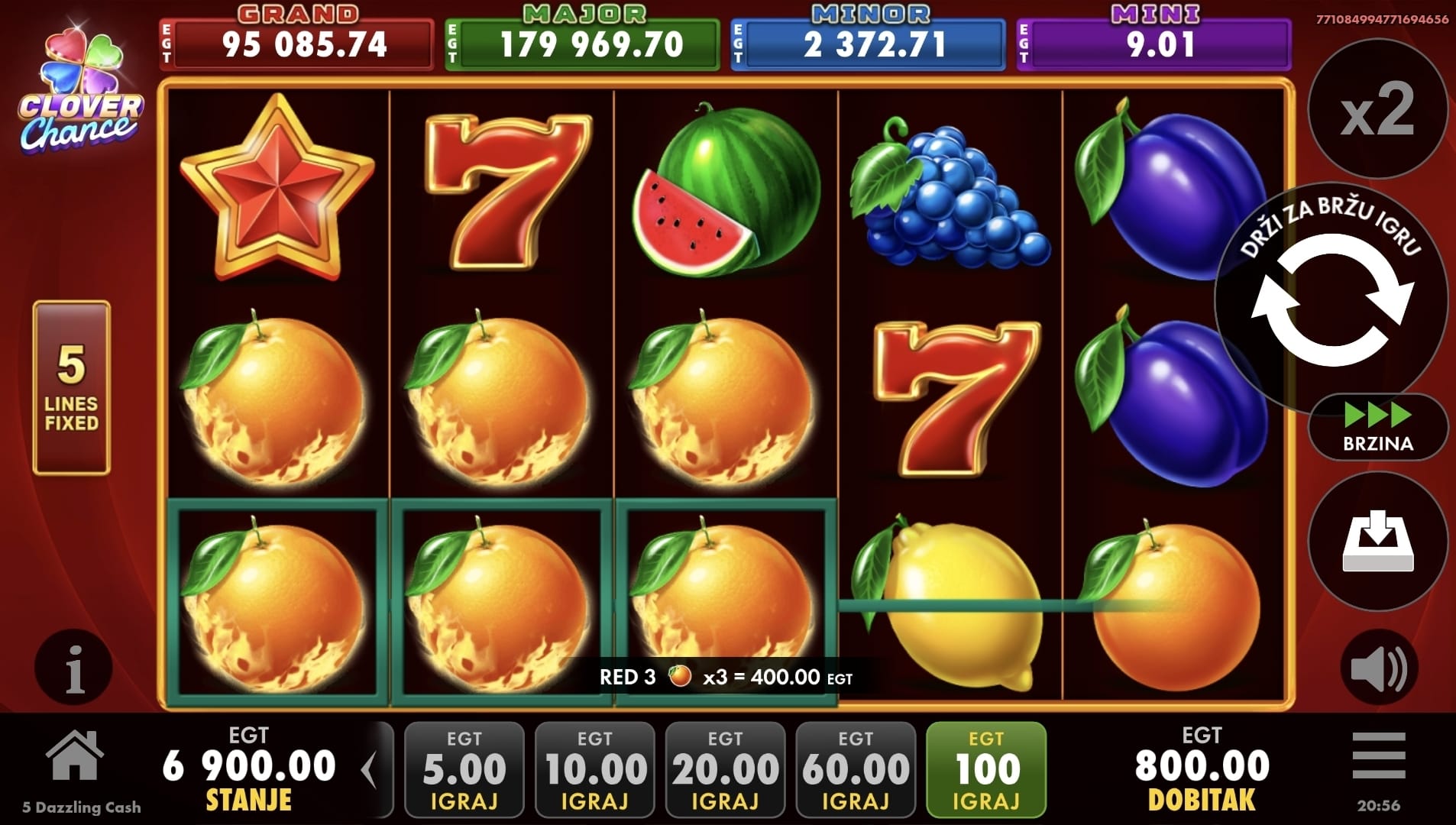 Igra 5 Dazzling Cash Clover Chance ima RTP od 96,10%. Zbog prisutnosti značajke besplatnih vrtnji i dva progresivna jackpota, volatilnost ove igre je visoka.