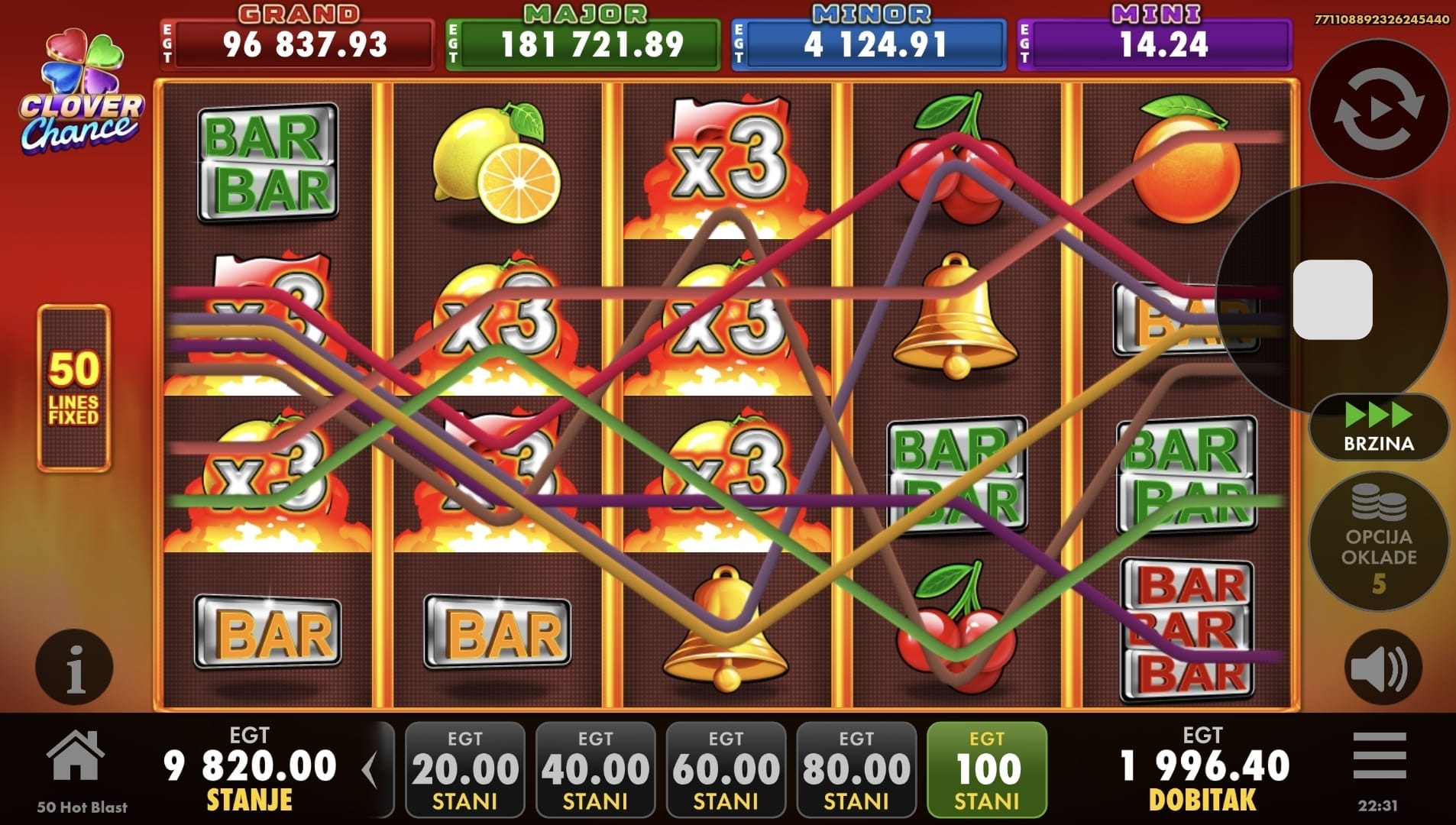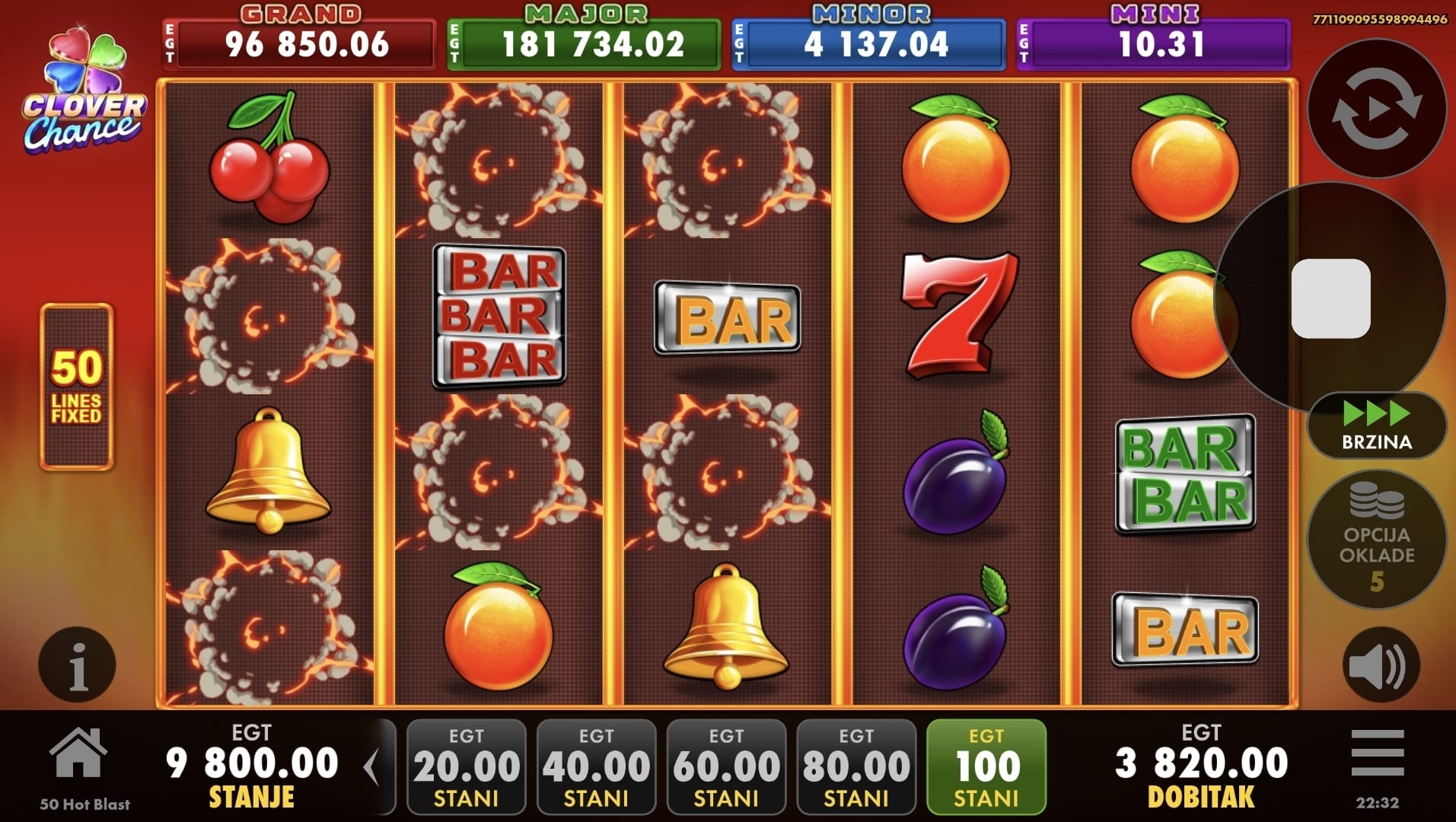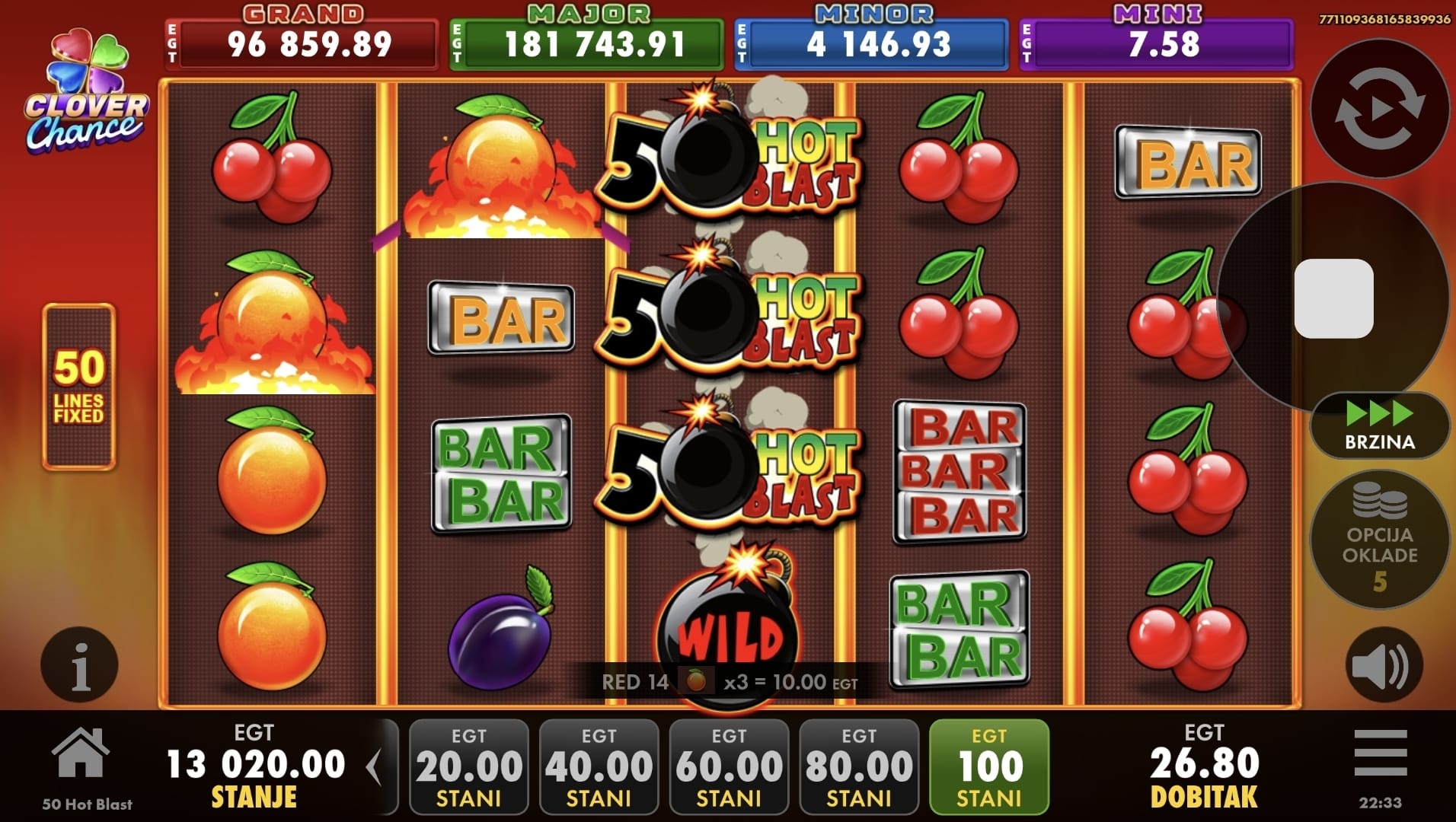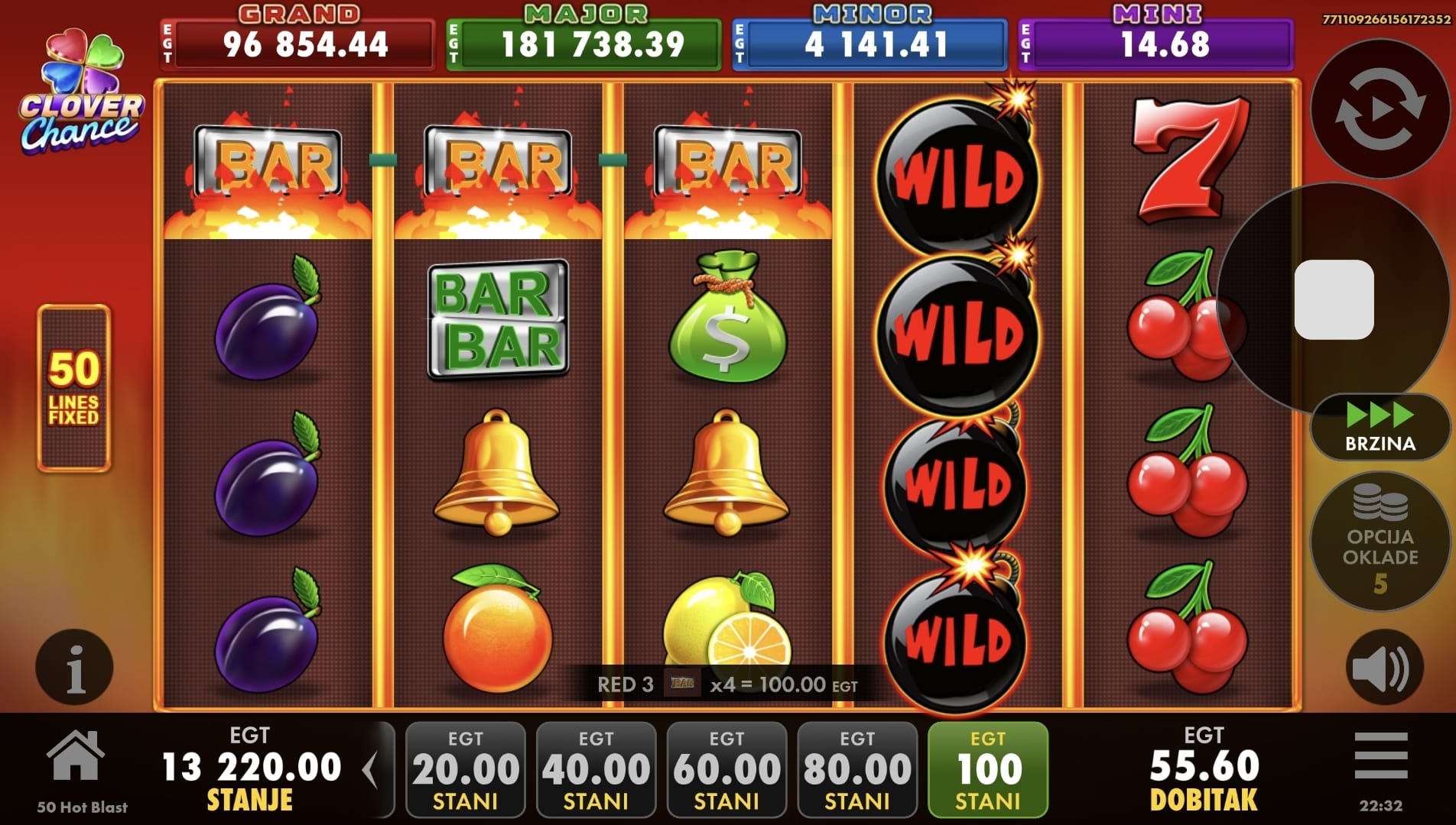 Igra 50 Hot Blast Clover Chance donosi dobitke na svojih 50 isplatnih linija. Wild simbol je zvono i može zamijeniti sve ostale simbole, osim Scattera i bonus simbola, kako bi vam pomogao u stvaranju dobitnih kombinacija. Scatter simboli su zvijezda i znak dolara koji donose isplate bez obzira na svoju poziciju na valjcima.