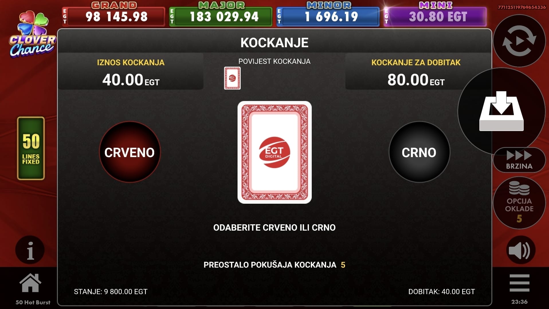 Nakon svake dobitne vrtnje, imate priliku udvostručiti svoj dobitak u značajci Klađenja pogađajući boju sljedeće karte.