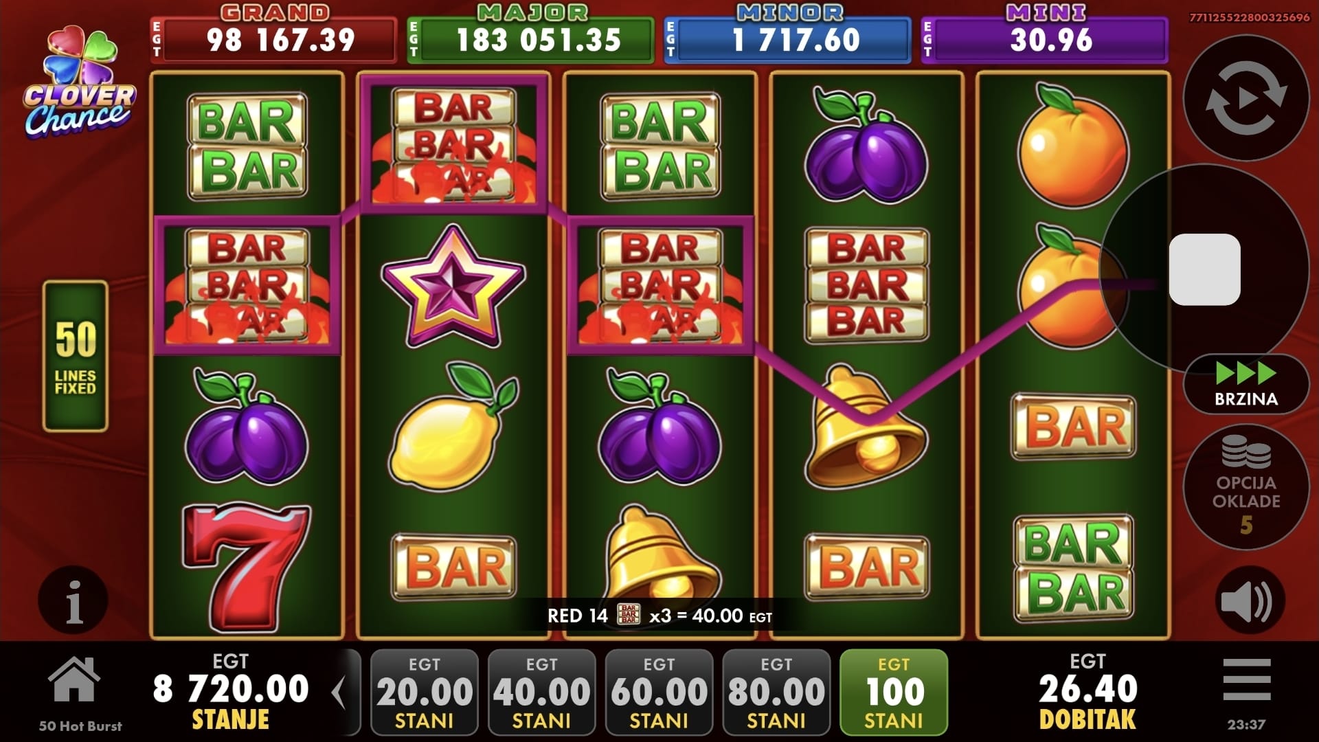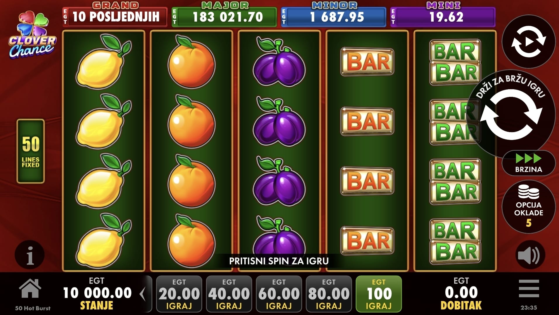 Igra 50 Hot Burst Clover Chance donosi dobitne kombinacije na svojih 50 isplatnih linija. Wild simbol je goruće zvono koje zamjenjuje sve simbole, osim Scattera i bonus simbola, kako bi vam pomogao u stvaranju dobitnih kombinacija. Scatter simboli su zvijezda i znak dolara koji donose isplate bez obzira na svoju poziciju na valjcima.