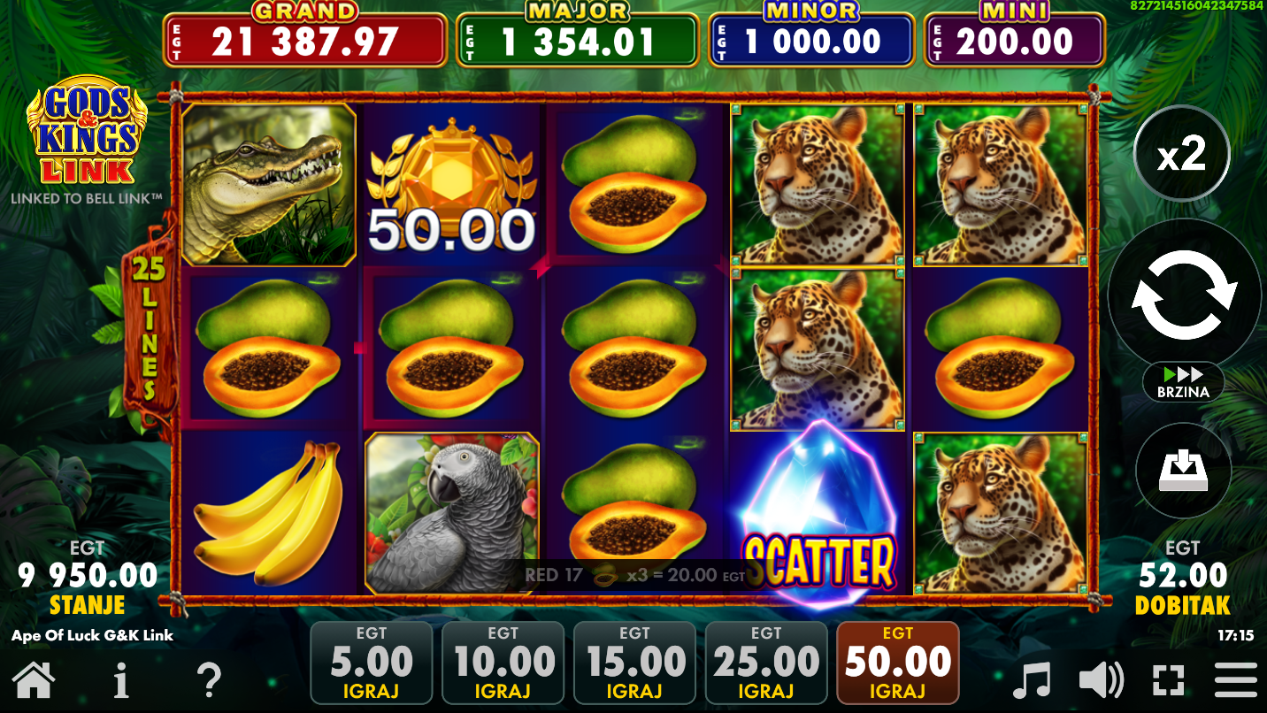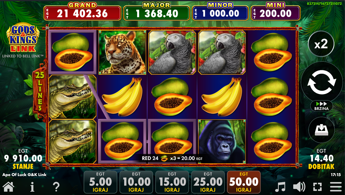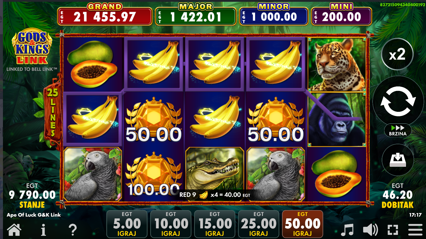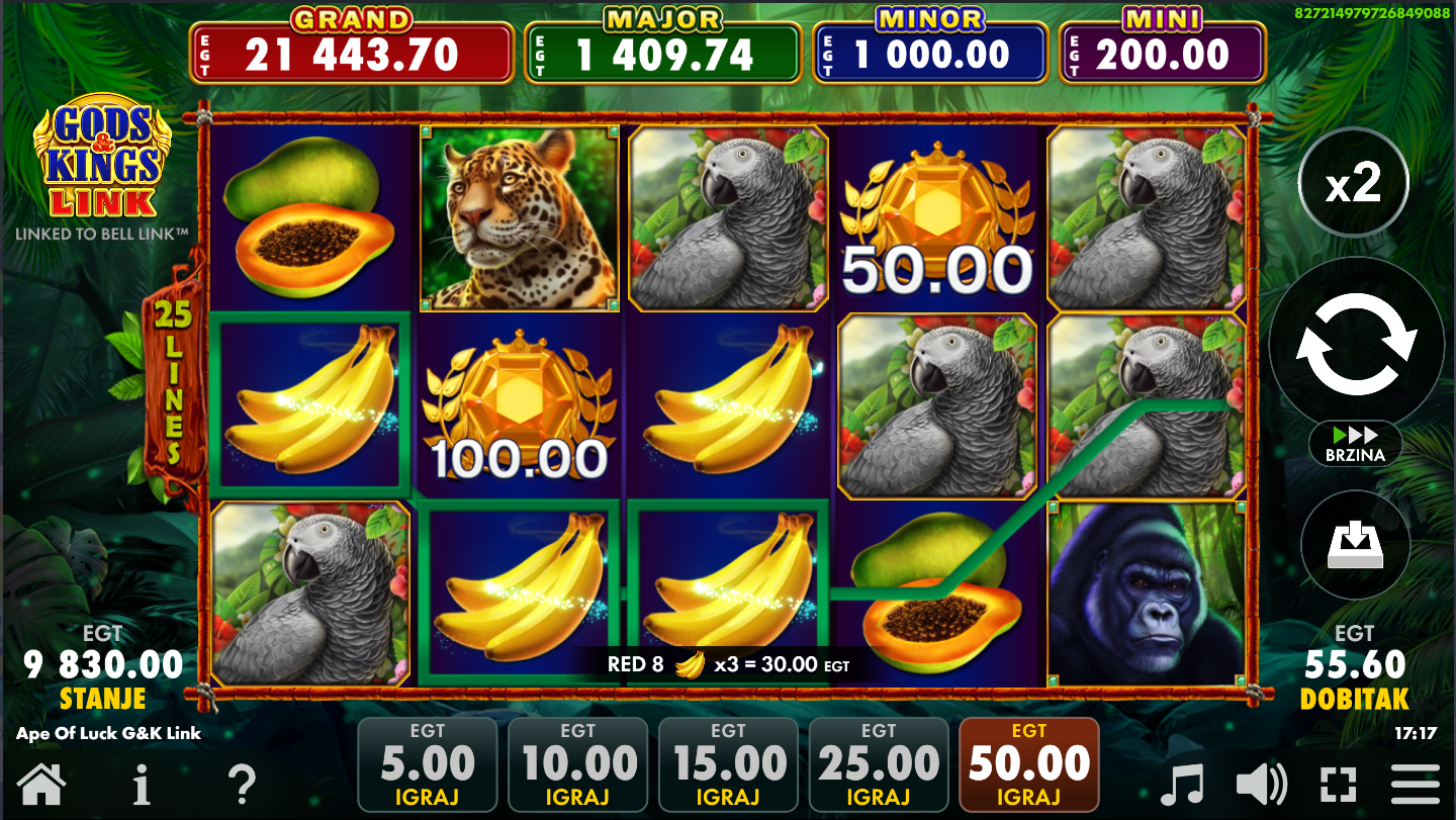 Ape of Luck Gods & Kings Link Bell Link od EGT Digitalje video slot i on je spoj klasičnih slot mehanika s modernim bonus značajkama i multi-level jackpot sistemom. U igri igrača vodi gorila u tropskoj džungli zajedno s drugim divljim životinjama i simbolima, dok se uz zabavnu grafiku i zvuk fokusira na velike nagrade. Igra se odvija na standardnoj mreži od pet bubnjeva i tri reda.