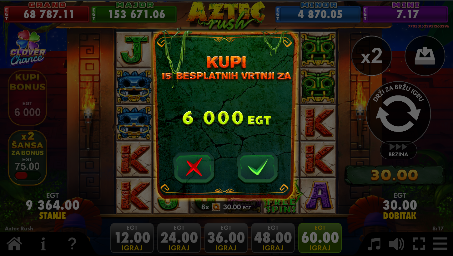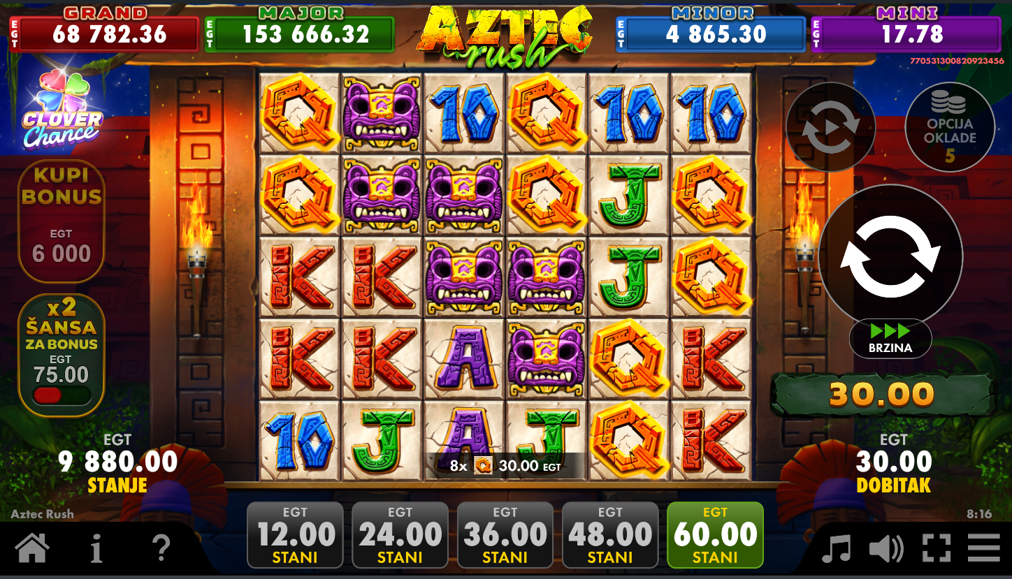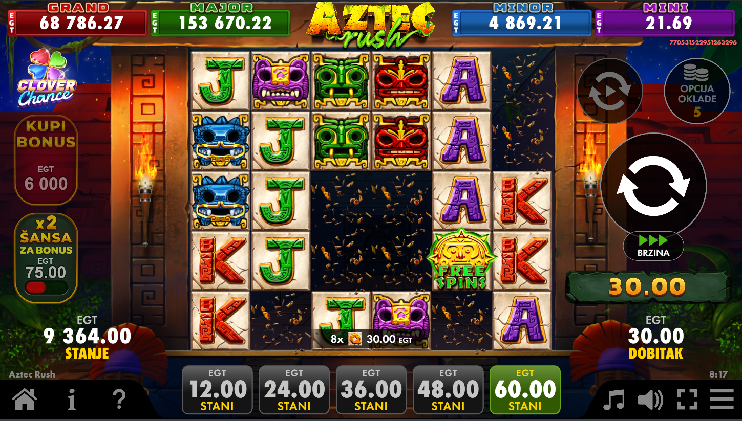 Aztec Rush Clover Chance, od EGT Digital, vodi te duboko u tajanstvene hramove drevnih Asteka, gdje se bogatstva skrivaju iza svakog spina! Na 6 koluta i kaskadnim dobicima, simboli se ruše i stvaraju prostor za nove kombinacije. Multiplikatori od ×2 pa sve do nevjerojatnih ×500 podižu uzbuđenje na maksimum. Besplatne vrtnje otvaraju dodatne mogućnosti, a Clover Chance jackpot može pasti potpuno nasumično. Ovo je prava avantura prepuna mistike, adrenalina i velikih šansi za dobitak!