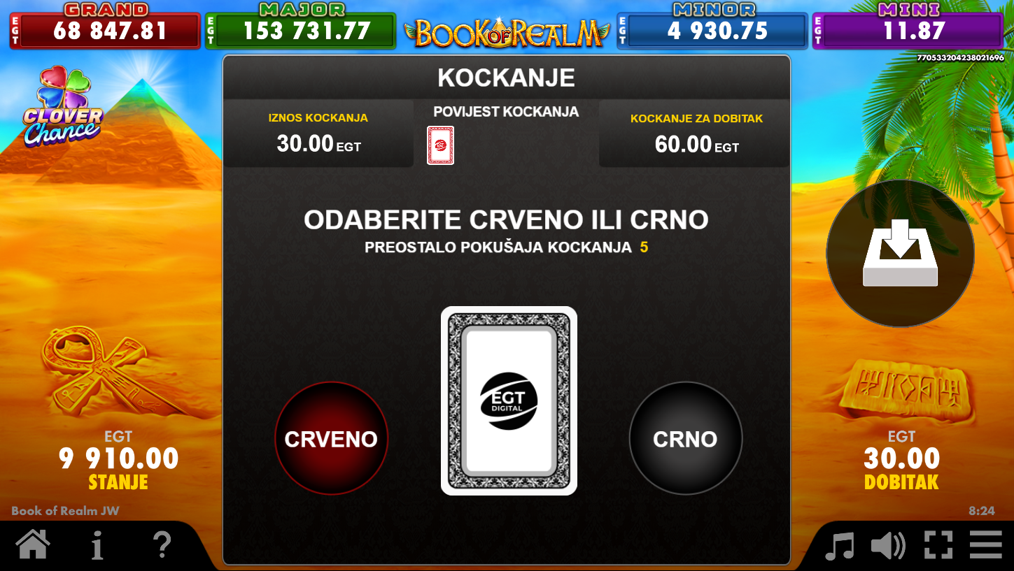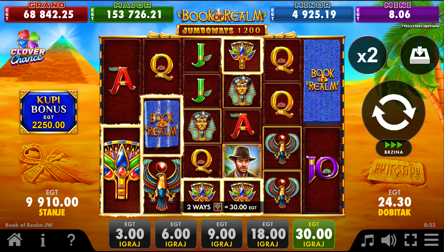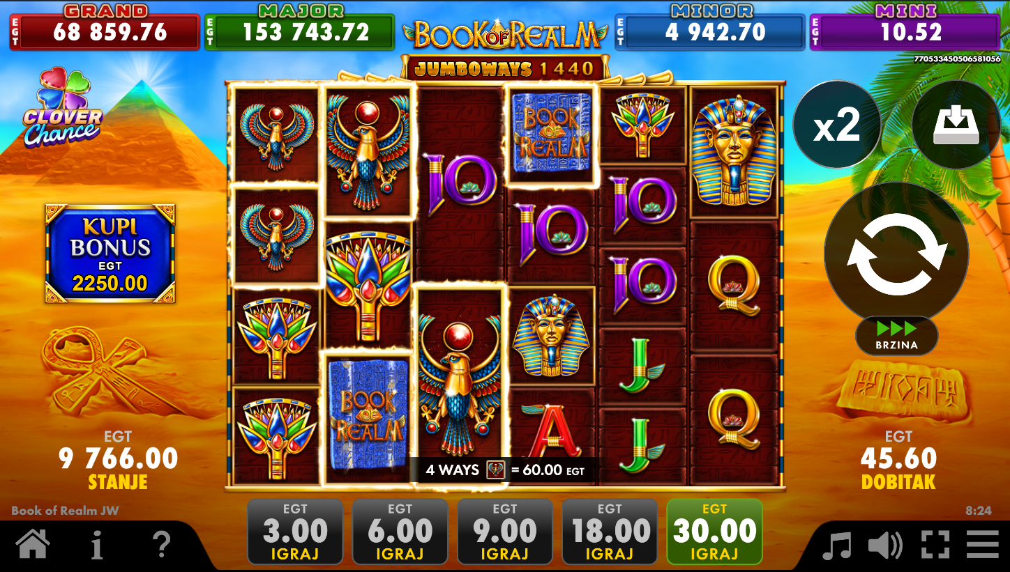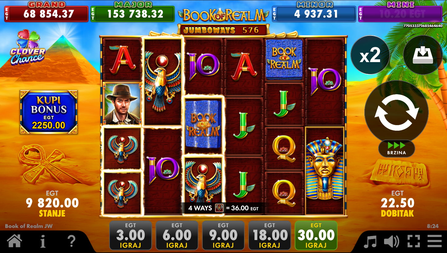 Book of Realm Jumboways Clover Chance i EGT Digital vode te u svijet drevnih tajni i skrivenih blaga! Zahvaljujući Jumboways mehanici, broj načina za dobitak varira od 64 do čak 15625 po spinu. Knjiga je tvoj ključ, otvara vrata do besplatnih vrtnji i posebnih simbola koji se šire preko koluta. Clover Chance jackpot dodatno začinjava svaku igru i može donijeti jednu od četiri razine nagrada. Ovo je avantura gdje svaka vrtnja skriva mogućnost velikog otkrića!