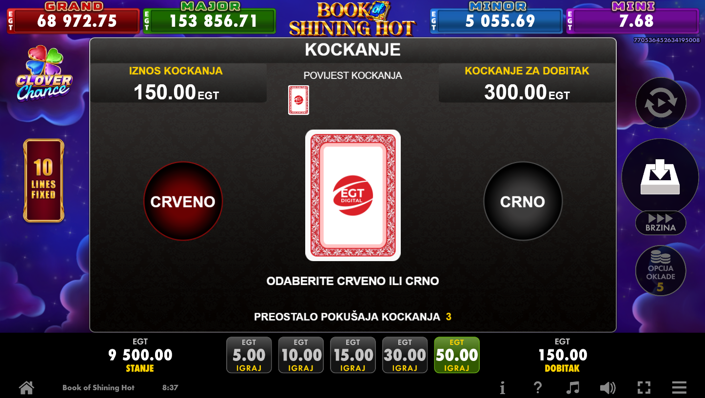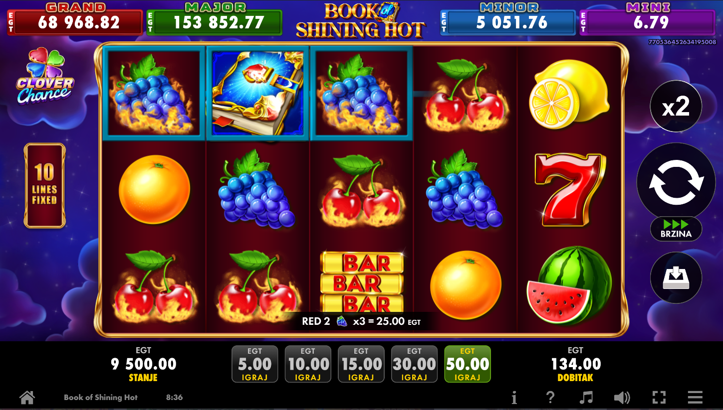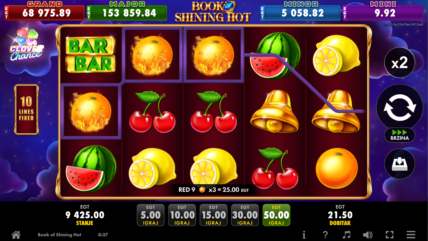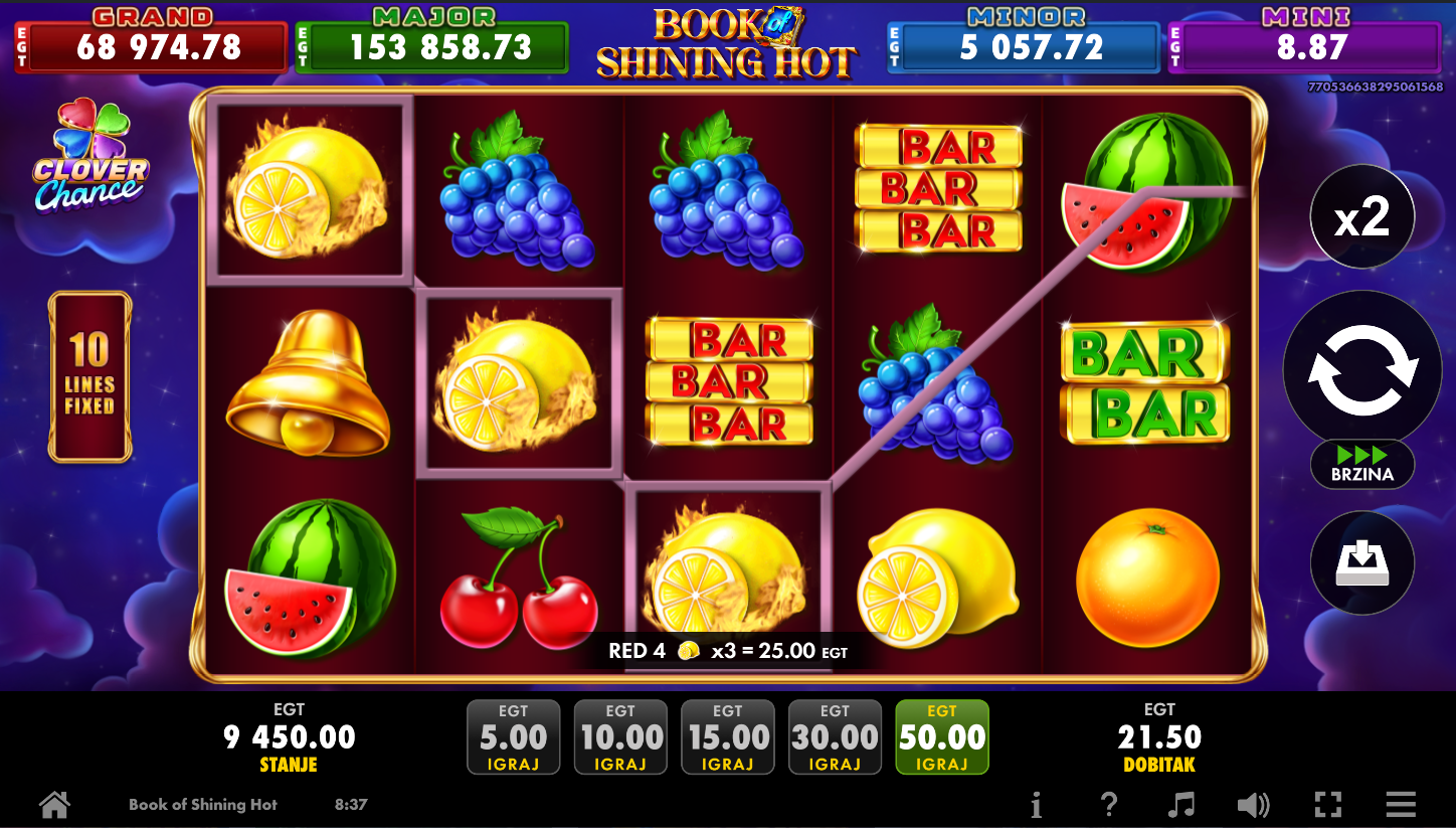 Book of Shining Hot Clover Chance od EGT Digital donosi spoj mistične knjige i blistavih voćnih simbola na 5 koluta i 10 linija! Knjiga je i Wild i Scatter, pa otključava bonus igru s besplatnim vrtnjama i širi posebne simbole. Svaka vrtnja pulsira energijom dok voće sjaji na ekranu, a Clover Chance jackpot može se aktivirati u bilo kojem trenutku. Ovo je slot koji kombinira čaroliju i nostalgiju s modernim jackpot uzbuđenjem.