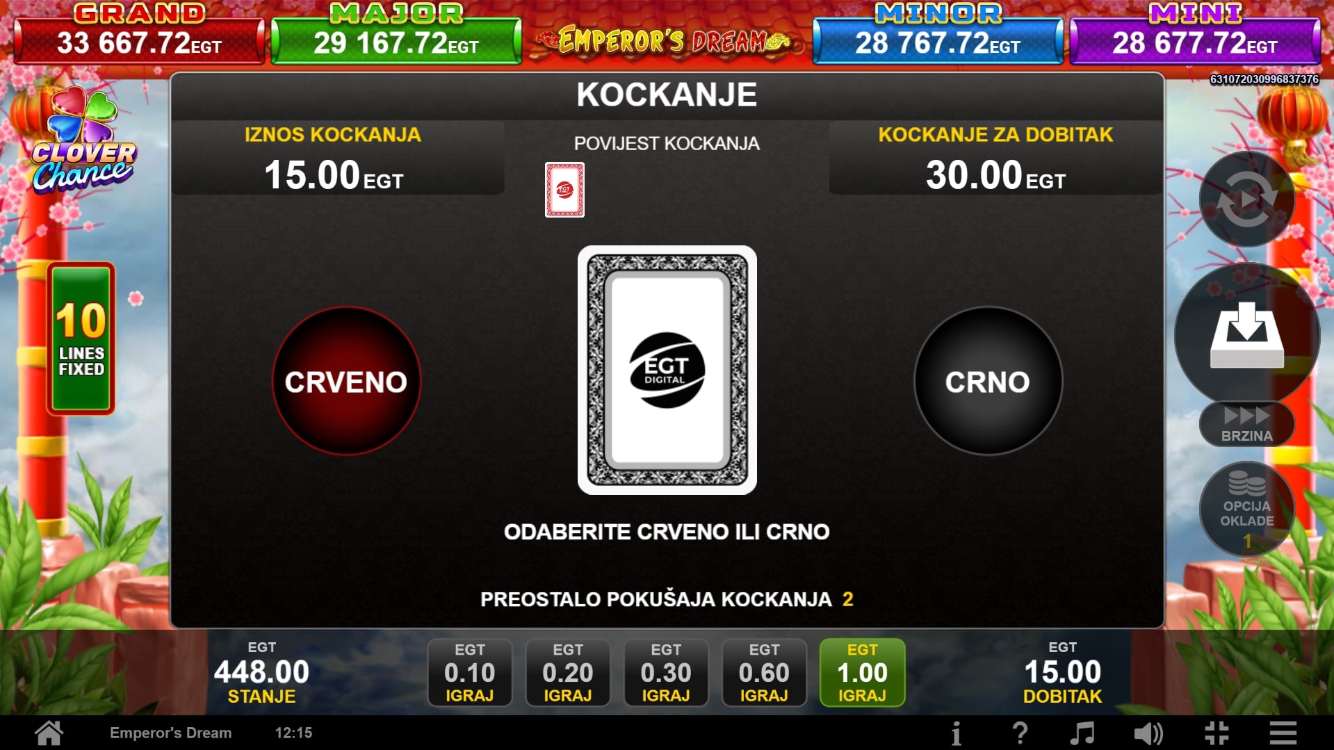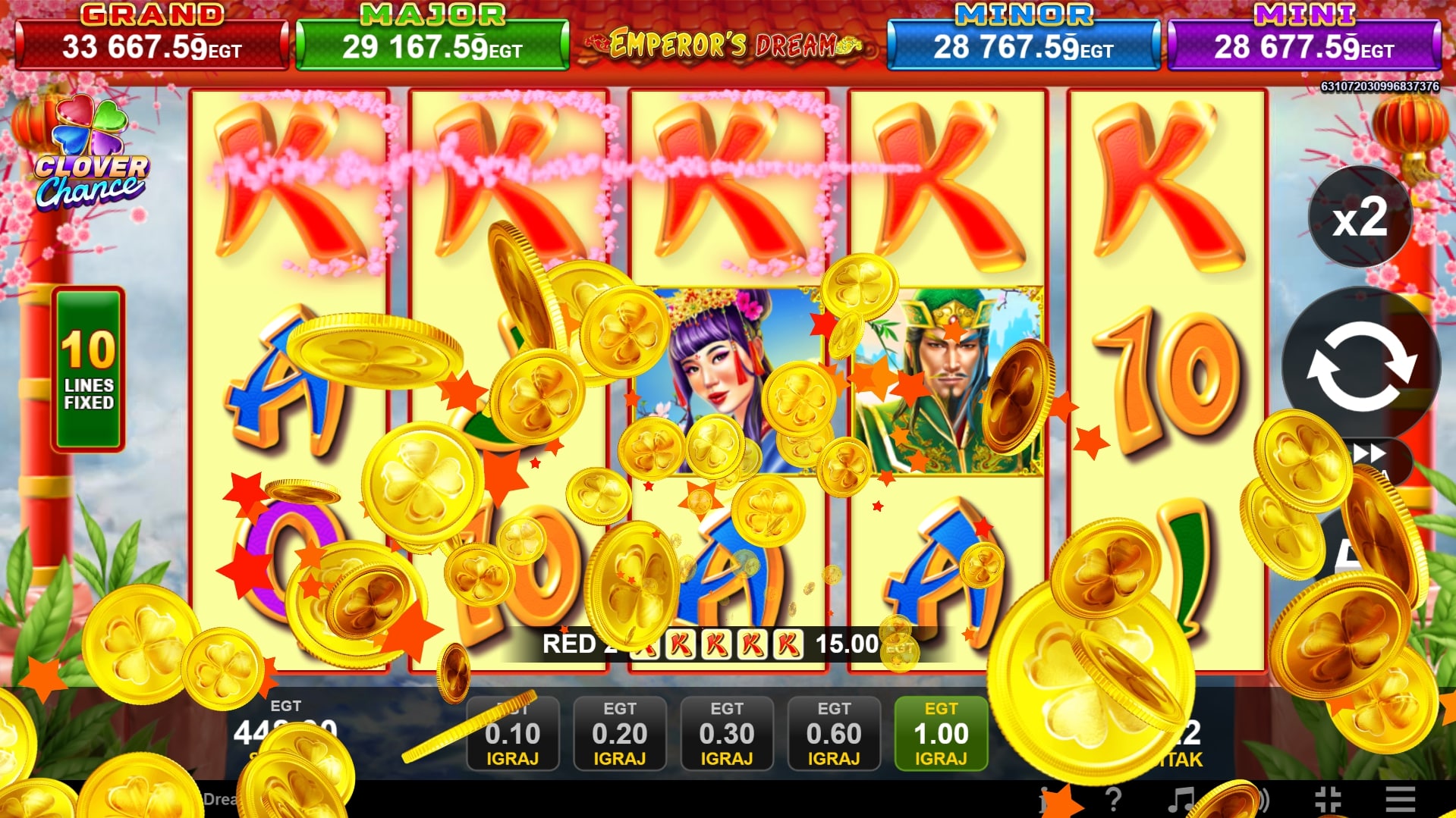 Emperor's Dream Clover Chance vodi igrača u drevnu Kinu, zemlju careva i zmajeva gdje vladaju legendarni dobici. Najviše isplaćuju simboli princa, princeze, zmaja i famoznih kineskih lampiona, dok igrač uz to može okrenuti posebni simbol cara koji ne samo da mijenja druge simbole u dobitnim linijama, već uz to može odvesti igrača do besplatnih vrtnji. U slučaju dobitka, igrač ga može 'poduplati' pogađanjem boje karte okrenute licem prema dolje. Zaigraj Emperor's Dream Clover Chance za najbolje nagrade!