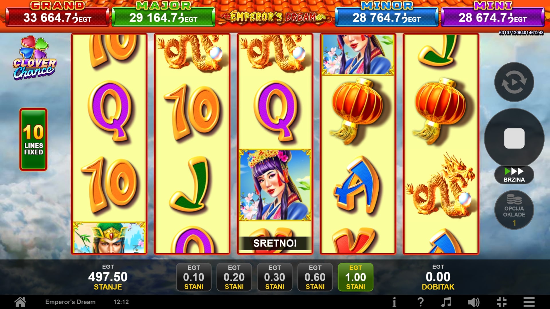 Ne postoje podaci o povratu igraču (RTP) i volatilnosti igre Emperor's Dream Clover Chance.