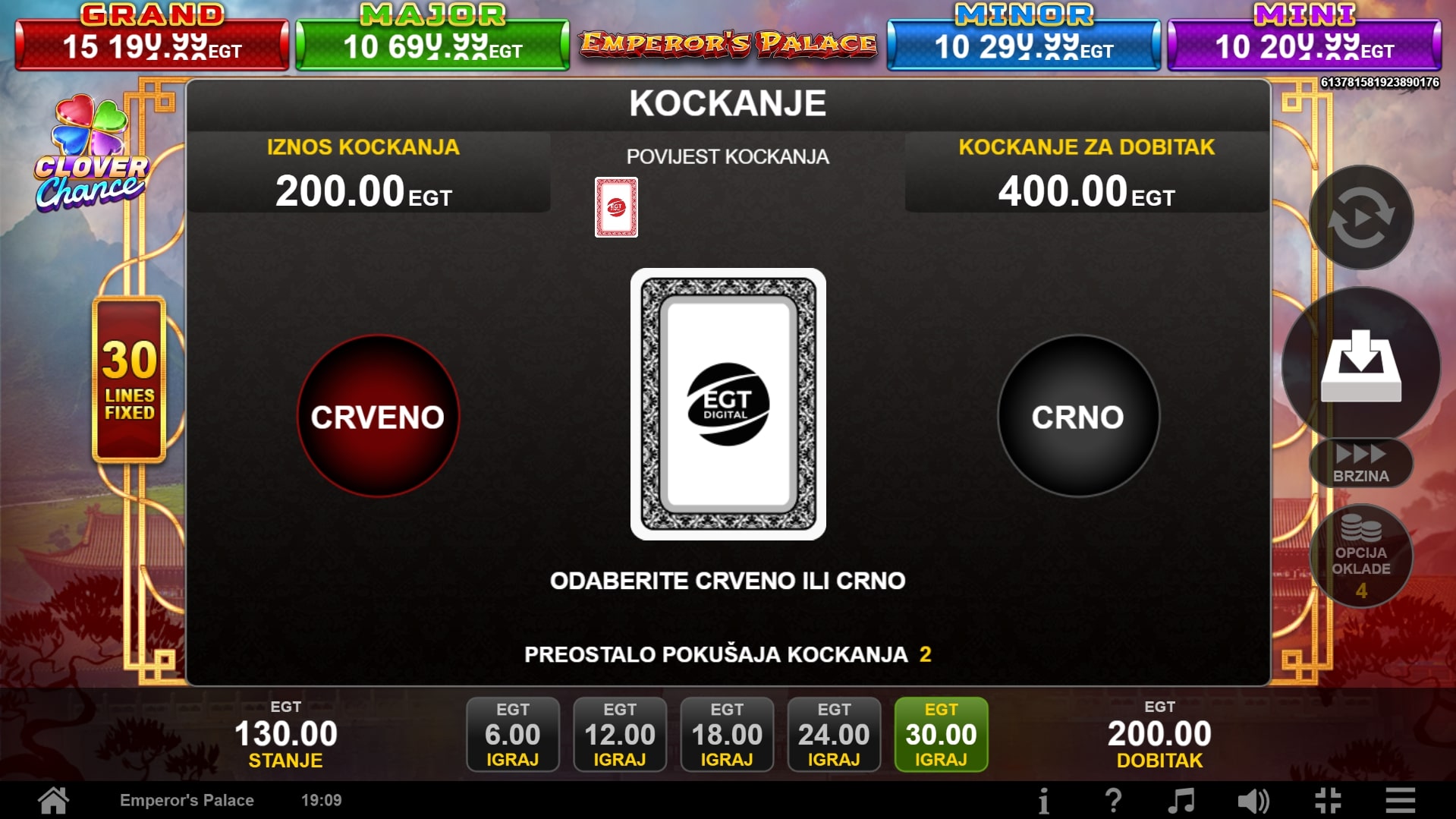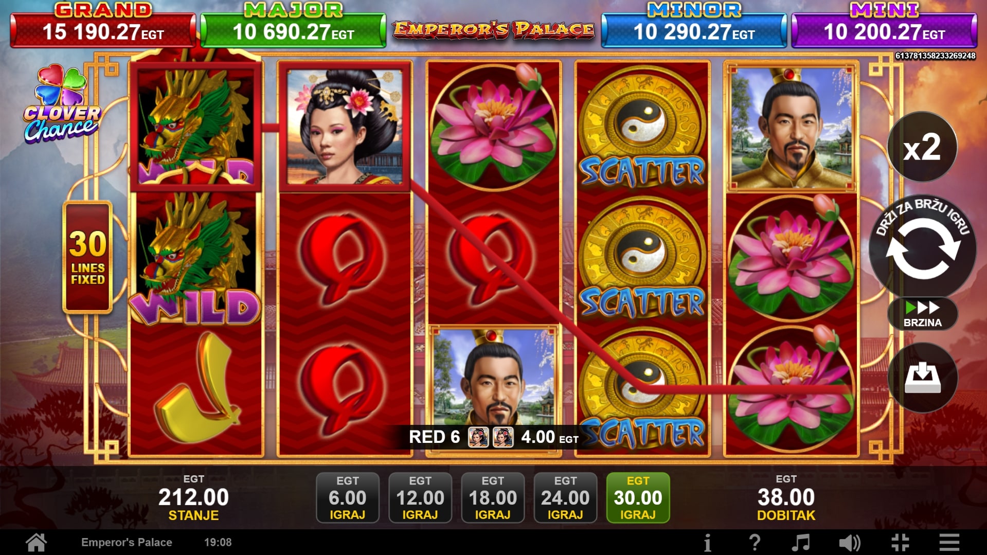 Ne postoje podaci o povratu igraču (RTP) i volatilnosti slot igre Emperor's Palace Clover Chance.