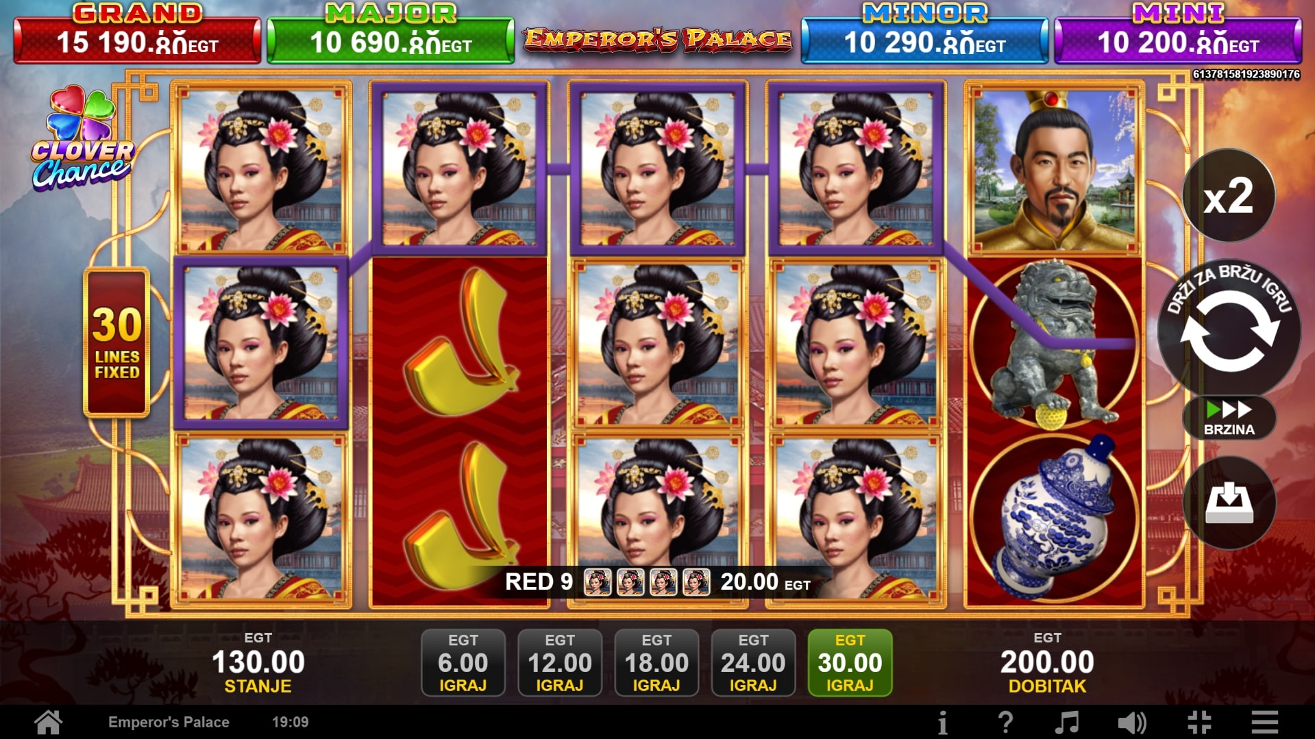 Emperor's Palace Clover Chance slot je igra kineske tematike koja vodi igrača u pustolovinu drevnom Kinom i dvorima gdje vladaju drame i spletke. Najvredniji obični simboli su oni cara i carice, a igra uz to sadrži Wild koji može zamijeniti druge simbole te Scatter koji igraču može osvojiti besplatne vrtnje. Dobitke je moguće udvostručiti, a uz to postoji posebni Clover Chance Jackpot koji nudi vrhunske prilike za visoke dobitke. Zaigraj Emperor's Palace Clover Chance i uroni u svijet tajni i mističnih nagrada!