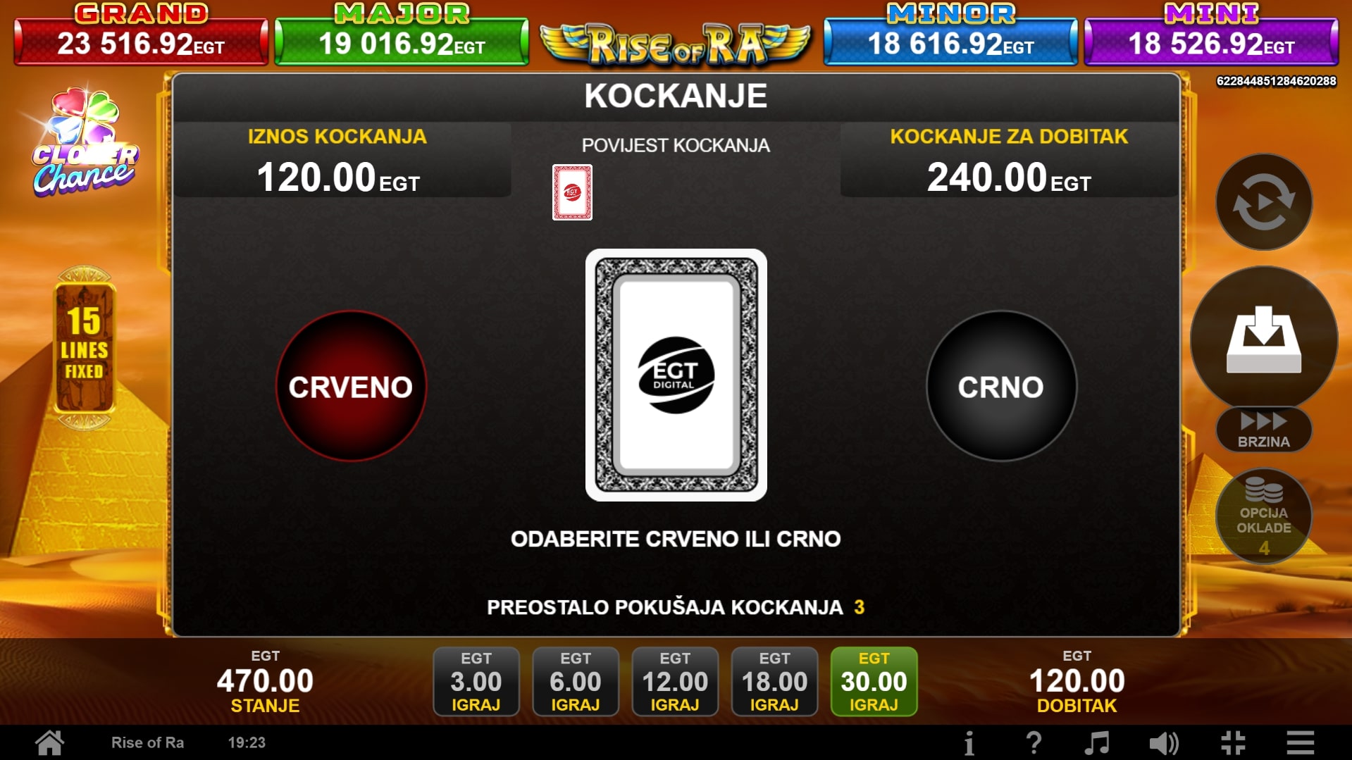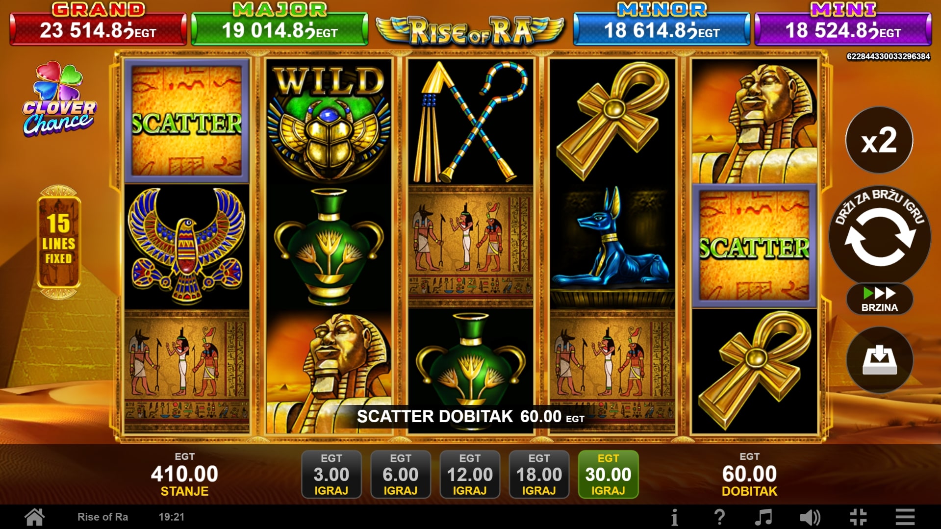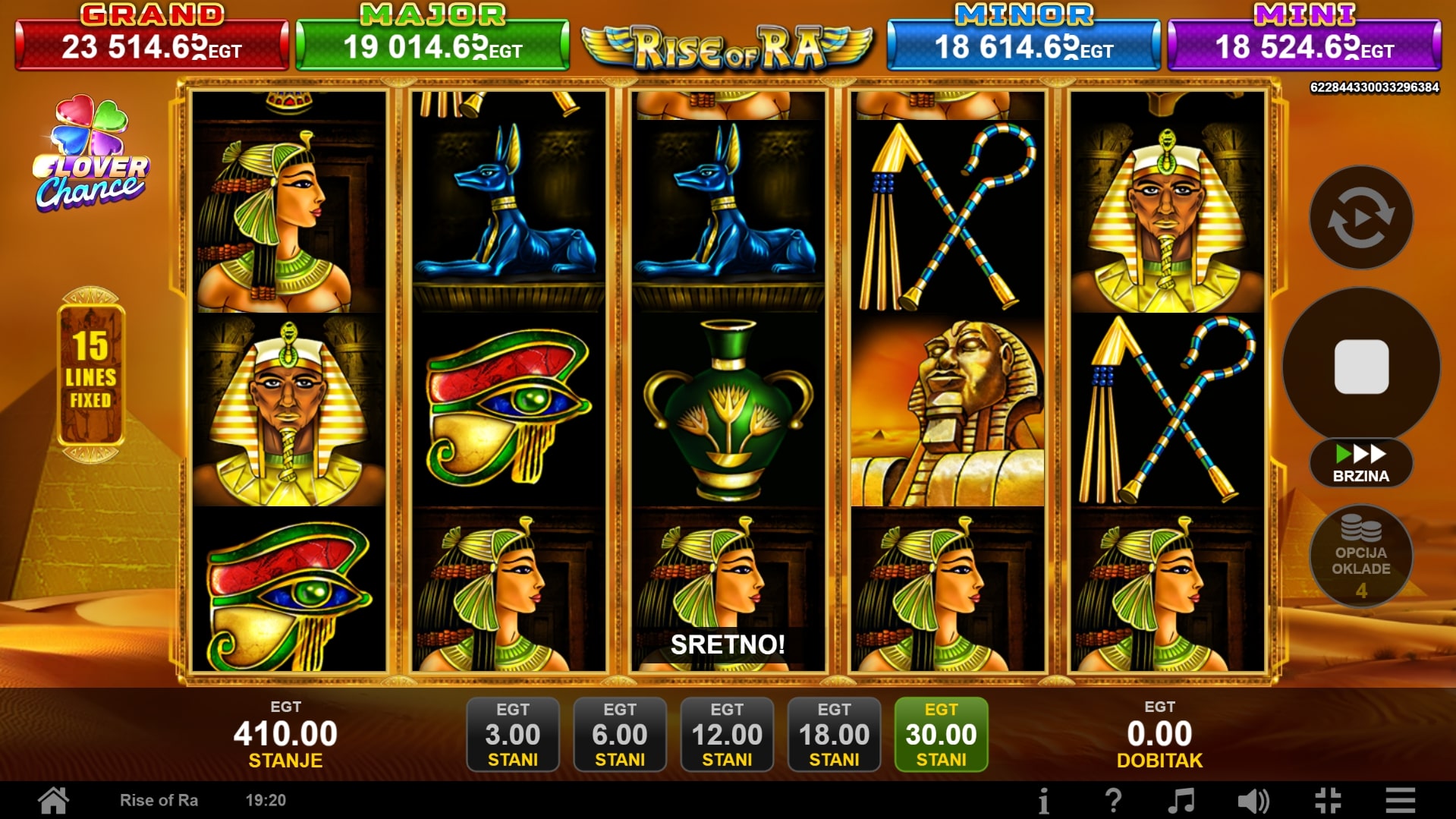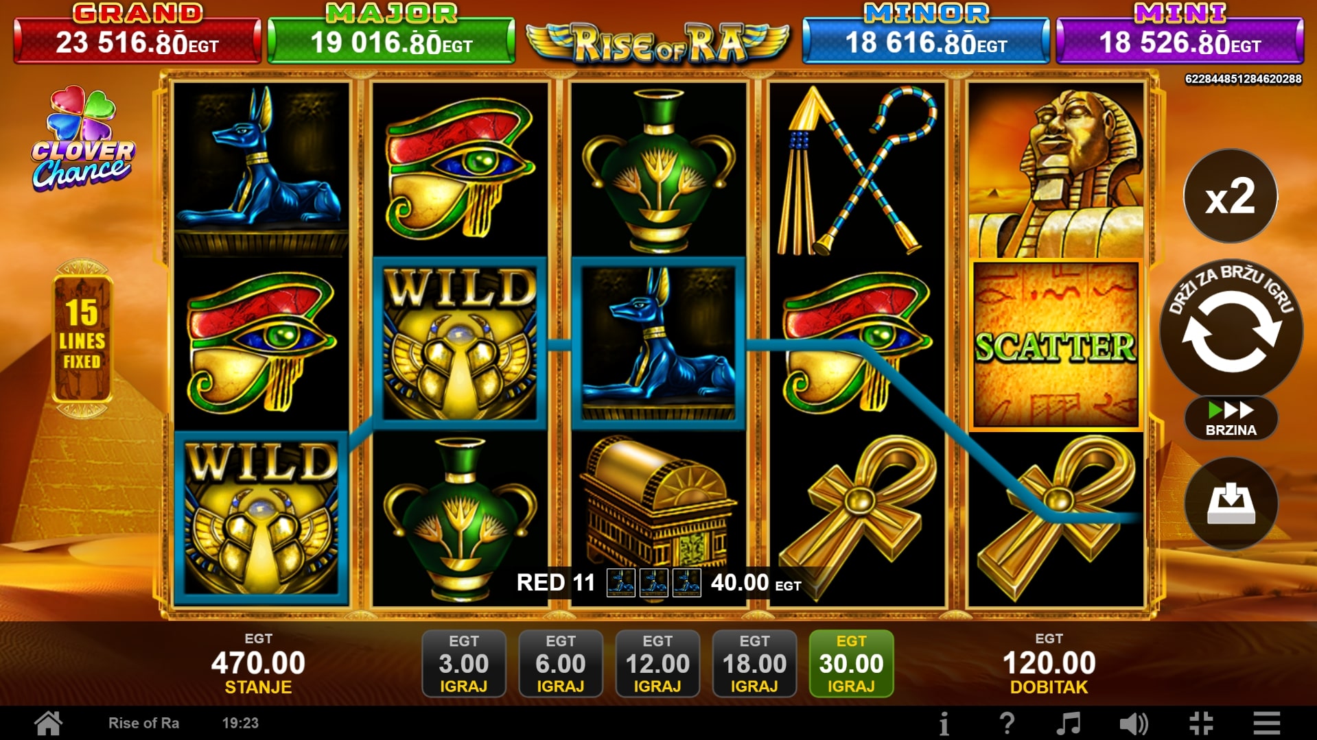 Ne postoje podaci o povratu igraču (RTP) i volatilnosti slot igre Rise of Ra Clover Chance.