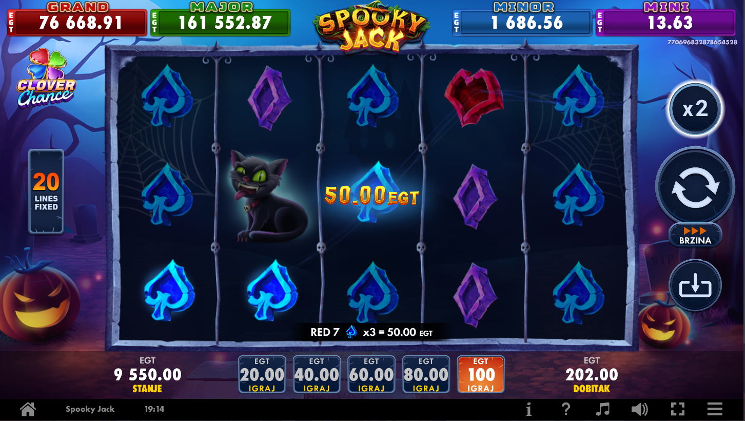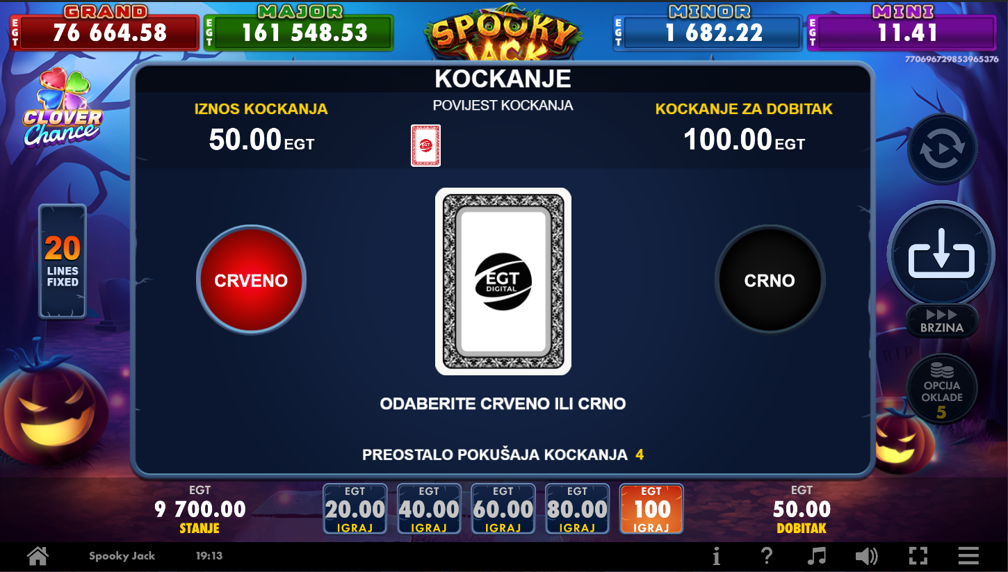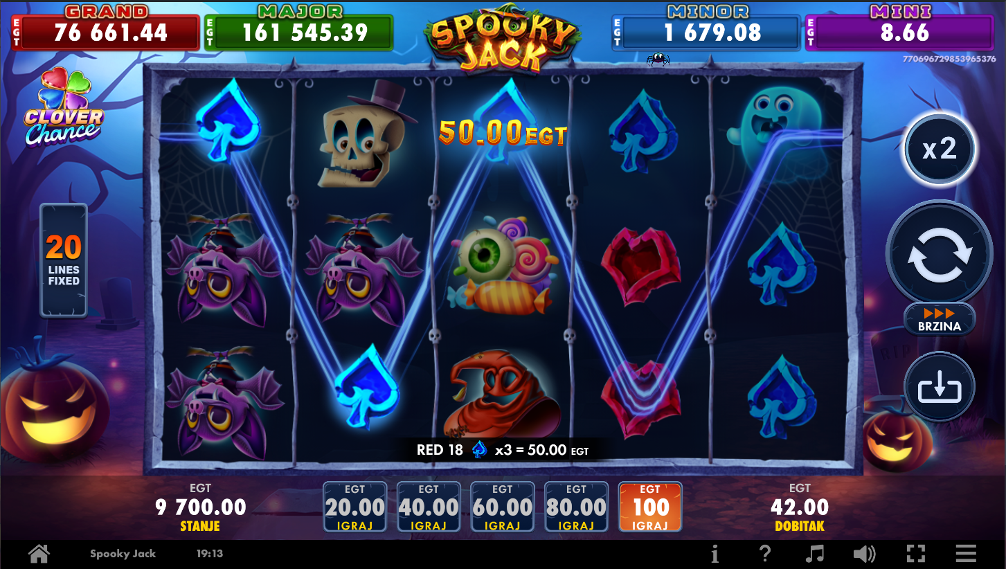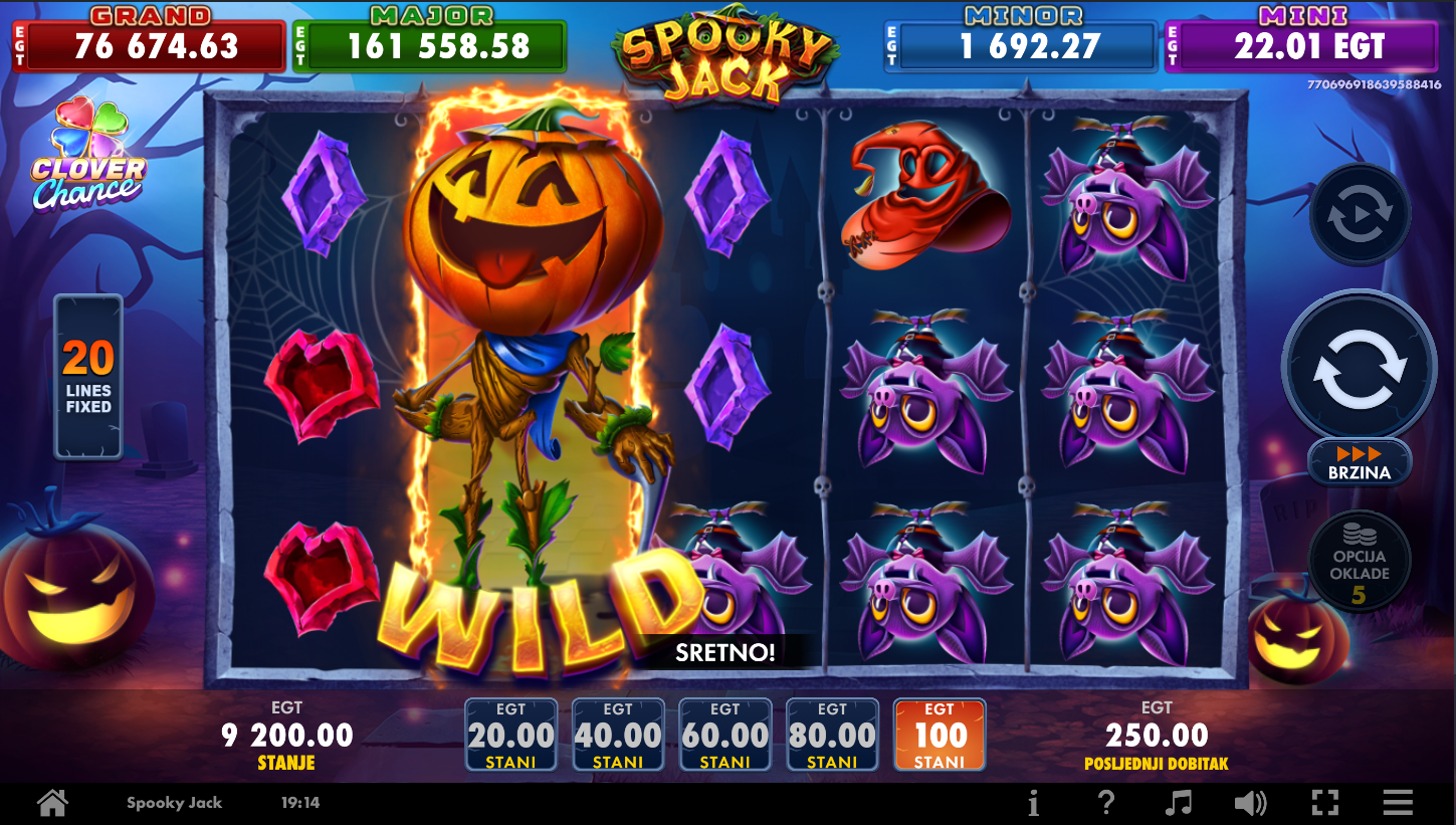 Spooky Jack Clover Chance, od EGT Digital, vodi te u svijet duhova, bundeva i jezovitih simbola na 5 × 3 koluta i 20 linija! Svaka vrtnja donosi dozu misterije, dok se Wild simboli šire i pomažu u stvaranju većih dobitaka. Scatter simboli dodaju dodatne prilike za nagrade, a multiplikatori mogu značajno pojačati tvoju sreću. Clover Chance jackpot skriva se iza svakog spina i može donijeti jednu od četiri razine nagrada. Ovo je spooky avantura prepuna adrenalina i zabave!