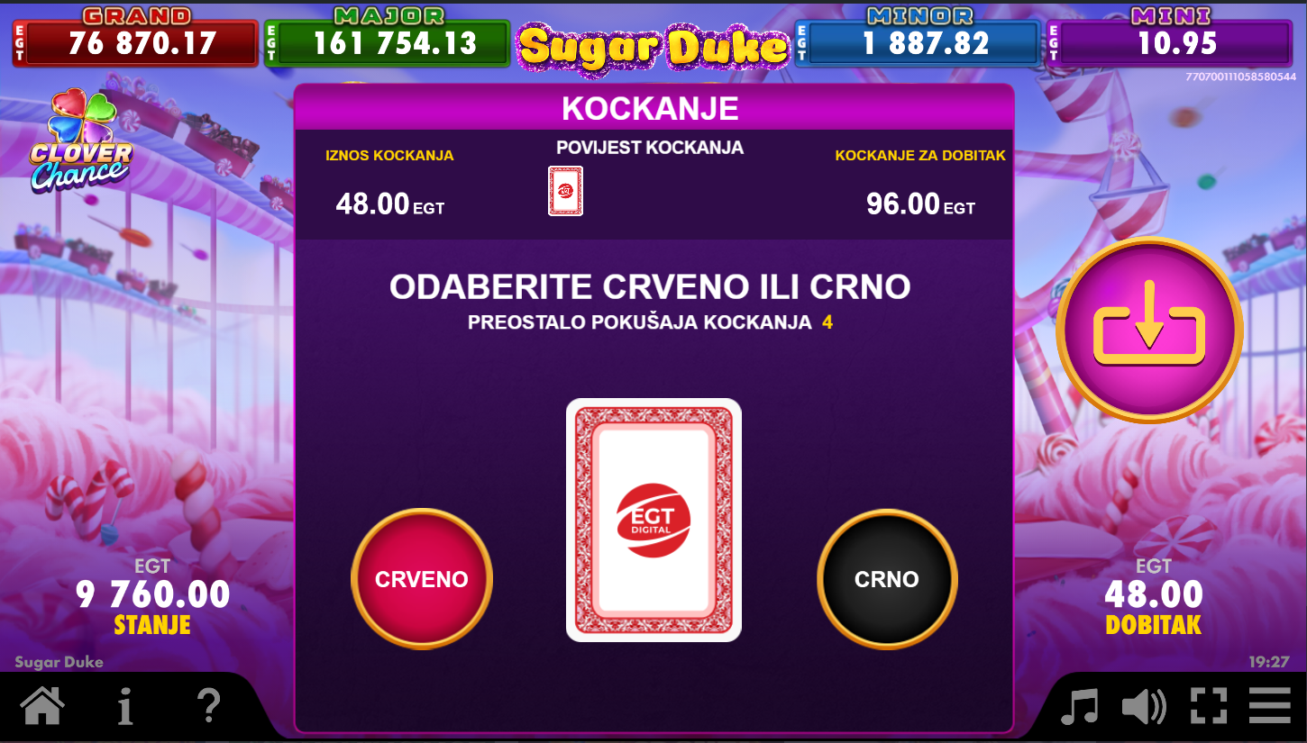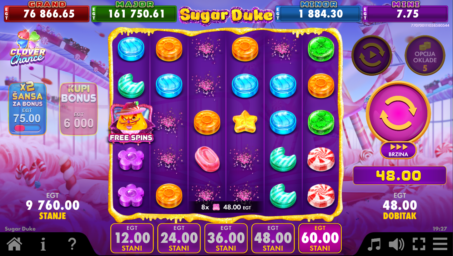 Sugar Duke Clover Chance, od EGT Digital, vodi te u šareni svijet slatkiša, gdje svaki spin izgleda kao prava poslastica! Na 5 × 6 koluta, simboli se ruše u kaskadama i otvaraju prostor za nove kombinacije. Scatter simboli pokreću besplatne vrtnje, a multiplikatori rastu s lancima dobitaka i mogu donijeti ogromne nagrade. Svaka vrtnja je poput zalogaja šećerne eksplozije, dok Clover Chance jackpot može donijeti slatko iznenađenje u četiri razine.