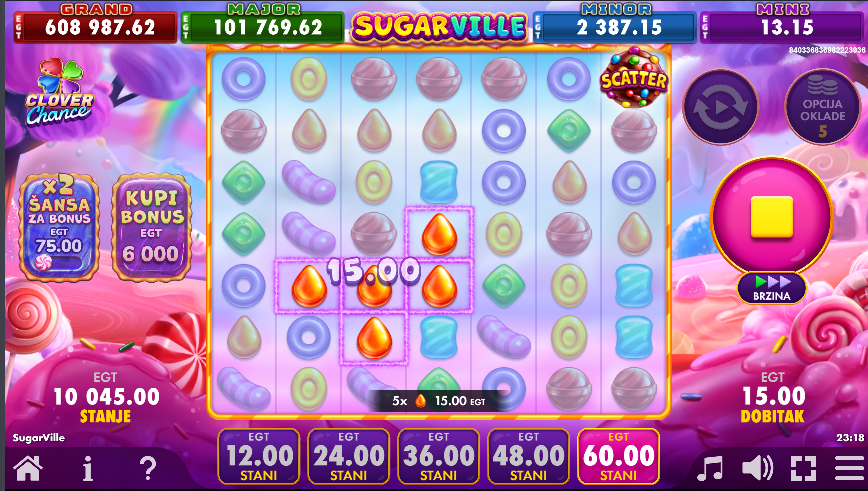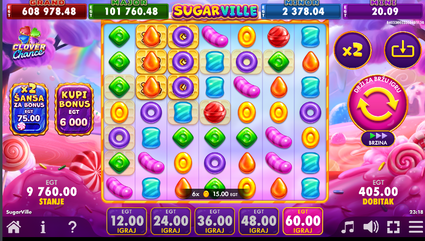 SugarVille Clover Chance od EGT Digital je video slot igra sa slatkom tematikom bombona i šarenih nagrada. Igra se odvija na mreži 7x7 i koristi moderni tumbling reels sistem koji se povećava sa svakim uzastopnim dobitkom. Scatter simbol donosi besplatne vrtnje i dodatne šanse za veće nagrade.