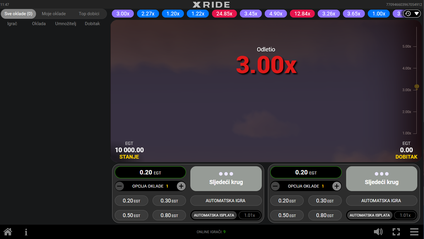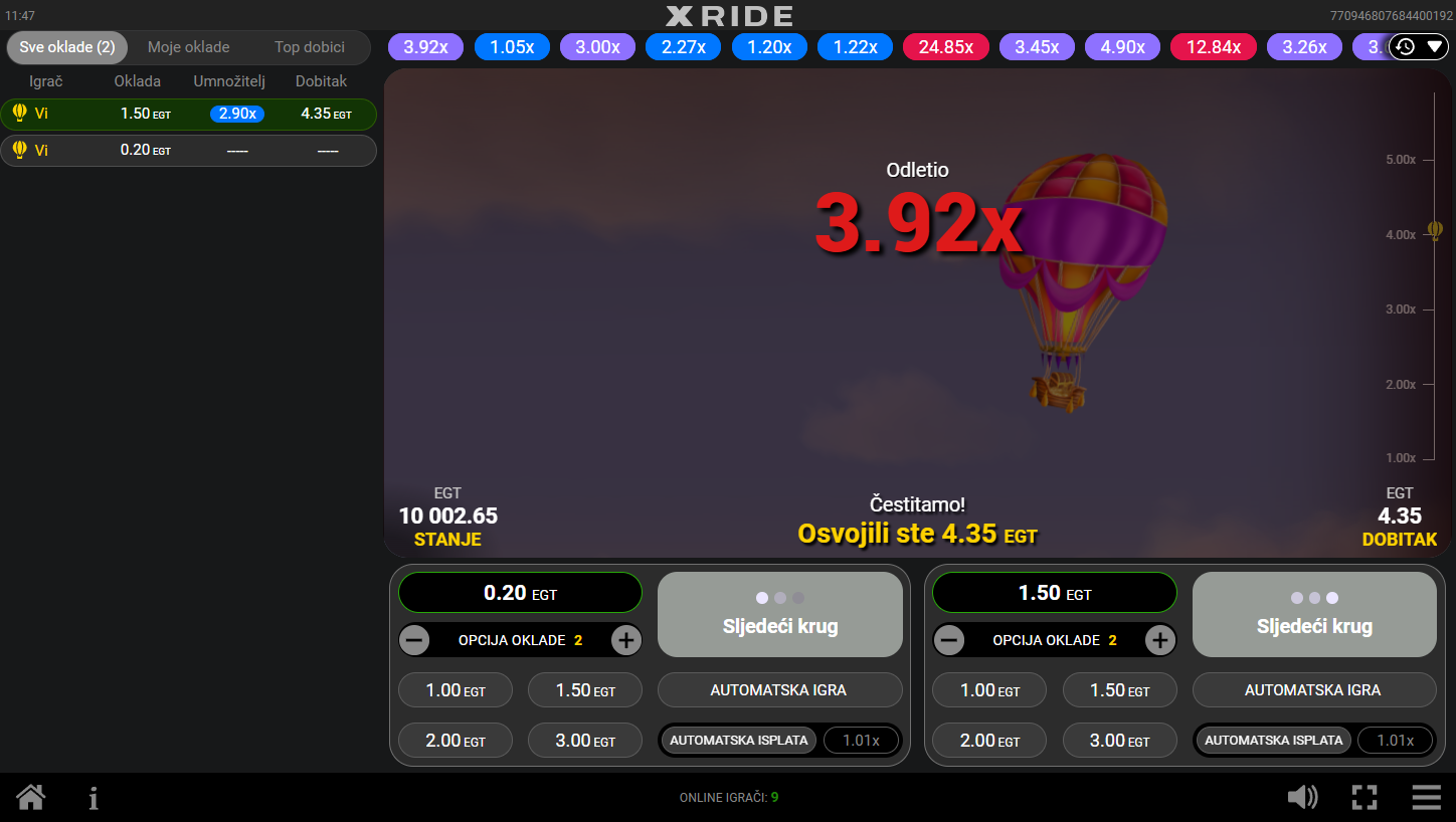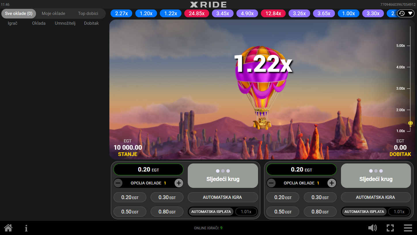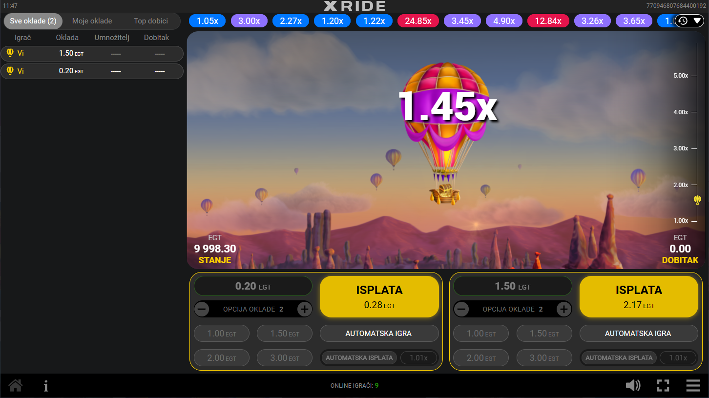 xRide i EGT Digital te vode na adrenalinsku vožnju balonom koji leti sve više i više! Multiplikator stalno raste, a ti odlučuješ kada ćeš uskočiti s dobitkom. Grafika je šarena, brza i moderna, a igra daje osjećaj utrke protiv vremena. Dok balon ide u nebo, raste i napetost. Jesi li spreman stisnuti kočnicu na pravom mjestu?