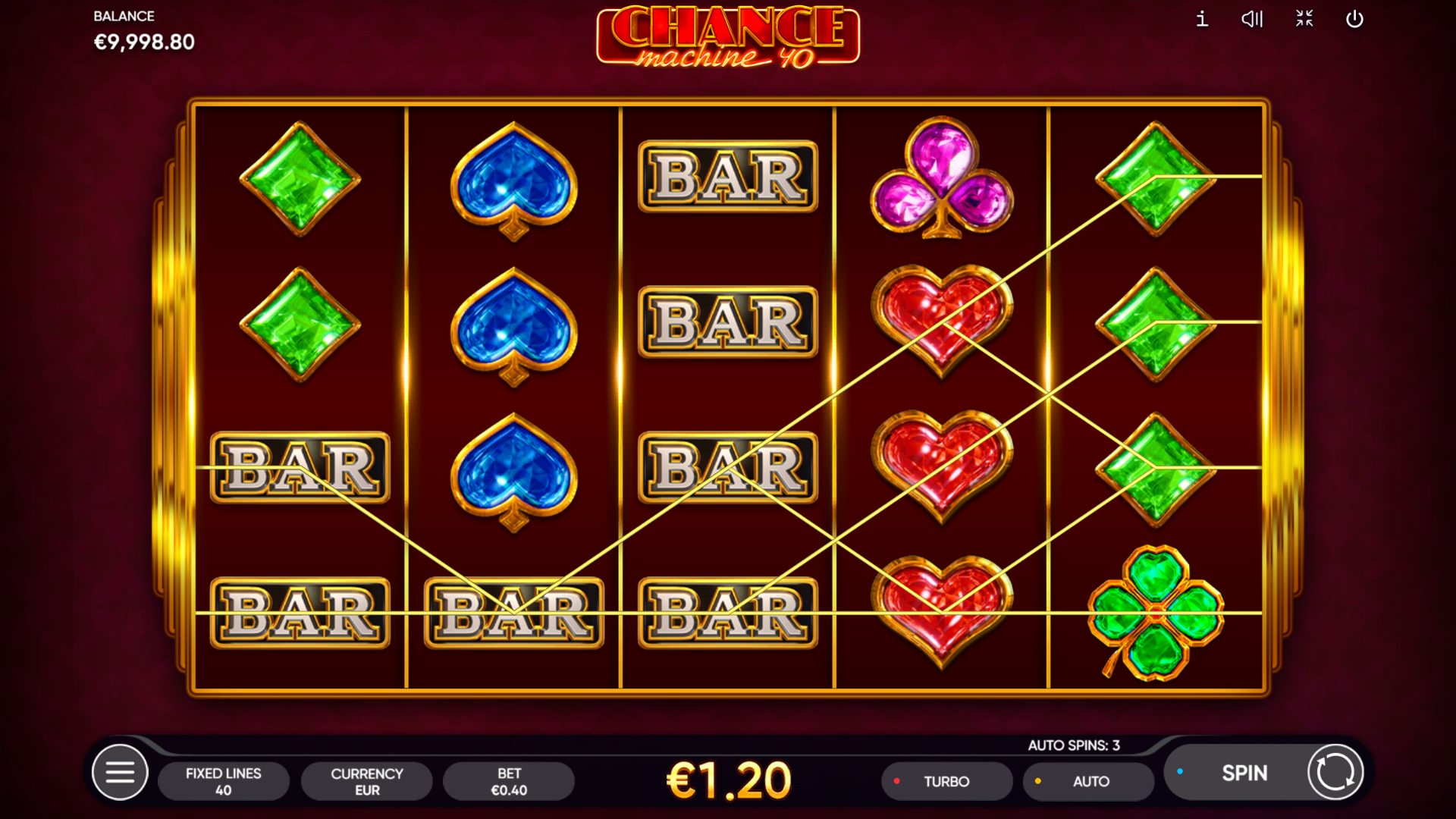 dodatne dobitke gdje god se pojave. Vizualno dotjerana i jednostavna za igru, Chance Machine 40 pruža klasičan doživljaj uz moderni "twist". Idealna je za sve koji vole brzu igru s čistim pravilima i mogućnošću lijepih dobitaka!