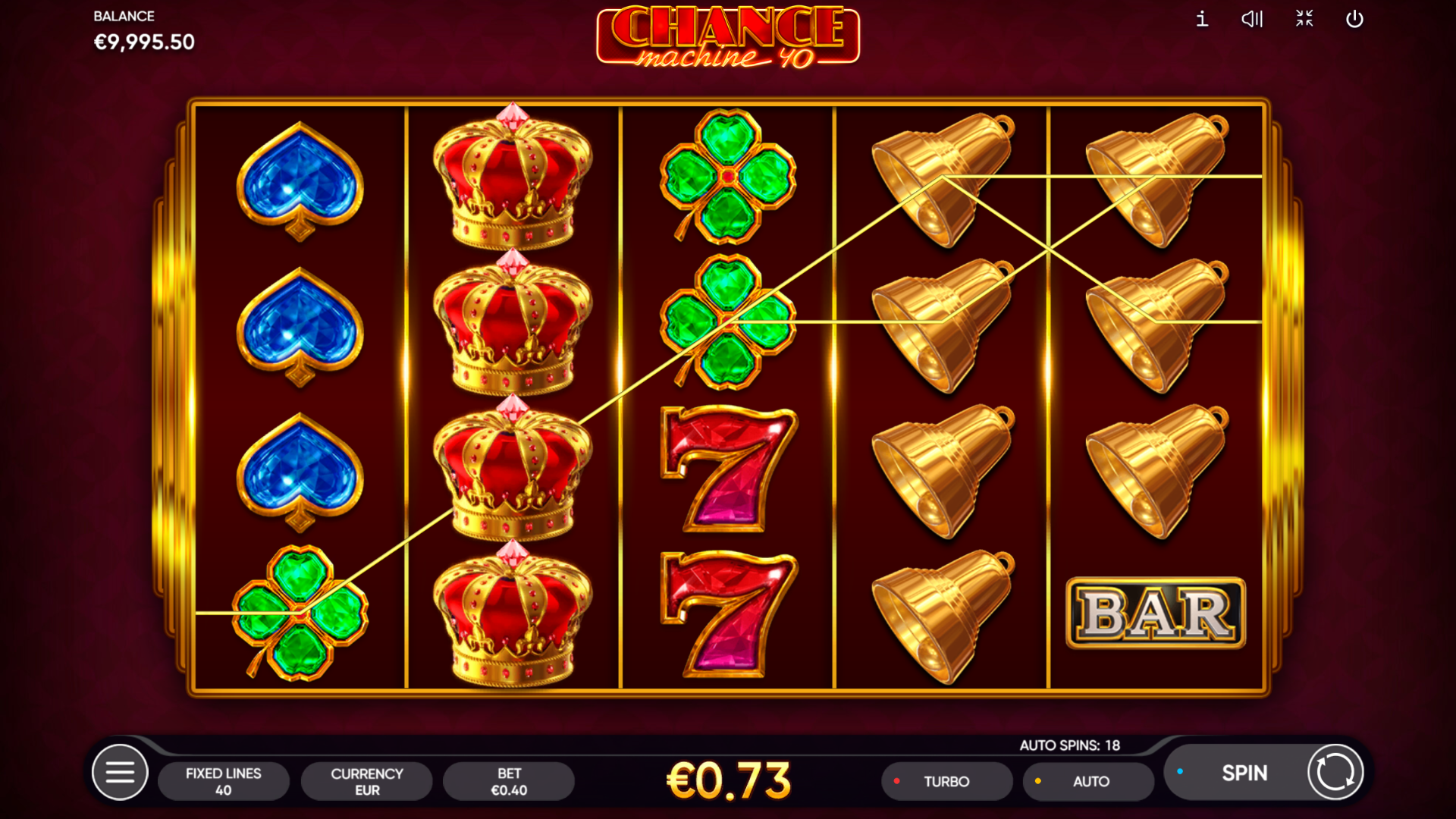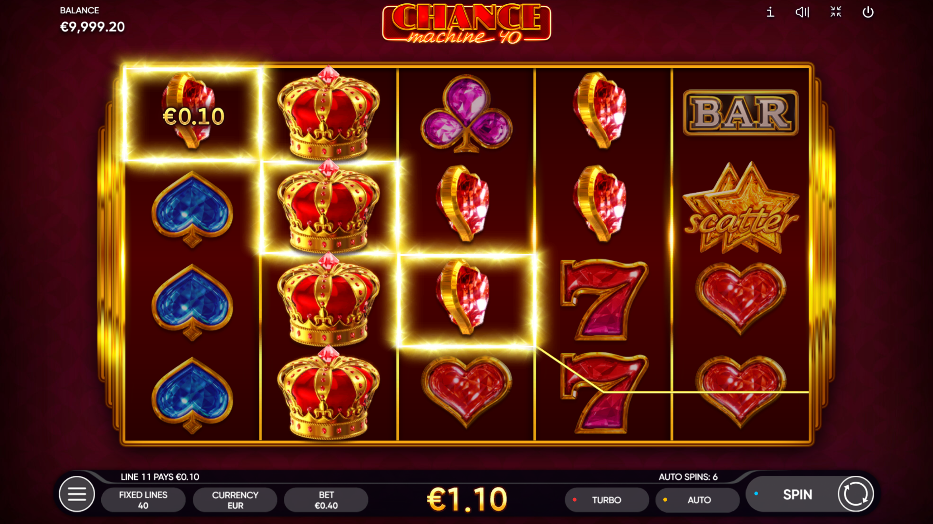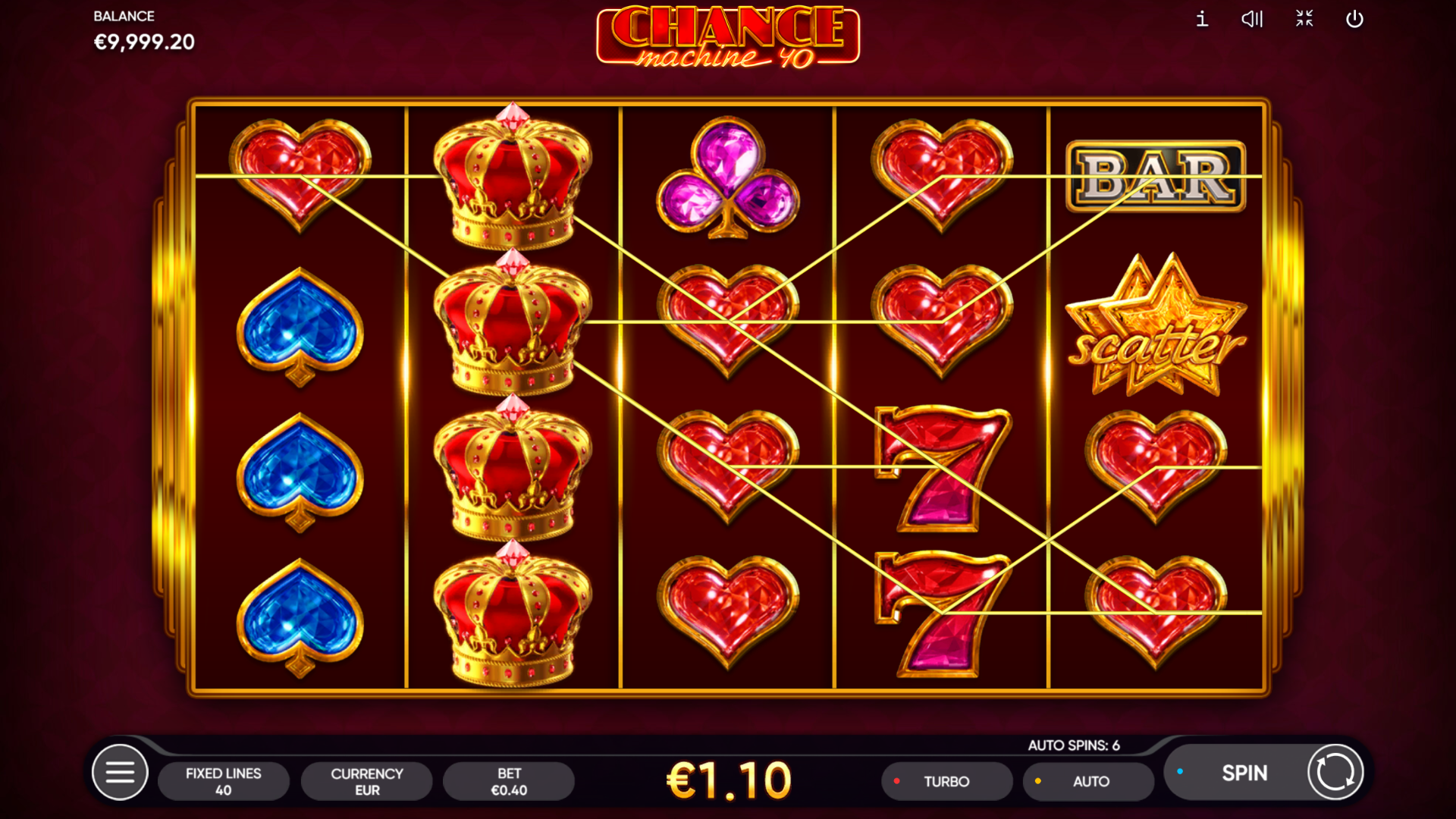 40 fiksnih isplatnih linija. Sjajni simboli kruna, zvijezda i dragulja stvaraju osjećaj luksuza pri svakom spinu.