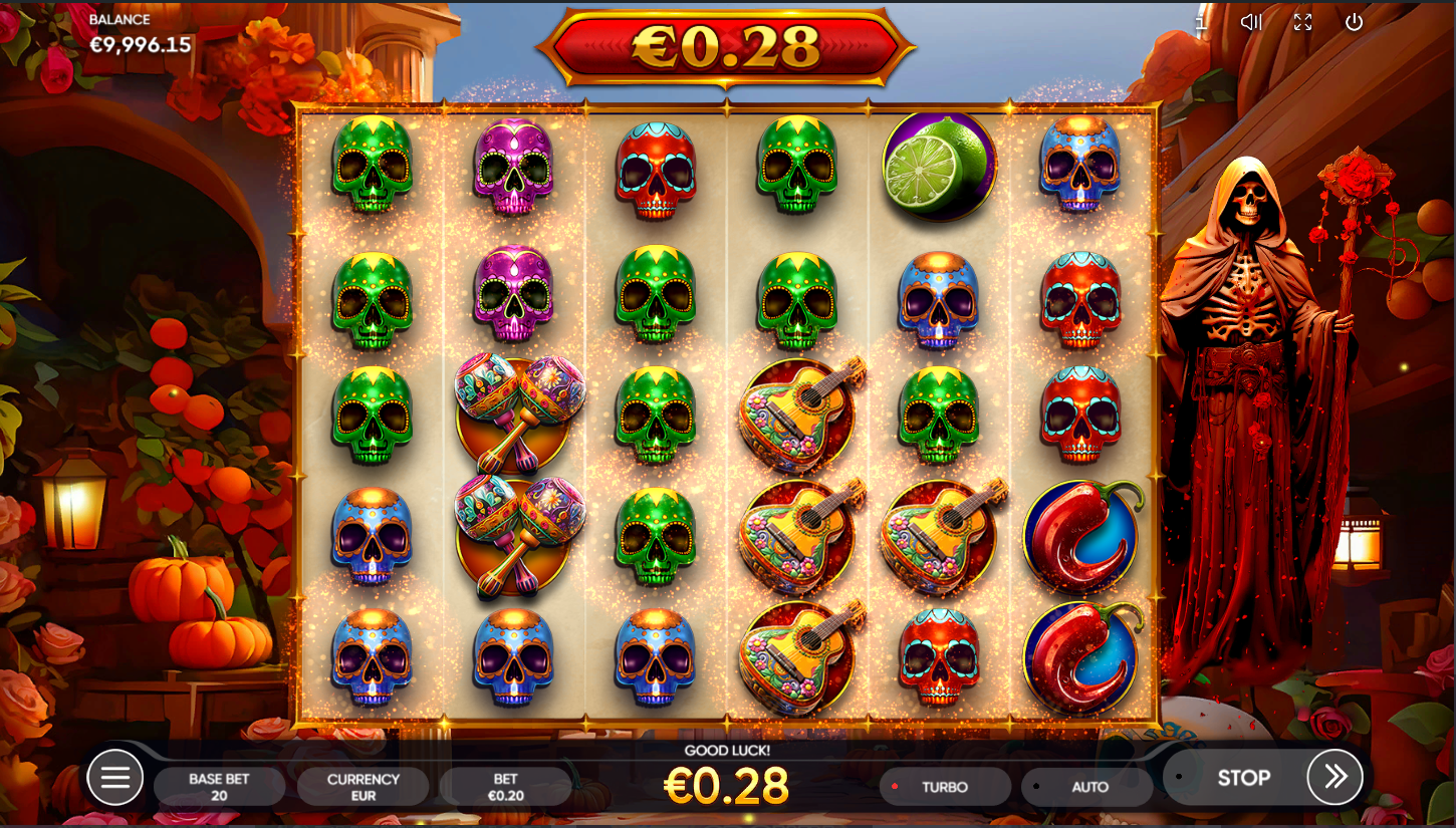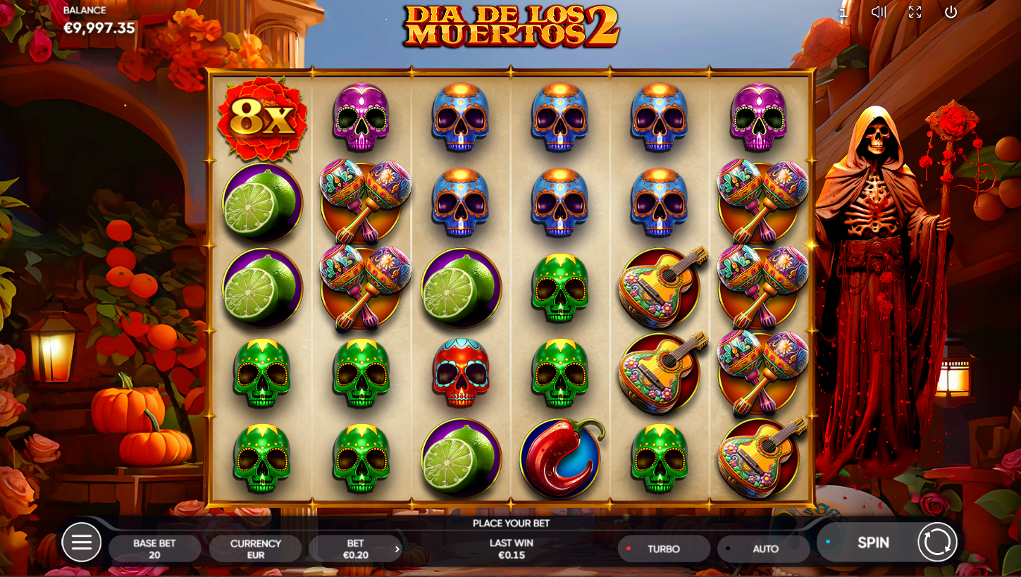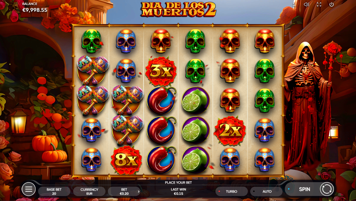 Dia De Los Muertos 2, od Endorphine, vodi te u svijet meksičkog festivala života i boja! Na 6 kolutova i 5 redova, simboli eksplodiraju u kaskadama i donose nove šanse za dobitak. Umjesto linija, kombinacije od 8+ simbola bilo gdje na kolutima donose nagrade. Svaki spin je vatromet boja, glazbe i adrenalina. Ovdje se slavi život, i tvoji dobici!