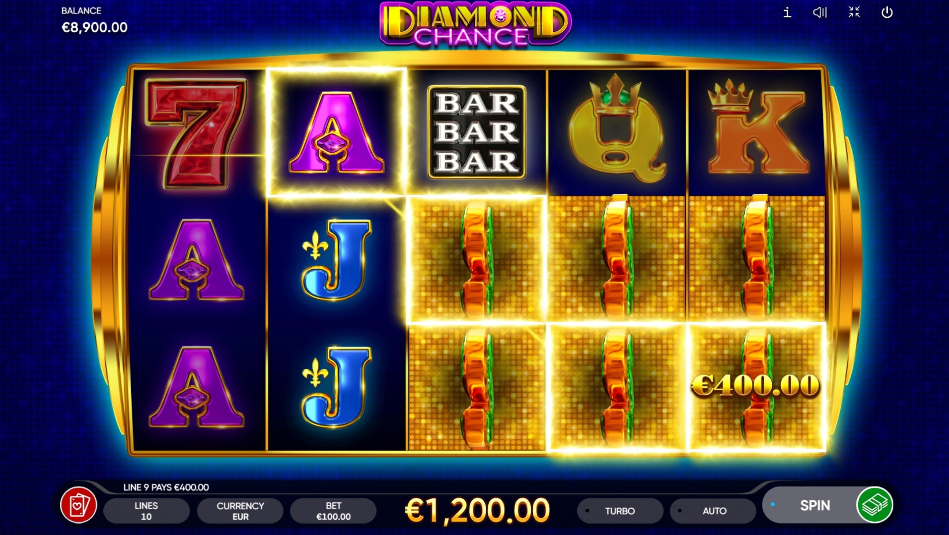 Gameplay slota Diamond Chance dinamičan je i jednostavan za sve vrste igrača. Odvija se u 5x3 gridu, a sadrži 10 isplatnih linija što se računaju s lijeva na desno. U stvaranju isplatnih linija pomaže Wild američkog dolara koji mijenja sve simbole u lovu na dobitke.