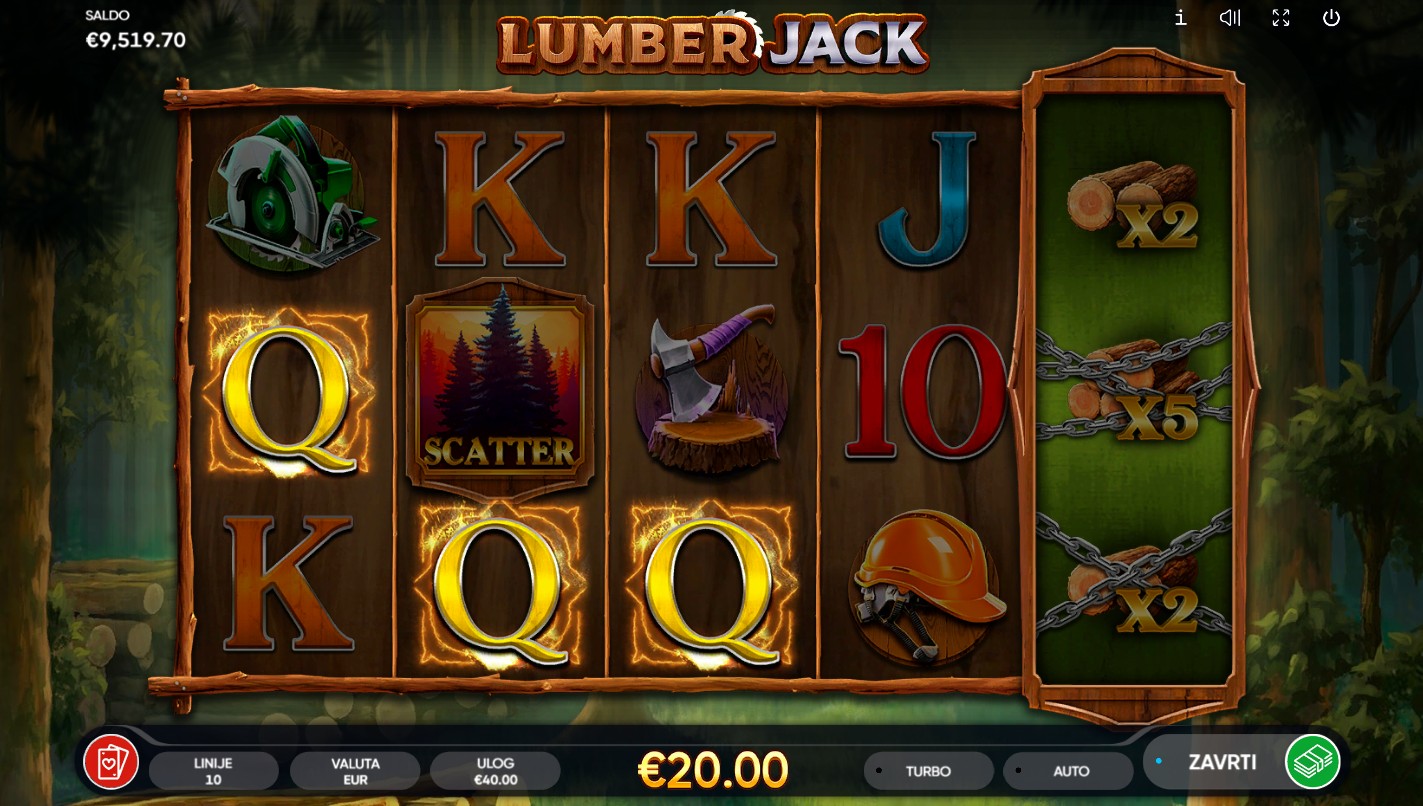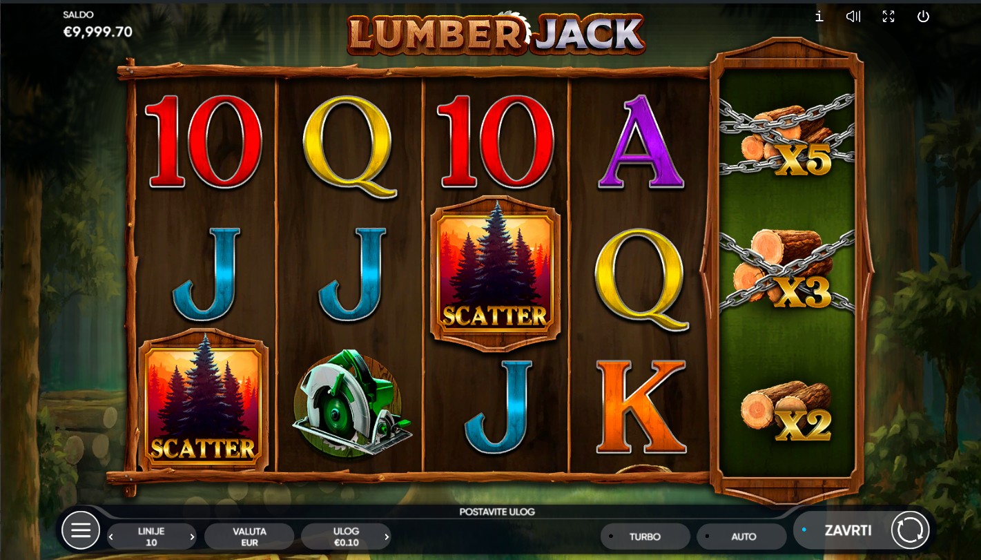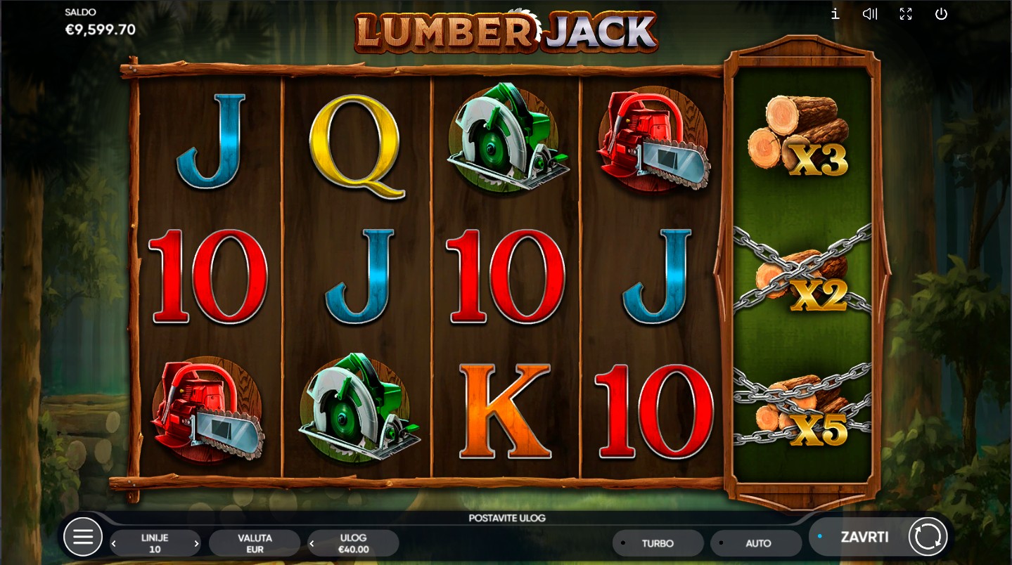 Zakorači u šumsko carstvo s Lumber Jack, slot igrom providera Endorphina koja te vodi u uzbudljivu avanturu među drvećem i drvosječama! Svaki spin skriva prilike za dobitke i otkrivanje skrivenih blaga u šumi. Igra nudi besplatne vrtnje kada se pojavi 3 ili više Scatter simbola, a dobitke možeš dodatno povećati uz množitelje do 20x uloga. Nakon svakog dobitnog spina dostupna je i igra rizika, gdje možeš pokušati udvostručiti svoj dobitak. Svaka vrtnja donosi novu priliku za zabavu i šumsku avanturu prepuna napetosti i nagrada.