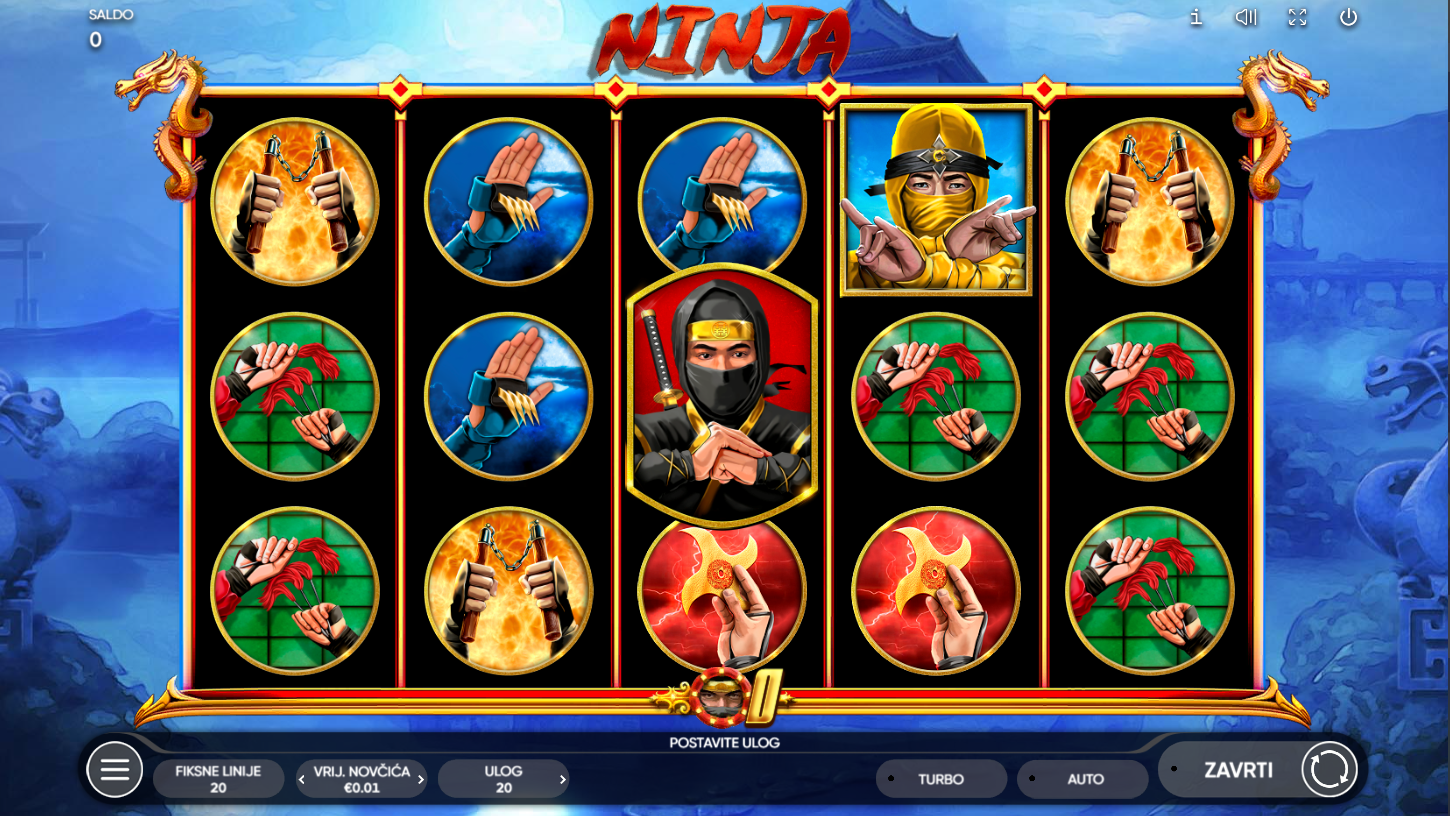 Ninja i Endorphina tevode u svijet tajanstvenih ratnika i skrivenih nagrada na 5 bubnjeva i 20 linija. Tamna atmosfera i orijentalna tematika stvaraju doživljaj prave ninja avanture. Wild i Scatter simboli u obliku Crnog Ninje otvaraju vrata bonusima i većim dobicima. Ako voliš akciju, napetost i malo mistike, ovo je slot za tebe.