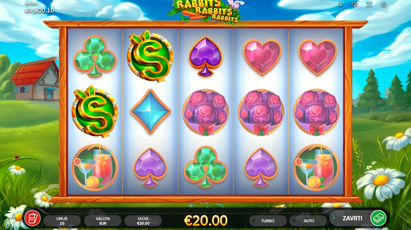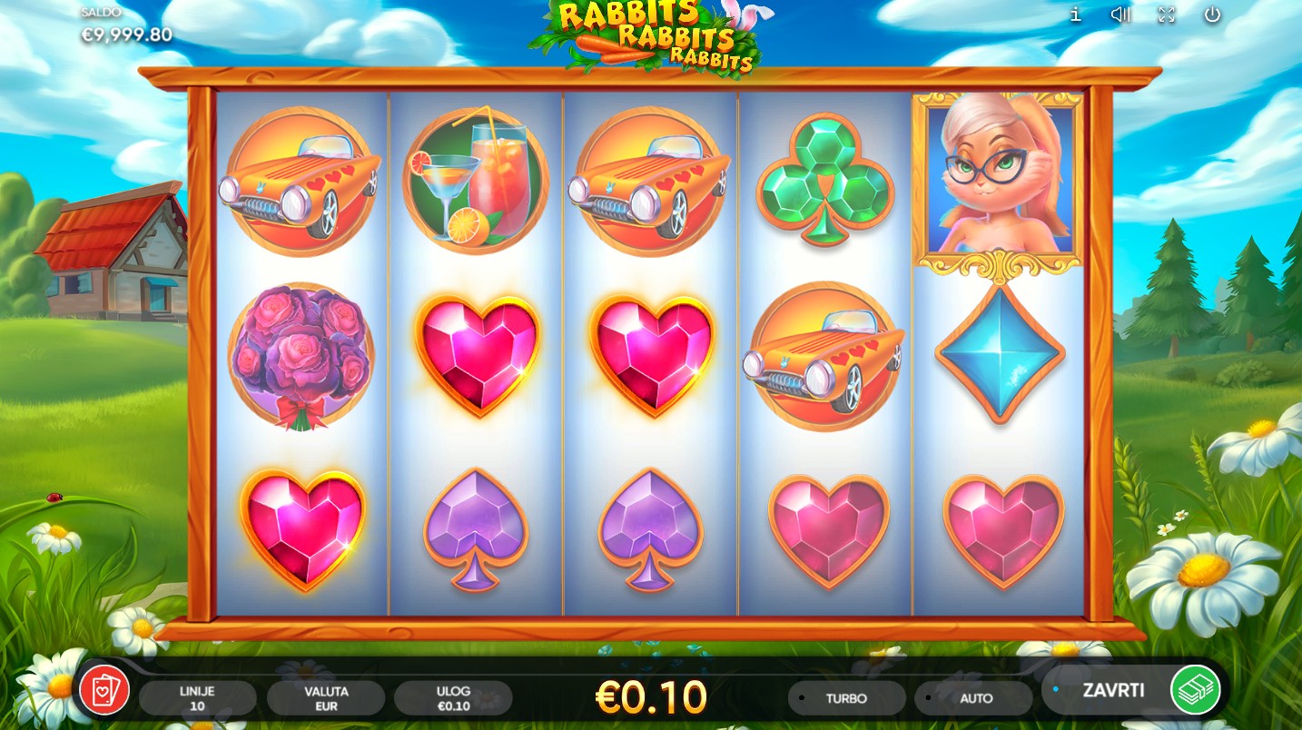 Rabbits se igra na 5 valjaka i 3 reda s 10 fiksnih isplatnih linija. Dobitne kombinacije broje se slijeva nadesno, a cilj je složiti što više identičnih simbola na aktivnim linijama. Bonus igra Zekino vjenčanje aktivira se prema pravilima igre i pretvara mrežu u 5x3, gdje možeš osvojiti do 100x uloga, dok svaki dobitni spin omogućuje aktiviranje igre rizika i pokušaj udvostručenja dobitka. Svaka vrtnja pruža veselu i uzbudljivu avanturu punu iznenađenja