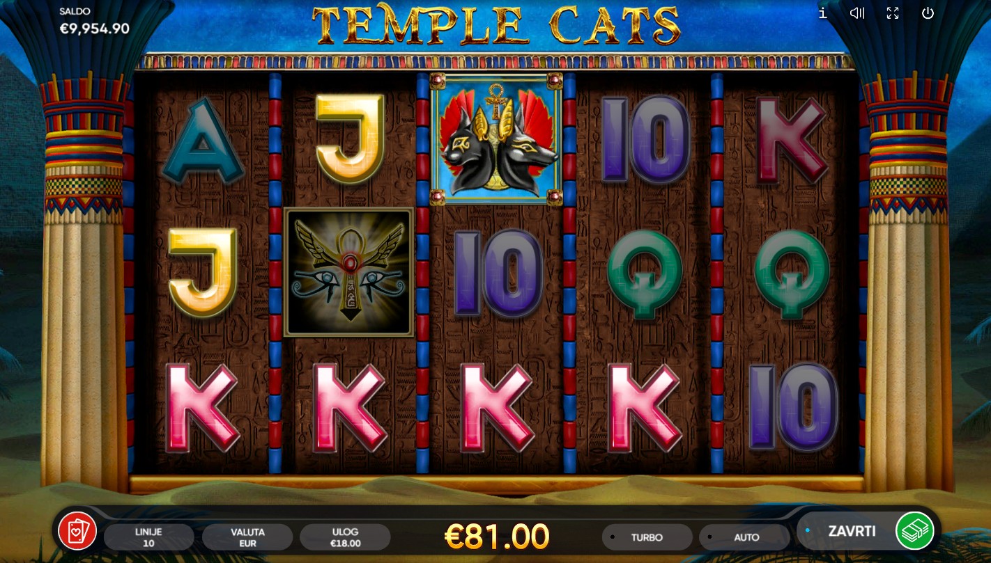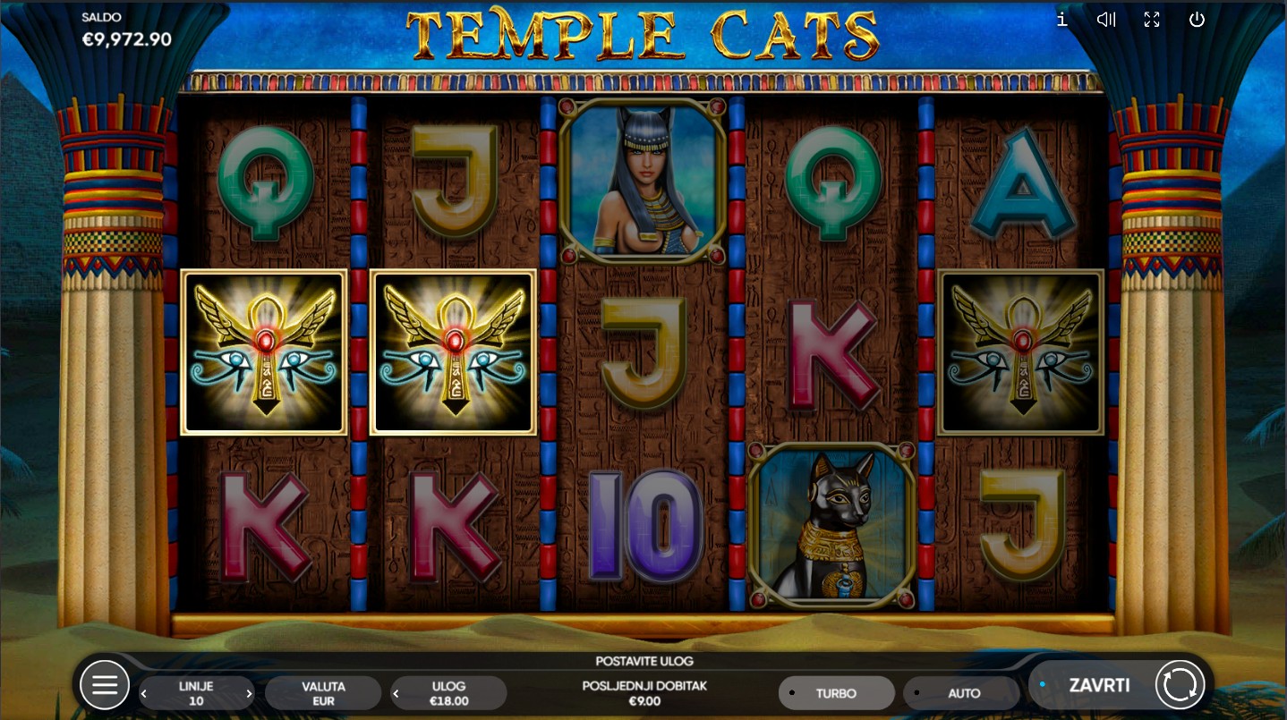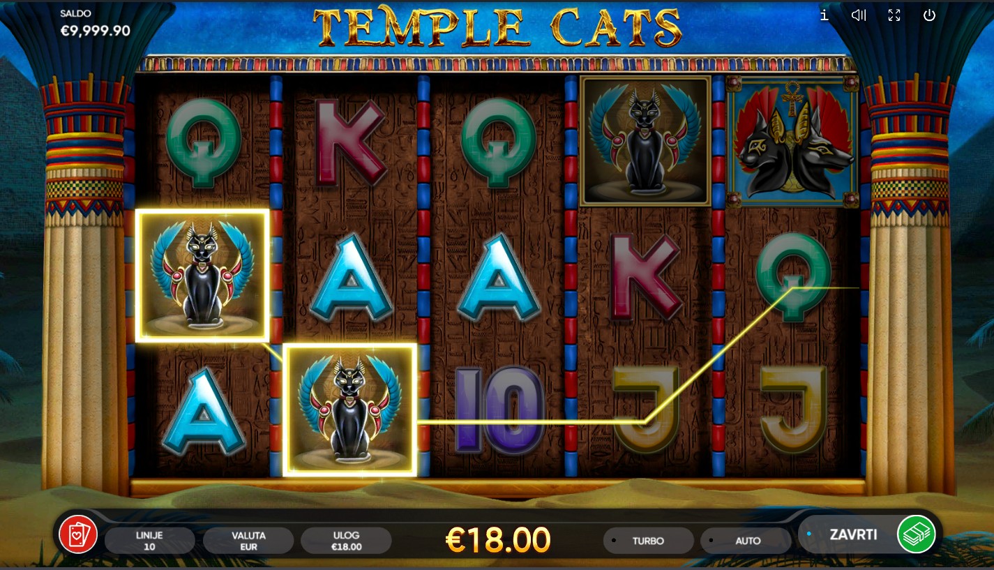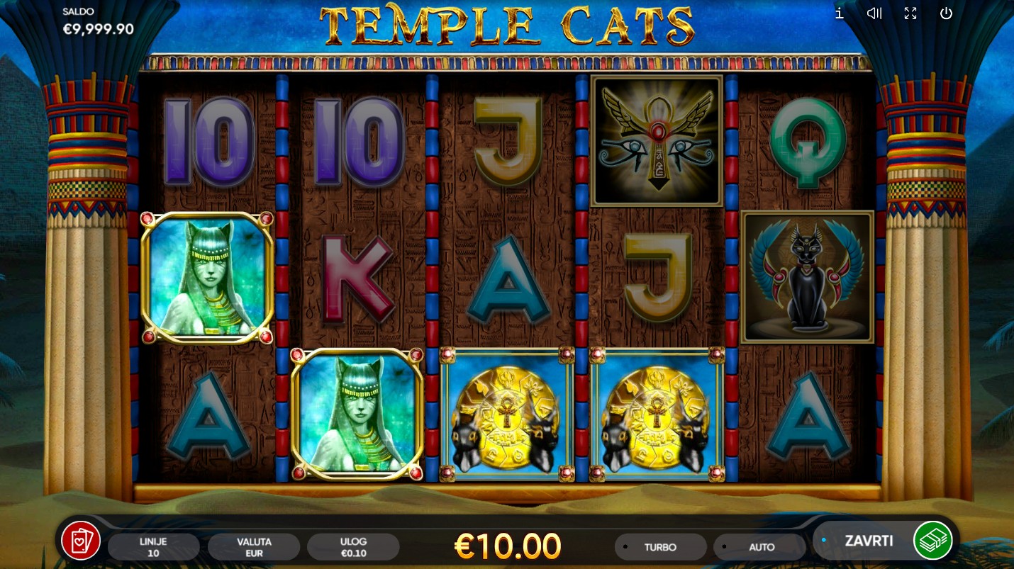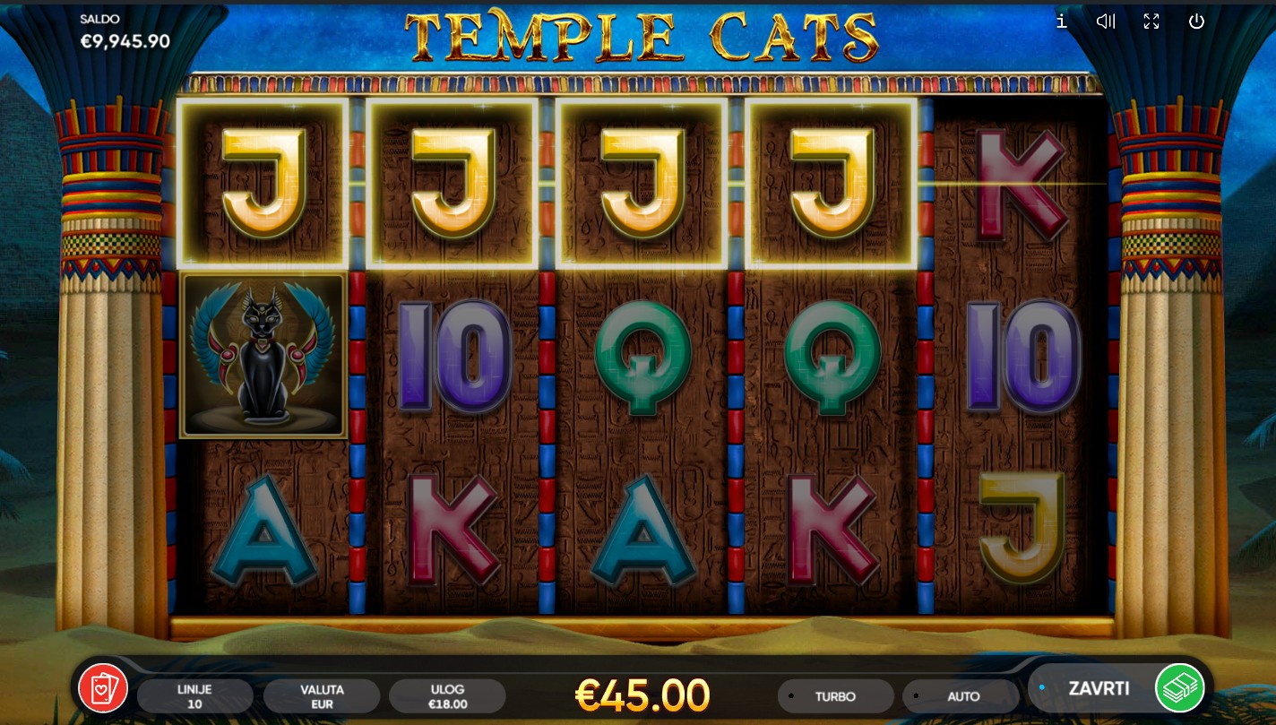 Zakorači u mistični hram uz Temple Cats, slot igru providera Endorphina koja te vodi u uzbudljivu avanturu s hrabrim i lukavim mačkama! Wild simboli pomažu u stvaranju dobitnih kombinacija, dok besplatne igre s proširujućim simbolima donose dodatne prilike za velike dobitke. 3 ili više Scatter simbola aktiviraju rundu 10 besplatnih igara, a dodatnu napetost unosi igra rizika, gdje možeš pokušati udvostručiti osvojeni dobitak. Svaka vrtnja pruža novu priliku za avanturu u hramu prepunom nagrada i misterioznih simbola.