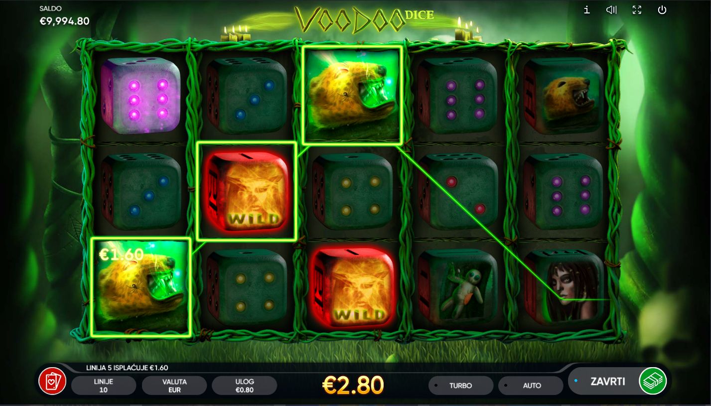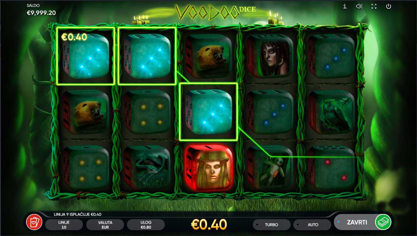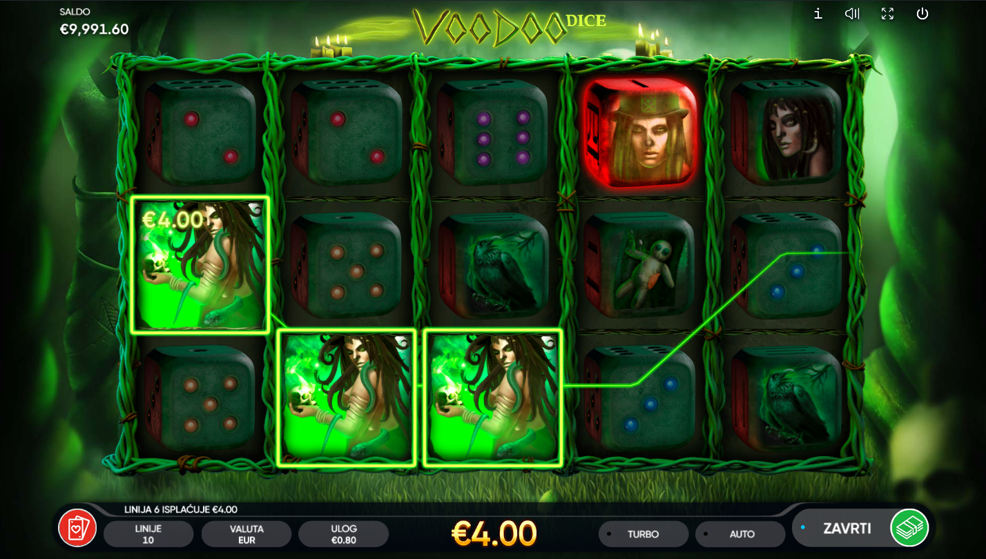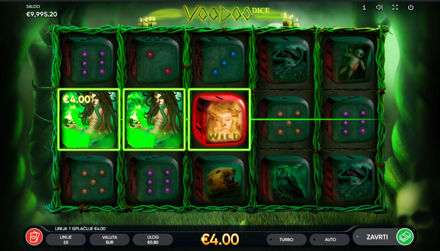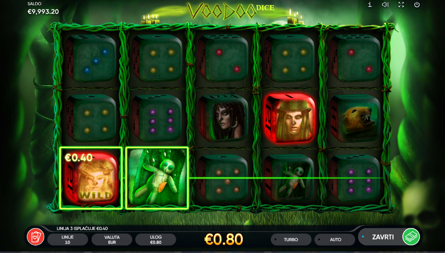 Voodoo Dice od Endorphina donosi mistični svijet tajanstvenih rituala i simbola. Ova igra kombinira atmosferu mračnih obreda i uzbudljivu mehaniku. Umjesto klasičnih simbola, na kolutima se pojavljuju kocke s mističnim uzorcima. Jezovita glazba i detaljna grafika stvaraju osjećaj prave mistične energije!