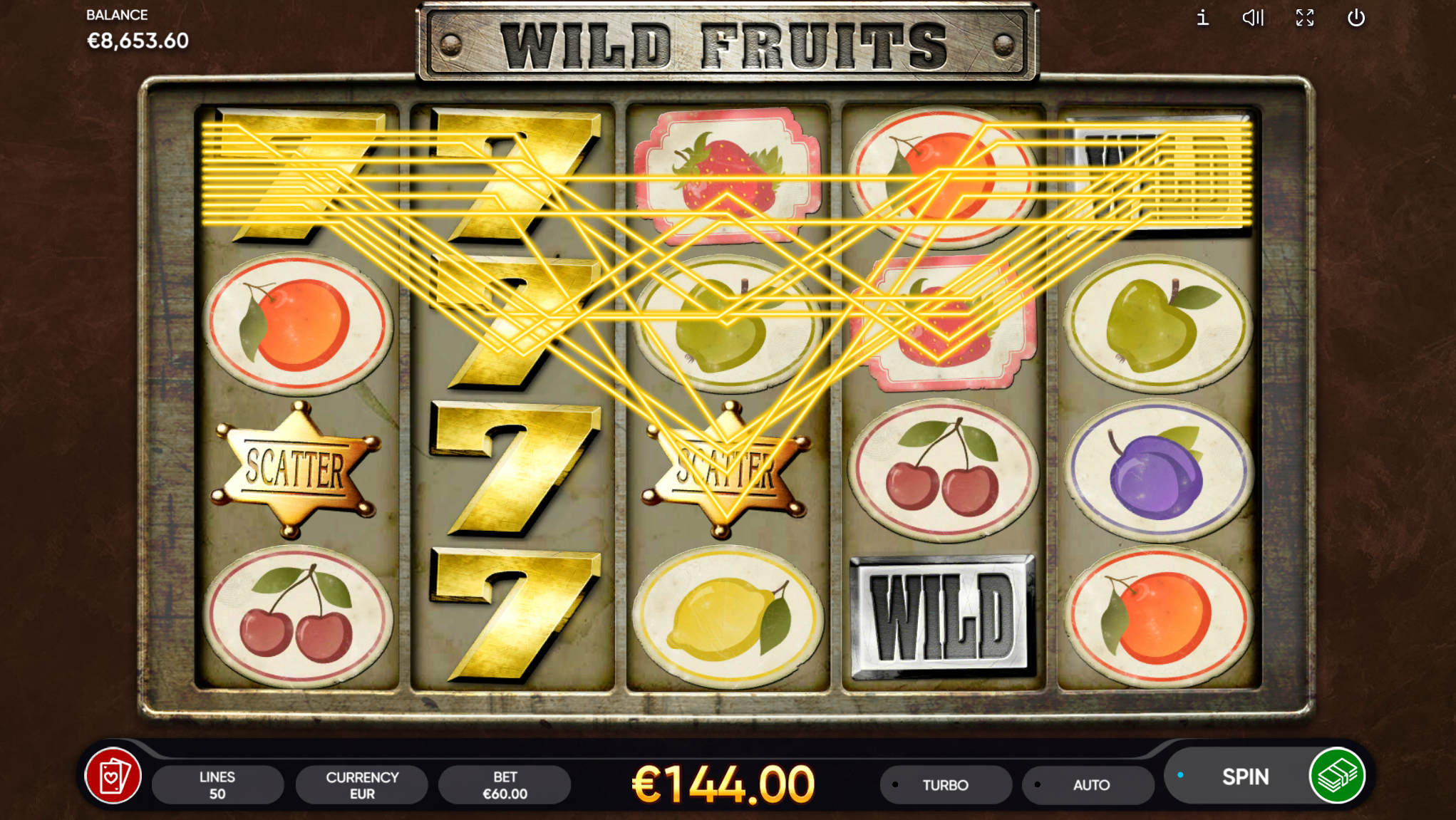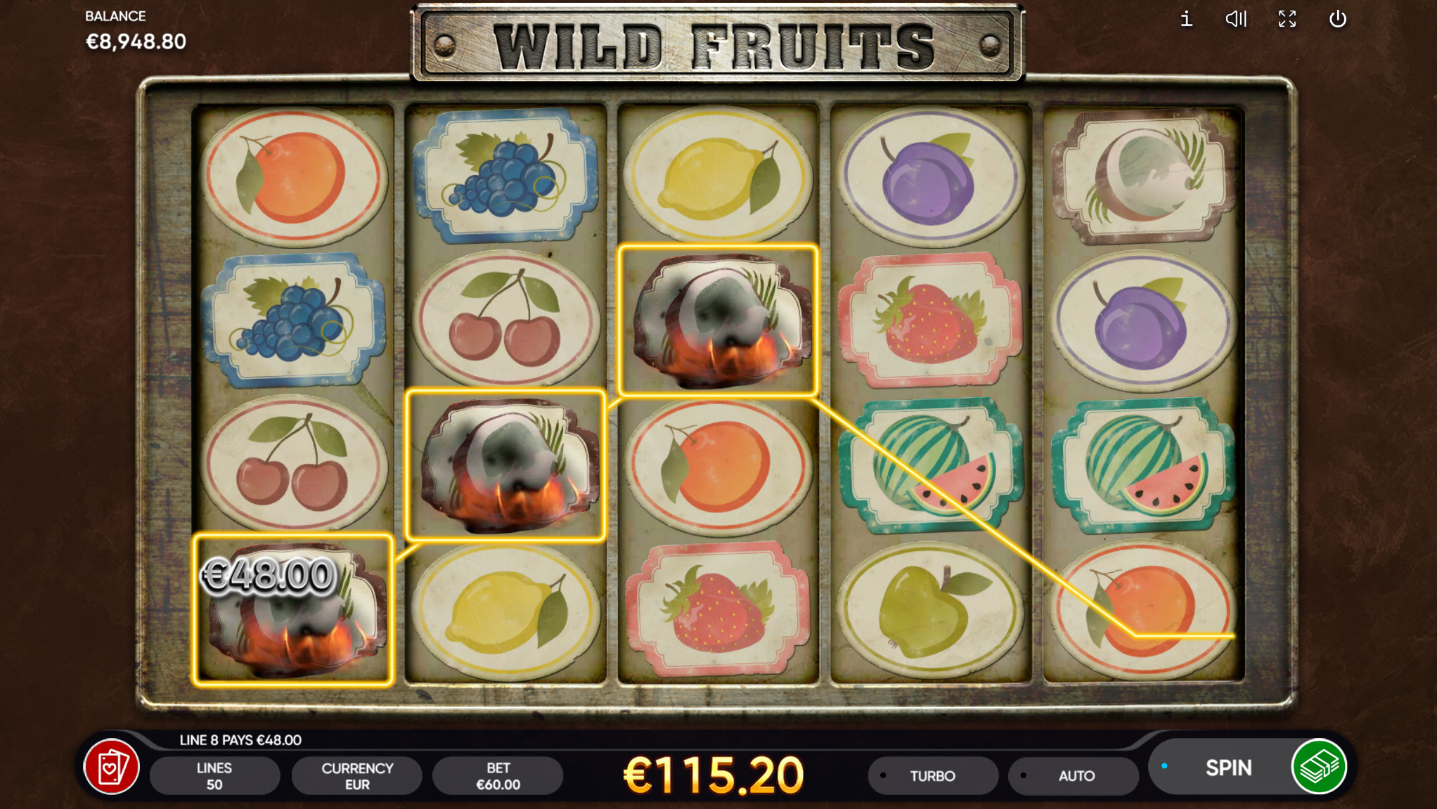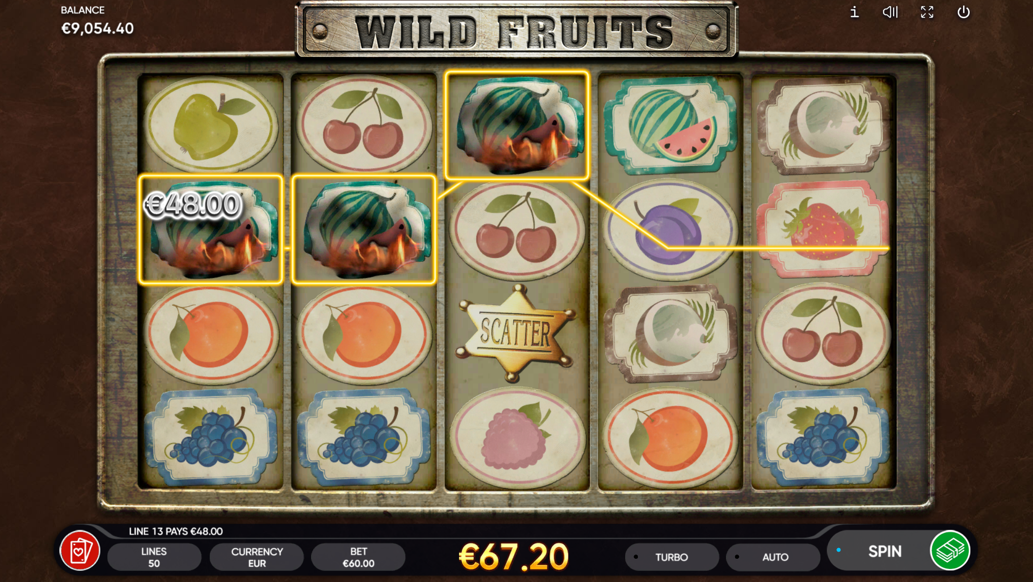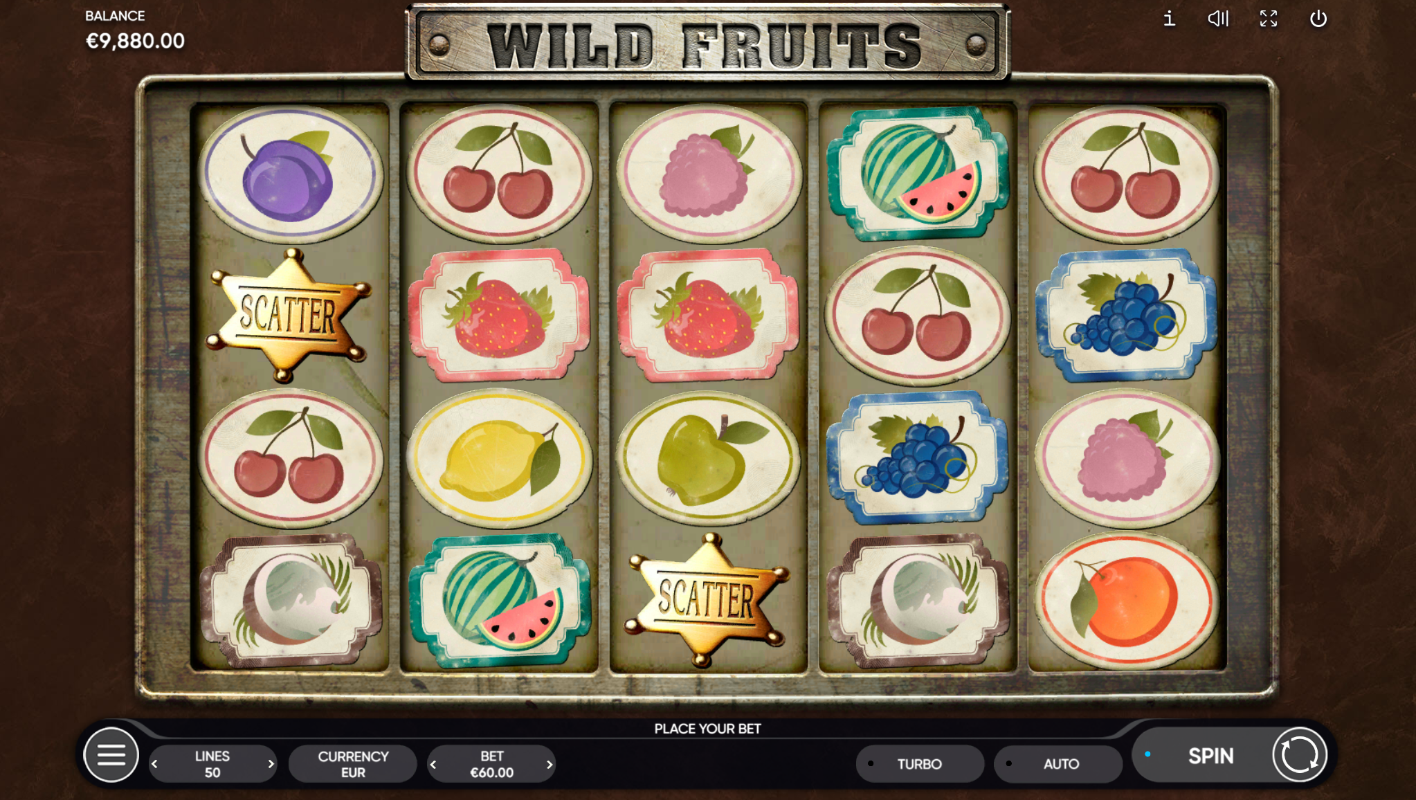 Wild Fruits vodi svoje igrače kroz zabavnu avanturu obogaćenu pažljivo ilustriranim voćnim simbolima uz dodatak simbolike divljeg zapada. Super jednostavan način igranja omogučiti će igračima dugotrajnu zabavu, a kako bi ona također bila i uzbudljiva pobrinuti će se Wild Fruits wild simboli koji će tvoje dobitke pretvoriti u veće i učestalije. Ako voliš igre koje ti pružaju izvrstan omjer rizika i dobitaka došao si na pravo mjesto! Prepusti se zabavi i užitku te sa sobom odnesi velike dobitke!