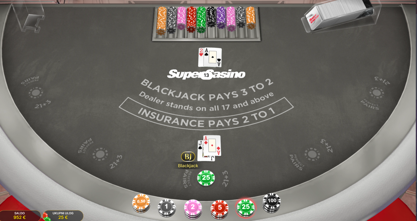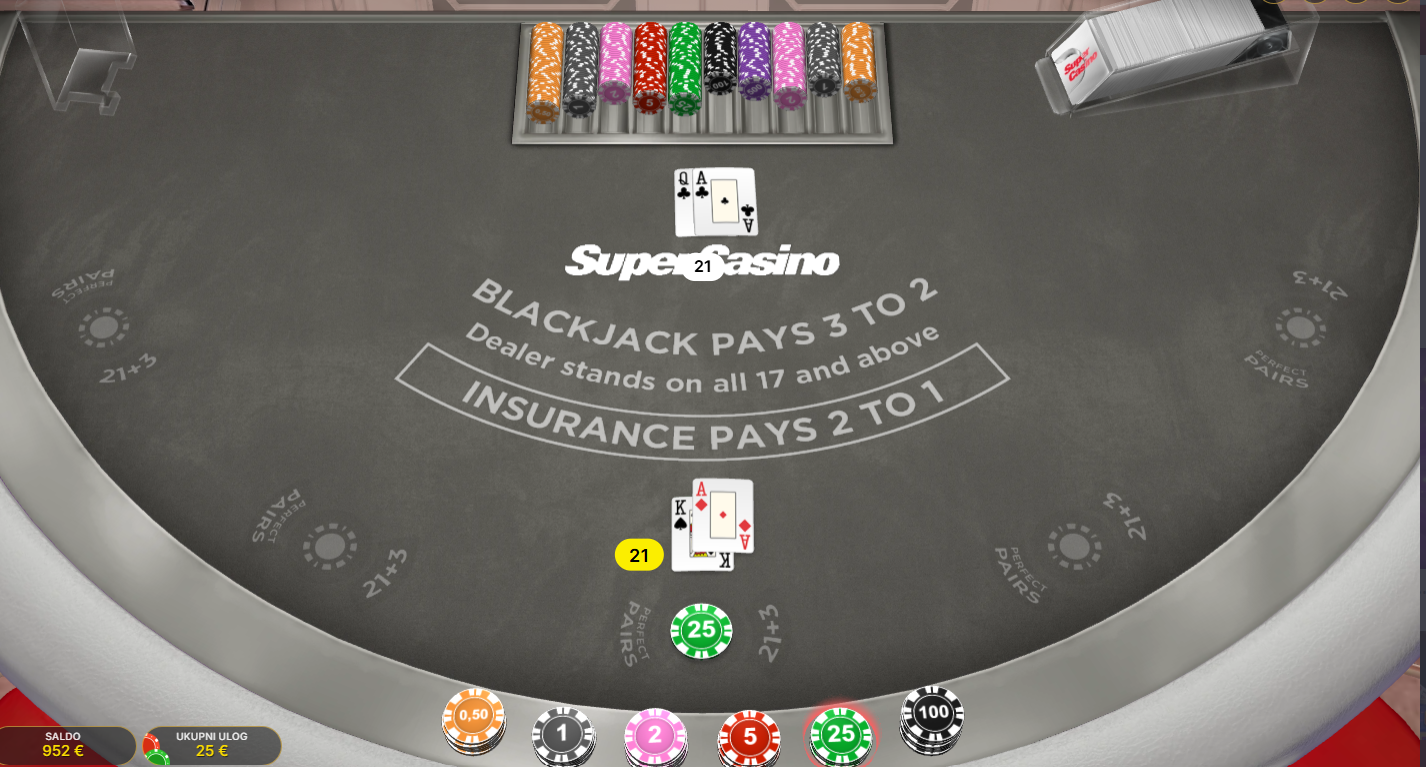 U ovoj igrici igra se protiv računalnog dilera. Cilj igre je skupiti vrijednost karata što bližu broju 21, ali bez da se prijeđe. Igra se s osam špilova karata, a dostupne su klasične opcije kao što su Još, Dosta, Udvostruči, Podjela i Isplata.Moguće je i igrati dodatne opcije poput Perfect Pairs i 21+3. Opcija ,,Go live'' omogućuje prijelaz u live casino s pravim dilerom.