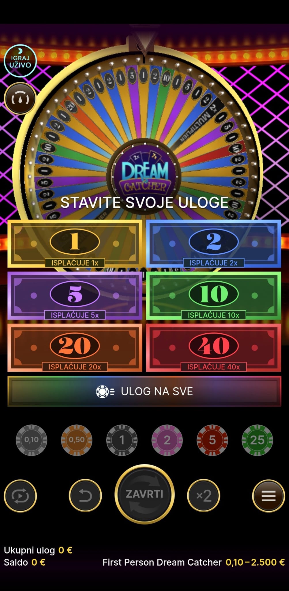 First Person Dream Catcher je virtualna verzija popularne igre uživo s kolutom sreće, koju donosi Evolution. Ova igra nije slot, već vas stavlja izravno pred blistavi kotač s brojevima u impresivnom 3D okruženju. Dizajnirana je za jednostavno igranje i nudi transparentne rezultate temeljene na generatoru nasumičnih brojeva. A kada poželite još više akcije, uvijek možete jednim klikom preći na live verziju s pravim djeliteljem!