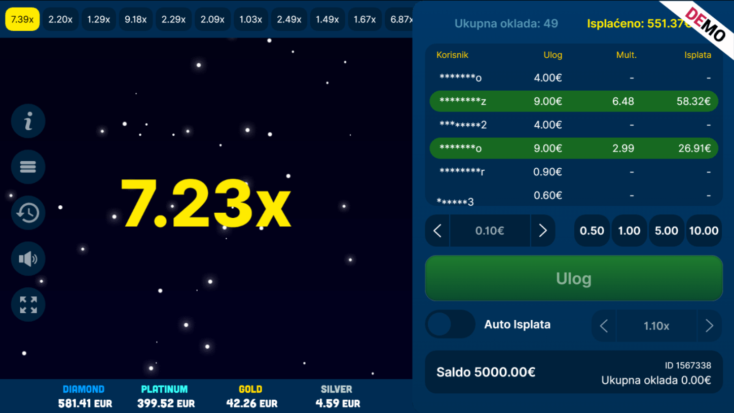 RTP iznosi oko 97%, što je standard za crash igre i omogućuje poštenu dugoročnu igru. Volatilnost je srednje visoka, pa se dobici kreću od manjih, sigurnih isplata do rijetkih, ali astronomskih multiplikatora.