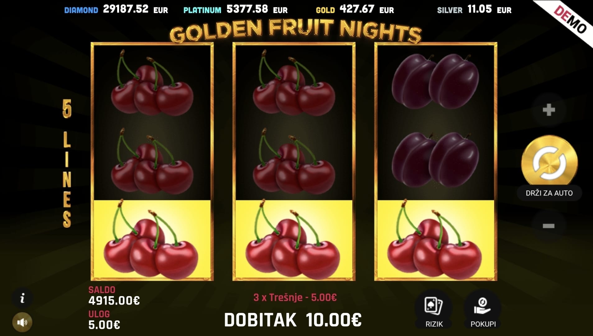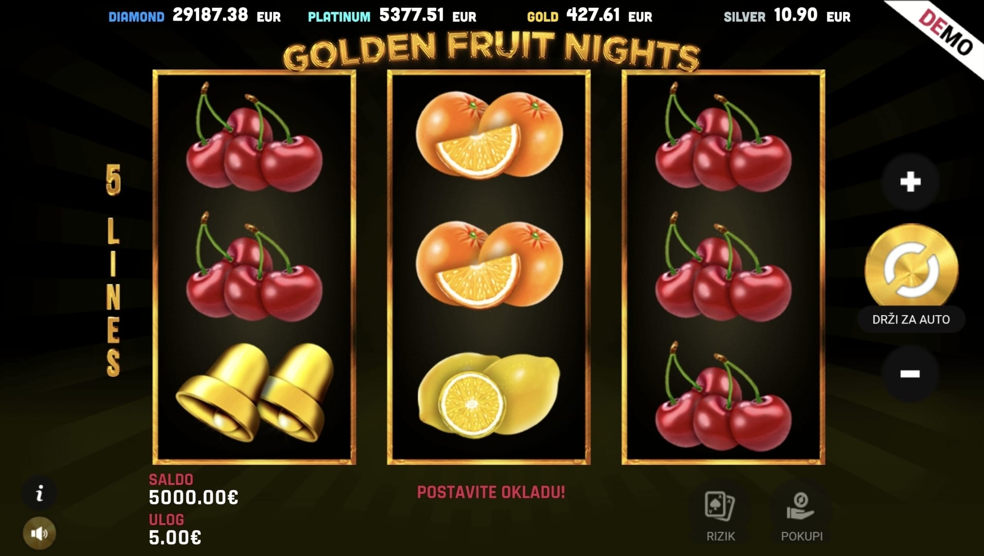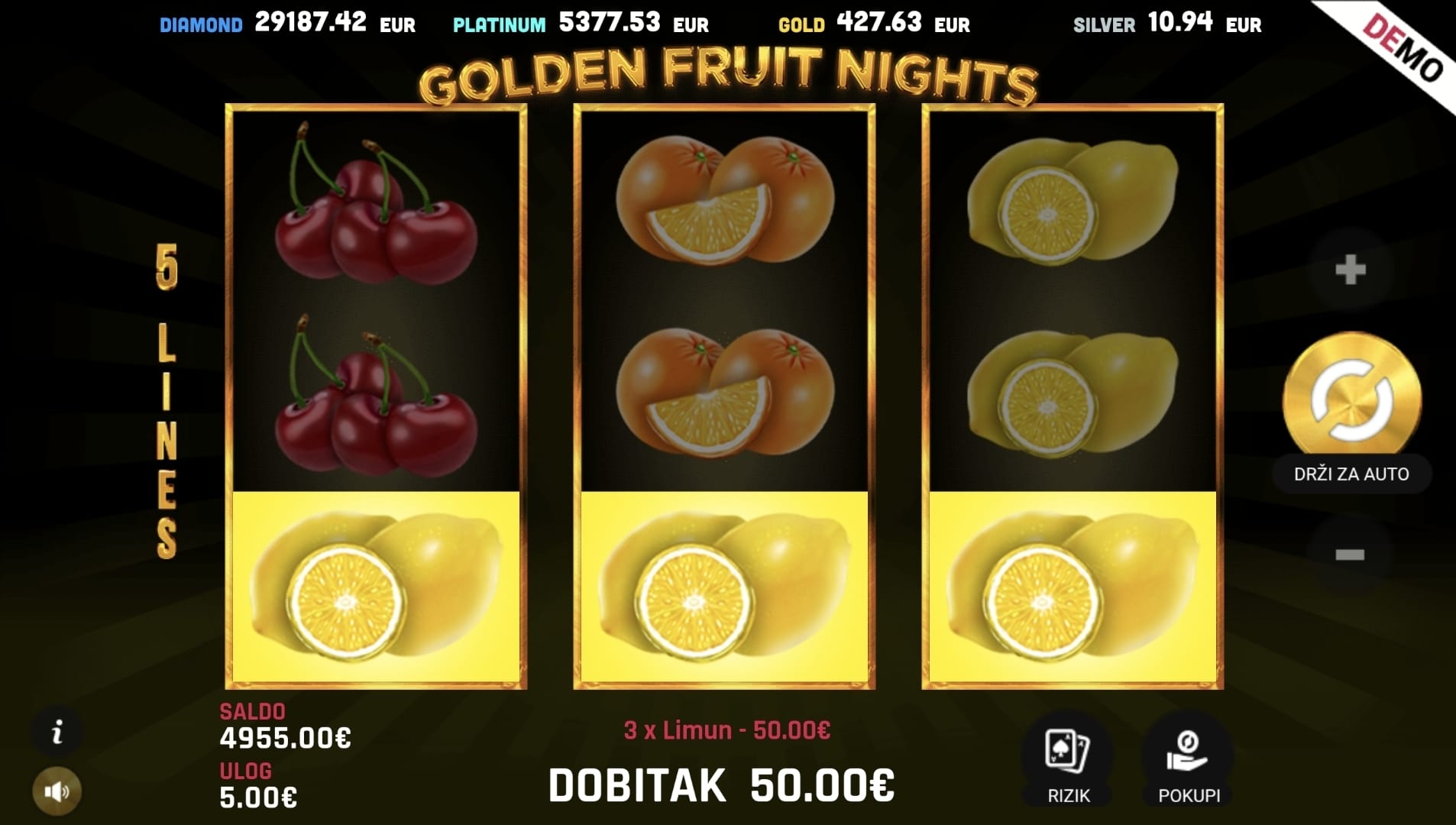 dobitne kombinacije. Iako je tema tradicionalno voćna, zlatni elementi i moderan dizajn daju joj premium osjećaj, a igra je izravno povezana s Evoninim popularnim