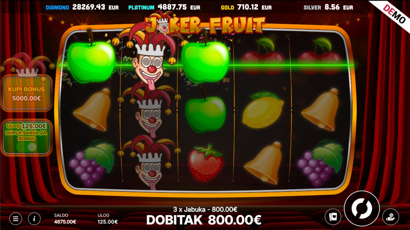 Joker Fruits ima RTP od oko 95%, što znači da pruža vrlo solidne šanse za dobitak tijekom igre. Volatilnost je srednja što povećava uzbuđenje jer igra može donijeti značajne dobitke, osobito tijekom bonus značajki. Idealna je za igrače koji vole dinamičnu s potencijalom za veće nagrade.