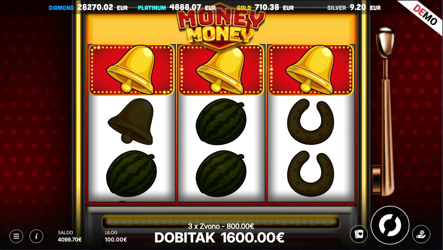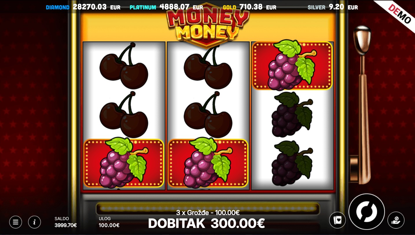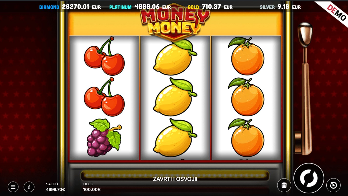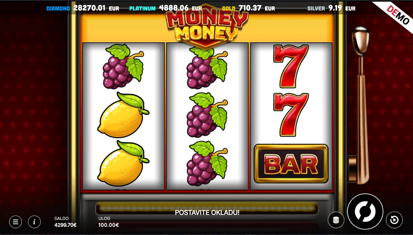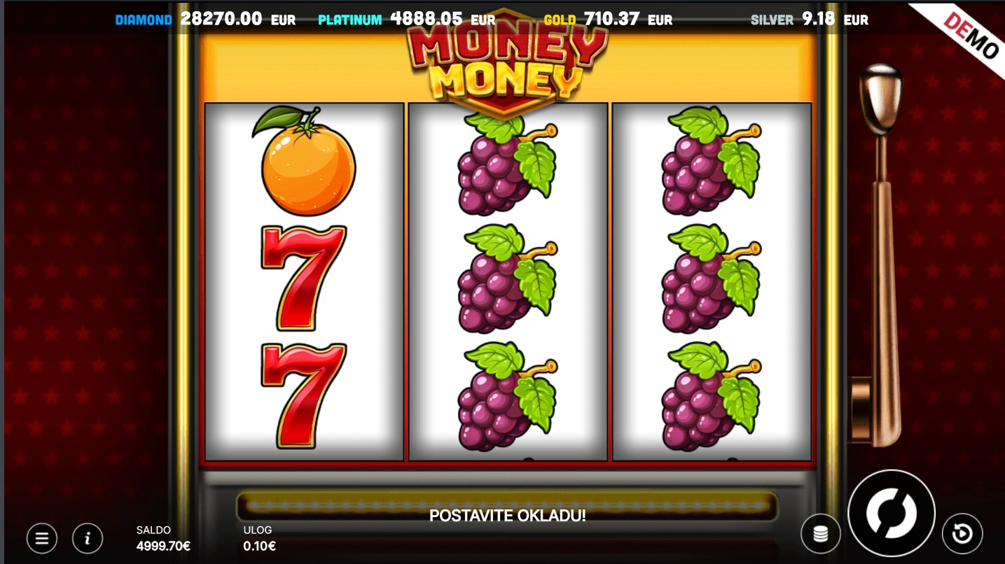 Money Money se igra na 3 valjka i 3 reda s 27 fiksnih isplatnih linija. Cilj igre je složiti iste simbole slijeva nadesno i ostvariti dobitke, dok Wild simboli zamjenjuju sve ostale simbole i pomažu u stvaranju novih dobitnih kombinacija. Svaka vrtnja donosi novu priliku za adrenalinsku zabavu, a igra rizika omogućuje ti da pokušaš udvostručiti svoj dobitak točnim odabirom boje karte. Svaki spin donosi osjećaj prave avanture i šansu za bogate nagrade.