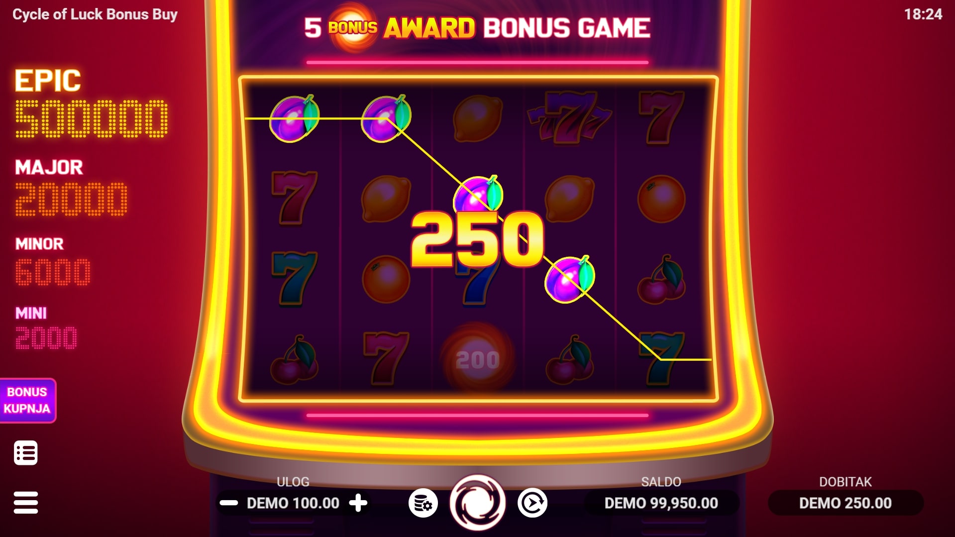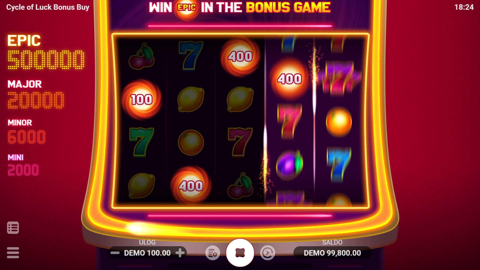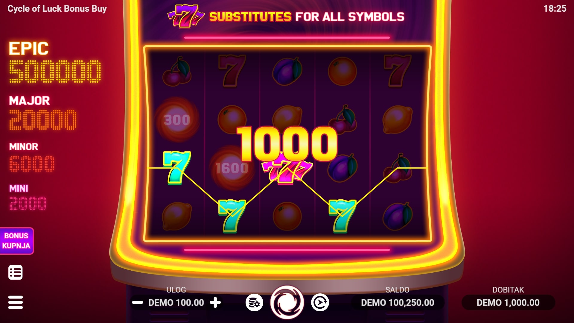 Cycle of Luck Bonus Buy klasična je slot igra koja već poznatom svijetom voća dodaje svoj 'twist'. U igri najviše isplaćuju sedmice, dok poseban komplet ljubičastih sedmica služi kao zamjena za druge simbole u potrazi za isplatnim linijama. Uz to je moguće nanizati simbole Bonusa koji aktiviraju Bonus igru unutar koje se može pojaviti do četiri dodatna reda. Zaigraj Cycle of Luck Bonus Buy te osvoji slasne nagrade!