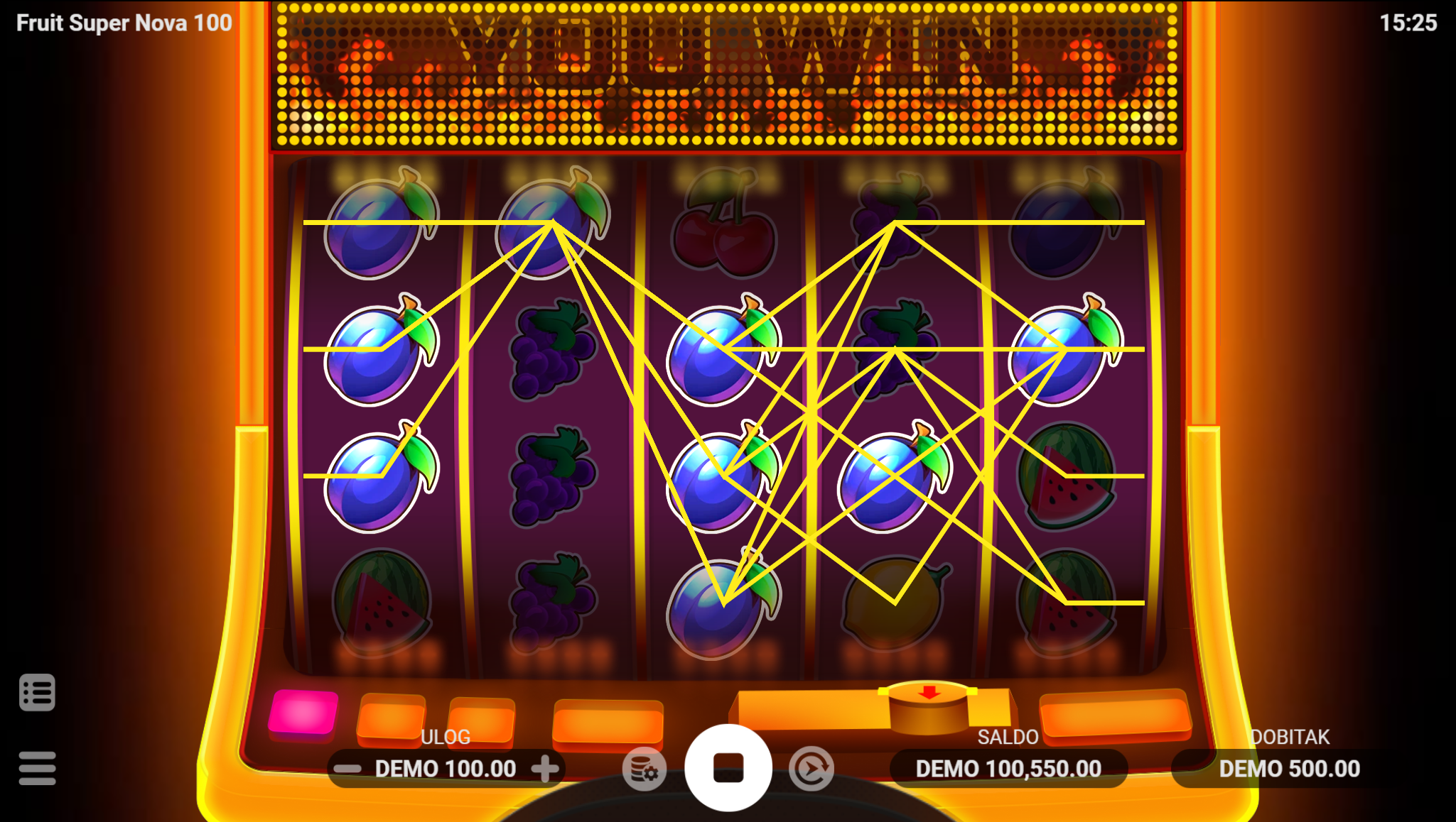 Ljubitelj si klasičnih i jednostavnih voćih slotova? Na pravom si mjestu jer Fruit Super Nova 100 pruža sve to, a i mnogo više. Primamljivo ilustrirano voće jednostavnog dizajna, kao i način igranja učiniti će dozu zabave i zanimacije nedostižnom! Kako uzbuđenju tu nebi bio kraj, pobrinuti će se simbol zlatne jabuke i igranje pretvoriti u super uzbudljivo te bogato po pitanju dobitaka! Kao jedan od najpopularnijih slotova, Fruit Super Nova 100 odličan je izbor za sve igrače koji vole izvrstan omjer rizika i dobitaka.