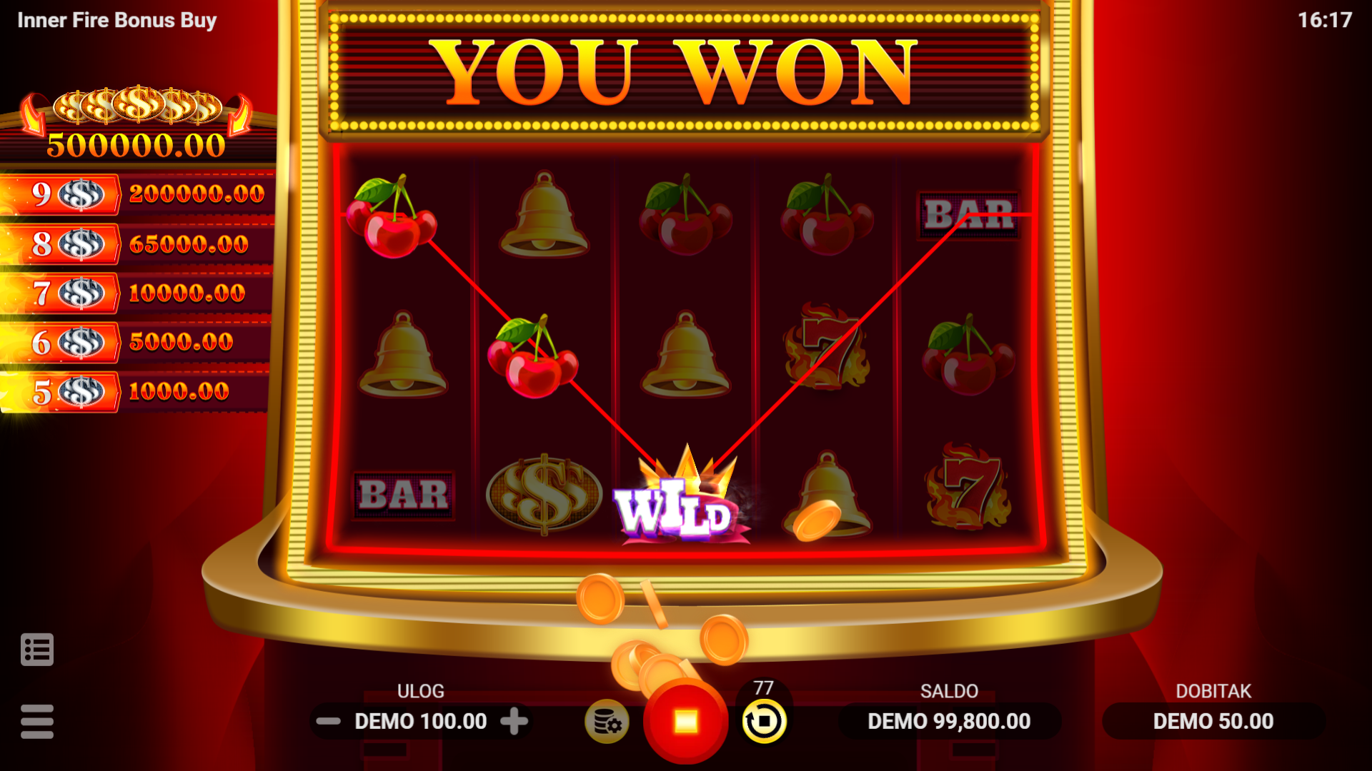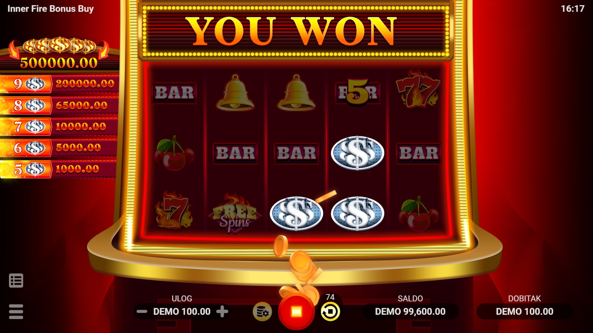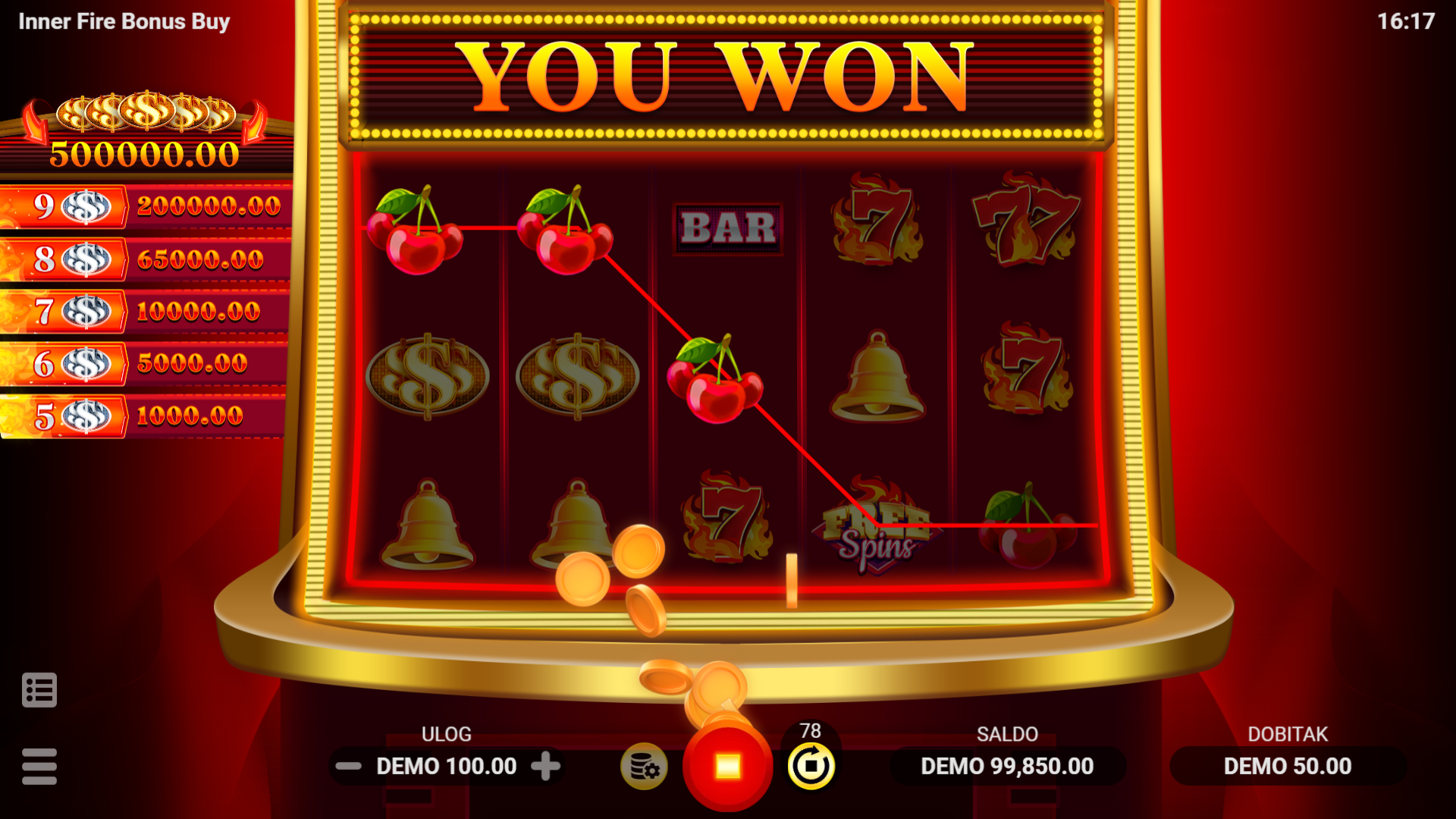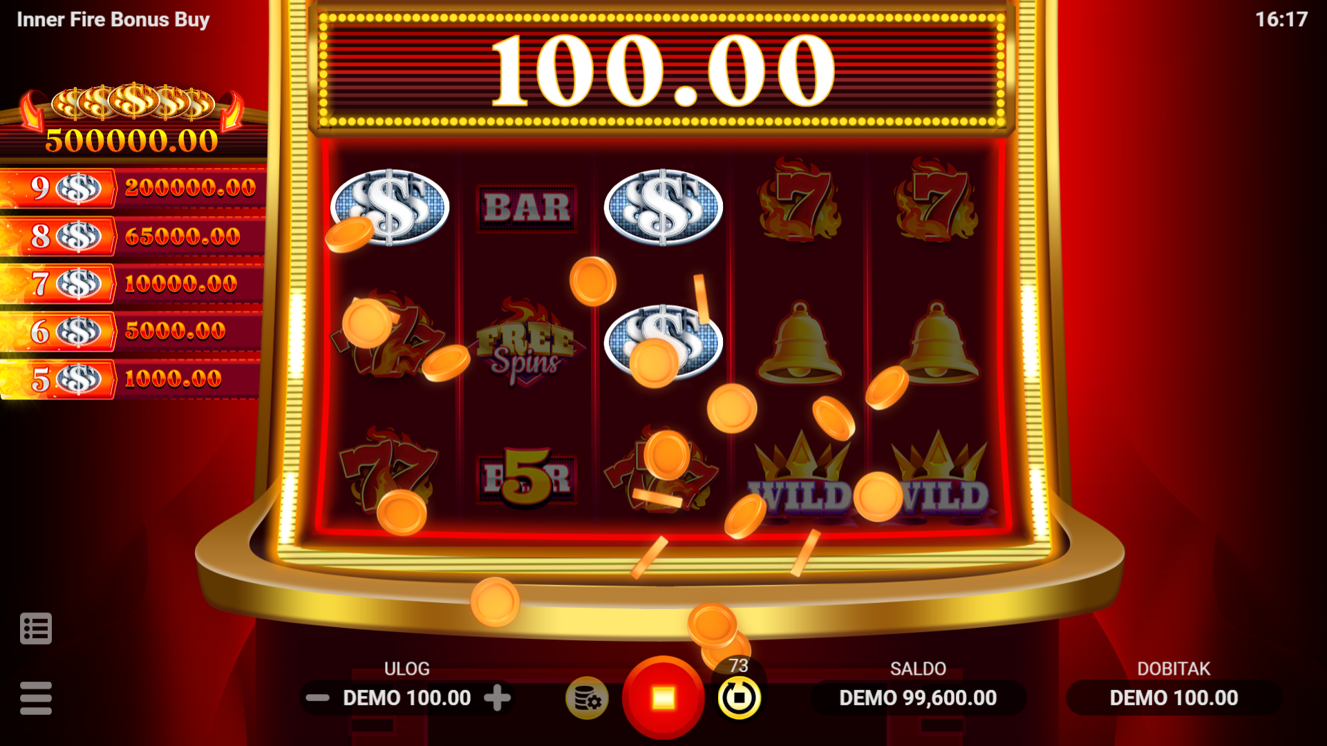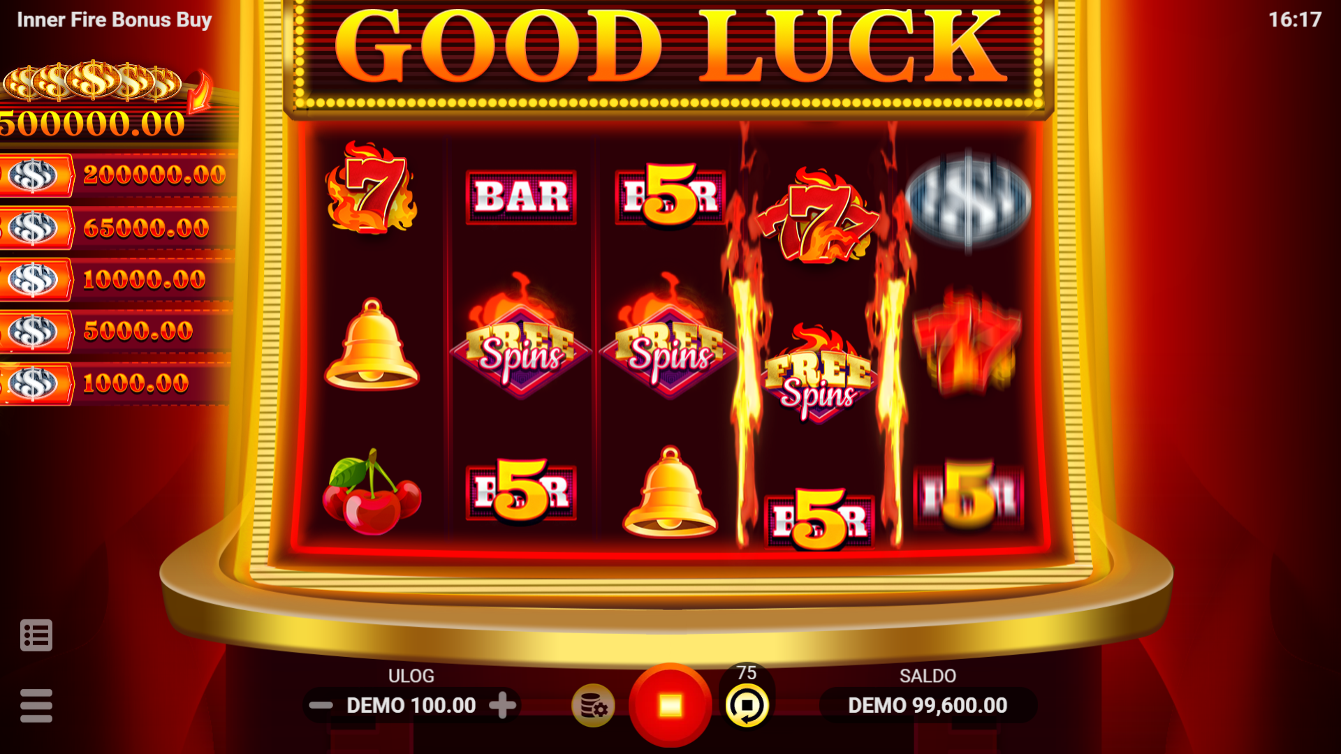 Inner Fire Bonus Buy nudi jednostavan, ali zabavan gameplay s mnoštvom mogućnosti za dobitak. Wild simbol pomaže u formiranju dobitnih kombinacija, dok Scatter simboli pokreću 10 Free Spins kada se pojave na određenim valjcima. U Free Spins režimu, svi dobici, uključujući i vatrene nagrade, se udvostručuju. Silver simboli mogu donijeti velike nagrade, do čak 2000x ulog, dok 5 Gold simbola donosi Legendaran dobitak od 5000x ulog. Igrači mogu koristiti značajku Bonus Kupnja za trenutačnu aktivaciju Free Spins za 30x ukupnog uloga, što povećava šanse za velike dobitke!